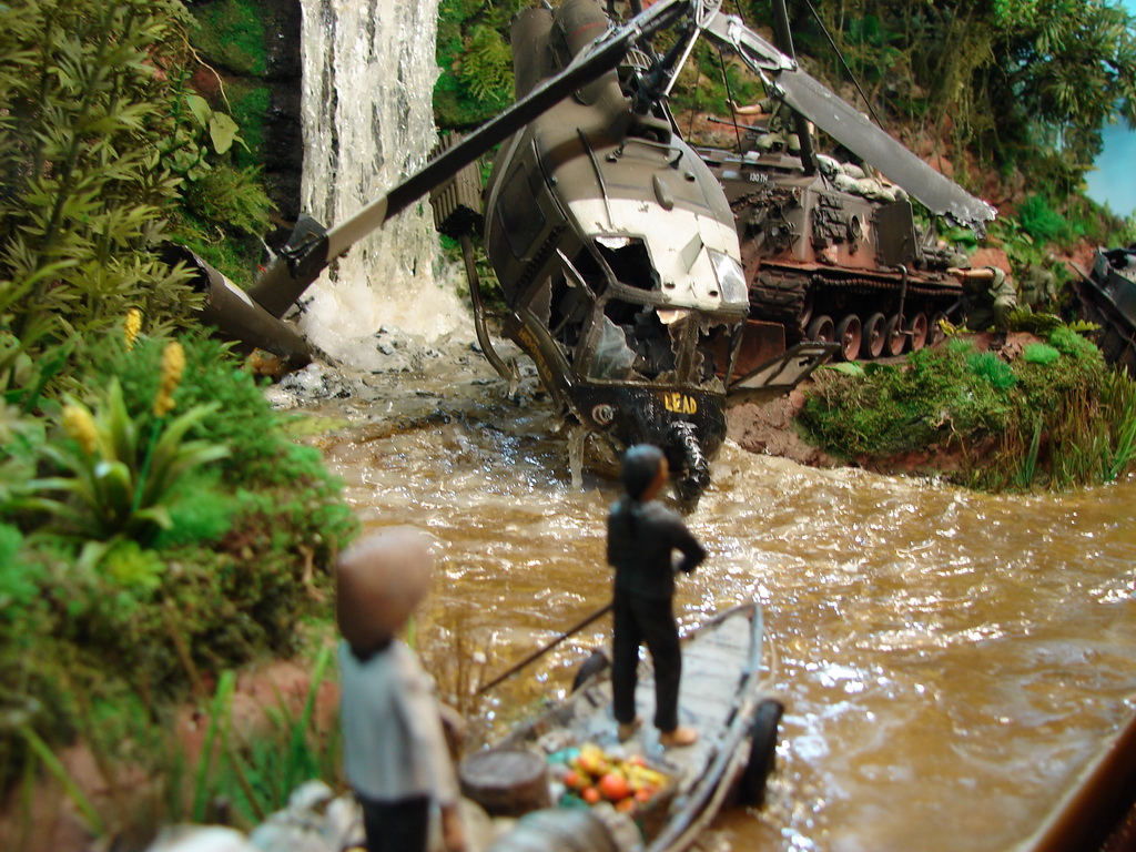 Работы по Вьетнаму меня всегда привлекали своими цветами.В них можно оттянуться по полной.Тут и ярко сочные джунгли,водопады и мутные воды Меконга...)Посмотрев на полку,что у меня имеется из техники и фигур на эту тему,принял решение создать вот такую диорамку.)Диорама представляет собой "сборную солянку" .Легенда такова:Вертолет,выполняя полет,обнаружил одиночную цель-ПТ-76.Вступил с ним в бой,но ответным огнем из ДШК,был сбит и упал неподалеку.Для эвакуации пилотов,была направлена на место падения,бронегруппа.