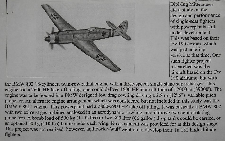 "Альтернатива (эскизный проект не принят): 1 х BMW Р8011 взлетной мощностью 2800 - 2900 л.с.; здесь речь идет о BMW 802 с двумя турбонагнетателями и двумя соосными воздушными винтами изменяемого шага."