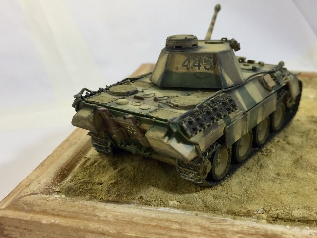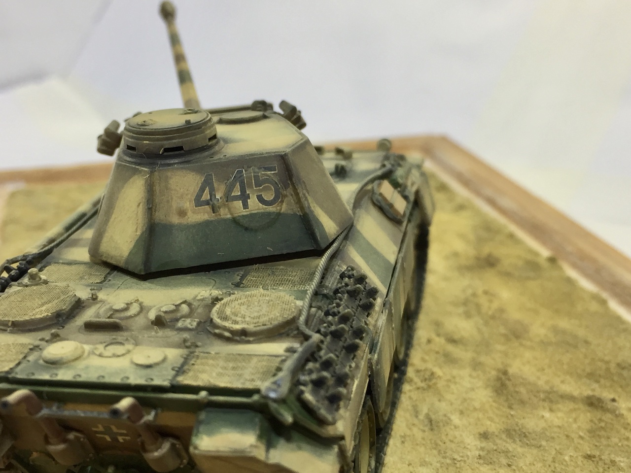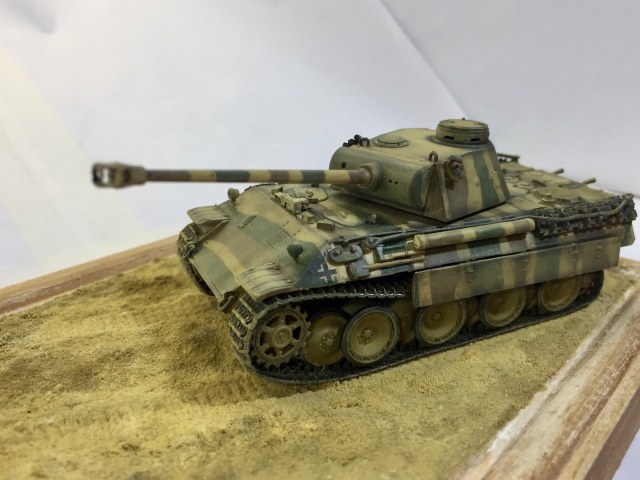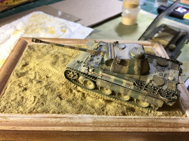 После чего, подумал - ох бы эту пантеру да в пески) Мне эта пантера представлялась где-то в песках. Тут же родилась идея - сделать подставочку с песочком. Правда уже потом, когда сделал подставку, выяснил, что пантеры в операциях в африке не участвовали. Ну и ладно. Сказано - сделано.Взял рамку дерев. для фотографий, размер уже не вспомню, самую маленькую, под 72 масштаб, купил алебастр, клей пва, соду.Залил, засохло, засыпал содой, покрасил. Понятное дело с промежуточной сушкой, но решил для себя, что больше не буду использовать соду в качестве имитации песка.