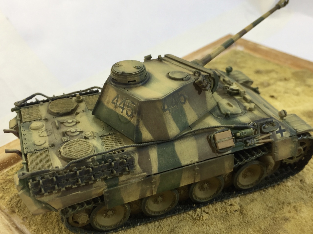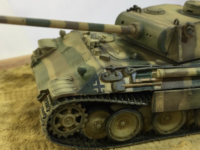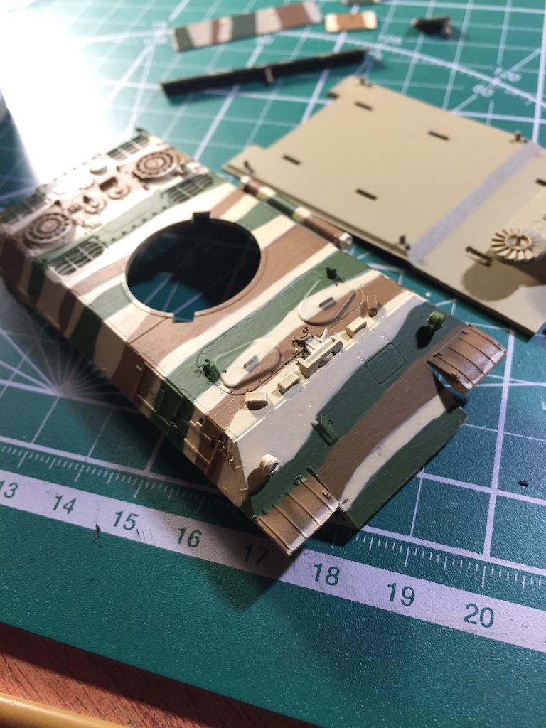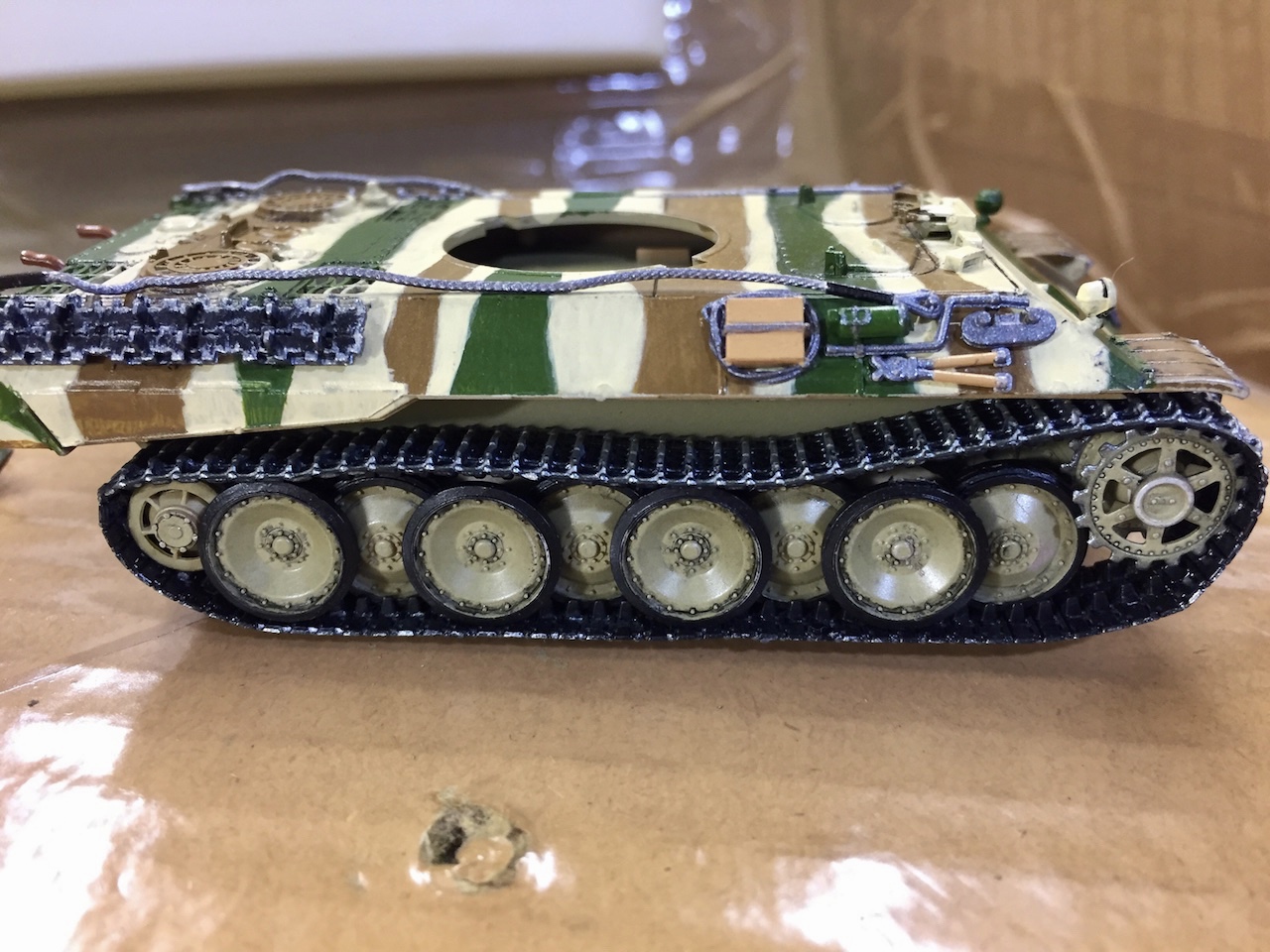 В целом окраска вполне себе. Наносить кистью камуфляж очень непросто, знаю по себе. Основная проблема, например для меня, создание четких границ камуфляжа. У вас это получилось не везде, но в целом ИМХО смотрительно. Плюсую за сетки на МТО и аккуратные бандажи. К сожалению больше по модели ничего не делалось, а можно было: