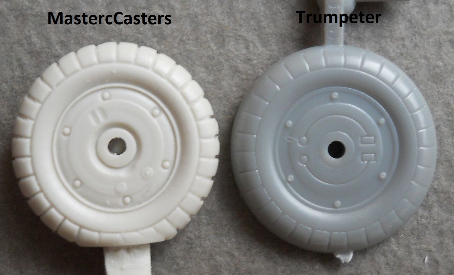 Смоляные колёса имеют чуть лучше проработанные диски, чем пластиковые в наборе от Trumpeter. Но, эта разница очень незначительна. На этом их преимущества, на мой взгляд, заканчиваются. Протектор выглядит грубее, а попытка показать нагрузку колёс слабо удалась.