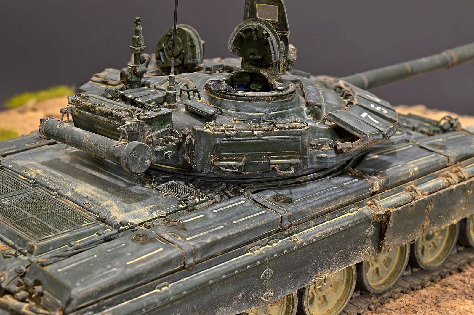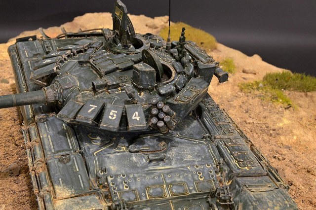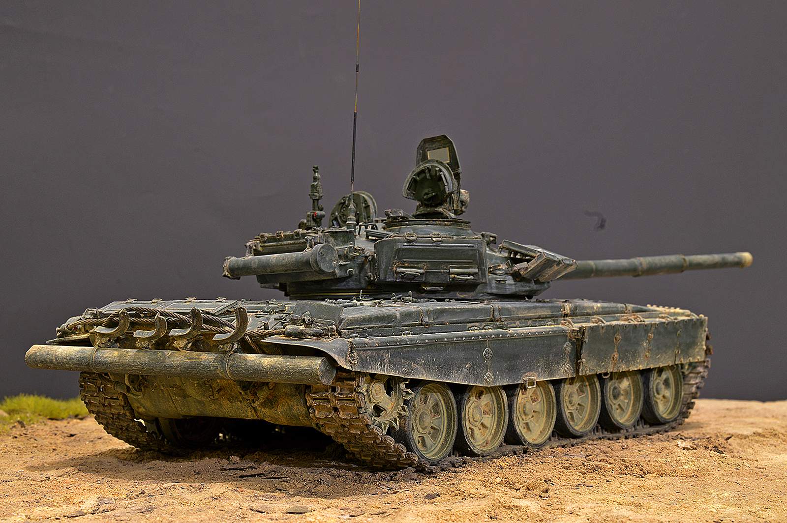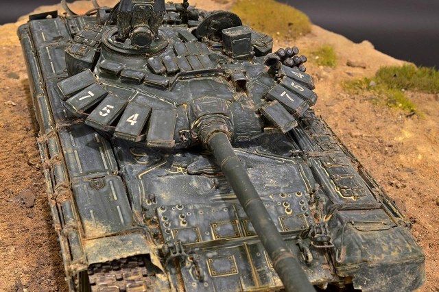 Вот я и дошёл до самой современной современности, однако… Представляю вашему вниманию модель современного Российского танка Т-72Б3 в Сирии. В плане есть задумка на небольшую нетривиальную композицию. Модель сделана очень пыльной и довольно грязной, без ржавчины и прочих затёков. Всё, как на войне. Такой обгадинг мне не нравится, да и многим моделистам, но в реальной жизни бывает и ужаснее. Бронещиток командира танка можно было бы не делать. На фотографиях танков в Сирии их практически нет.