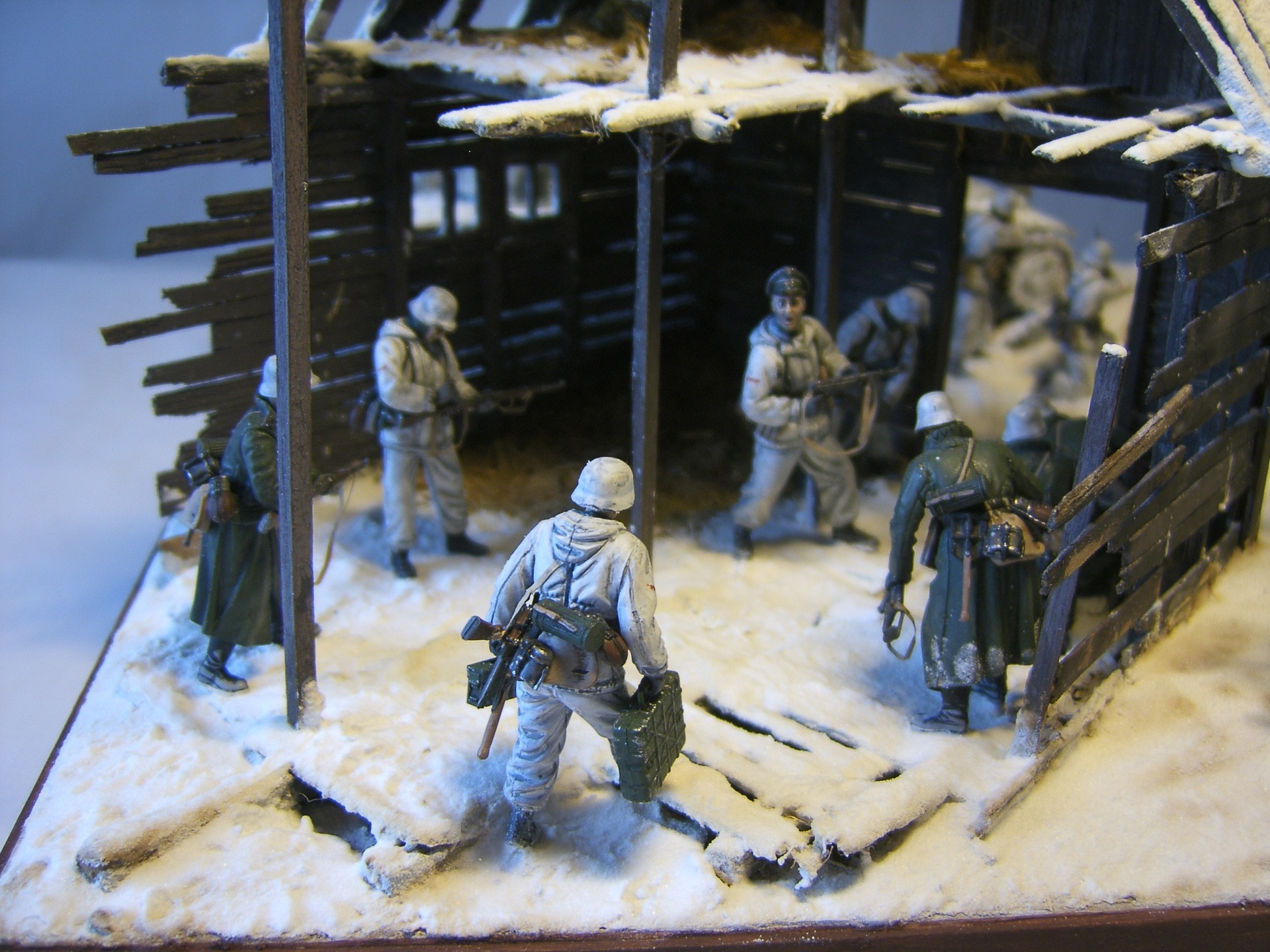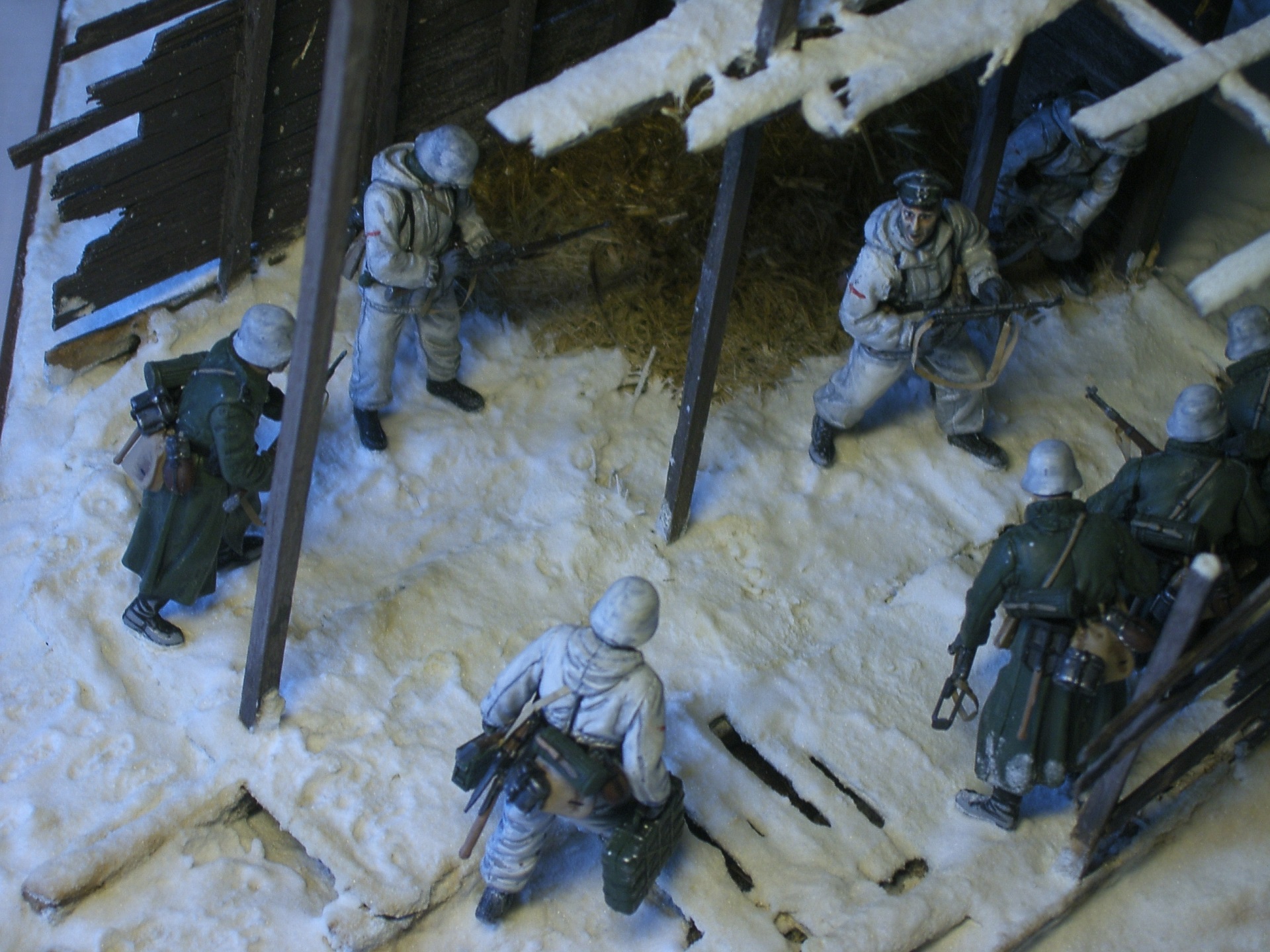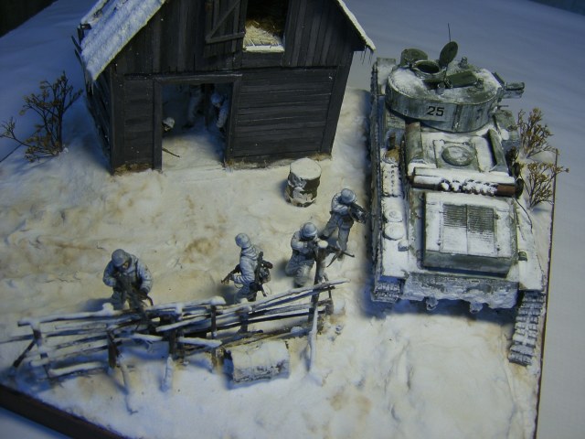 Диораму делал в 2005, был 28-й и немцы. И танк и фигурки собирал и красил в качестве тренировки окраса техники и формы по зиме без общего замысла. Потом решил собрать в общем сюжете.