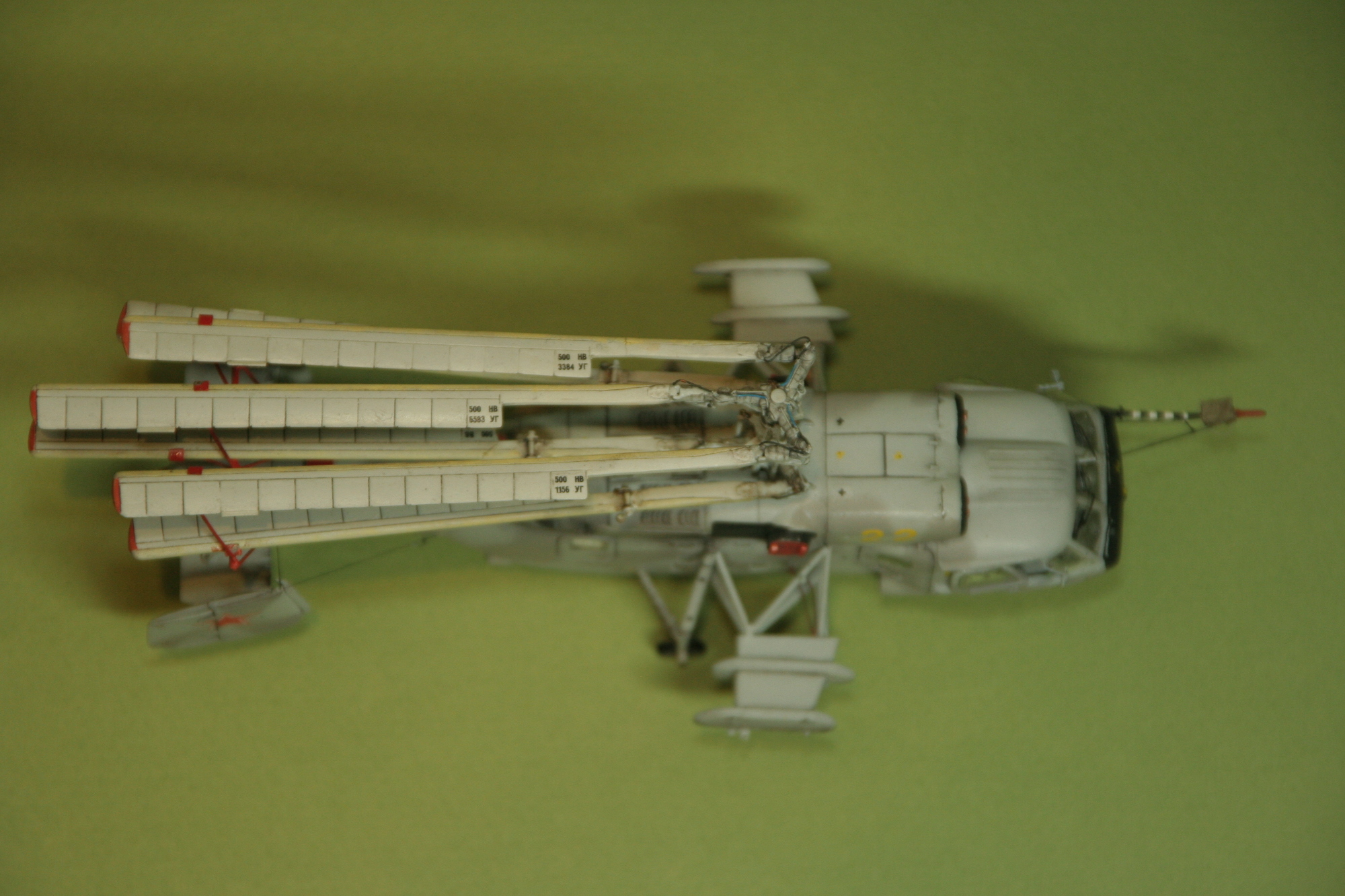 Лопасти у модели сложили только для того , что места для хранения моделей мало?) Но ведь хорошо смастерили приблуды для крепежа лопастей) И клепку снесли с модели практически всю - это так надо? Салон конечно надо бы от НеОмеги, но видать, уже не найти нигде... Да и разбирать, перебирать старую модель надо с чувством,толком и расстановкой) Через энное количество лет снова разбирать и перекрашивать ее не будете?