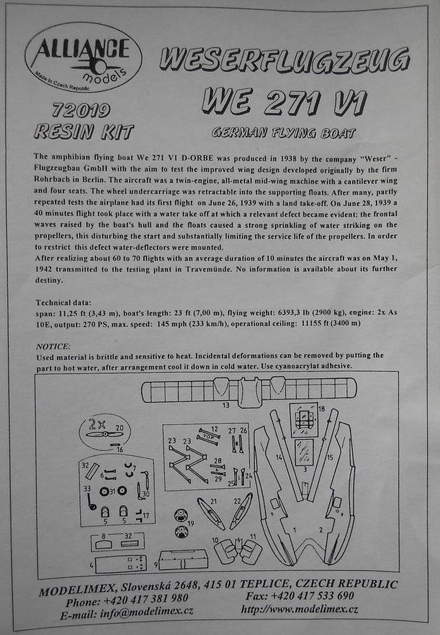 Модель из смолы от фирмы Alliance models в масштабе 1/72 (номер по каталогу 72019) упакована в прочную картонную коробку с верхним открытием. Литьё среднего качества, имеются незначительные дефекты. Ваку-фонарь пожелтел от времени. Декали смотрятся неплохо. Инструкция относительно наглядна и информативна.