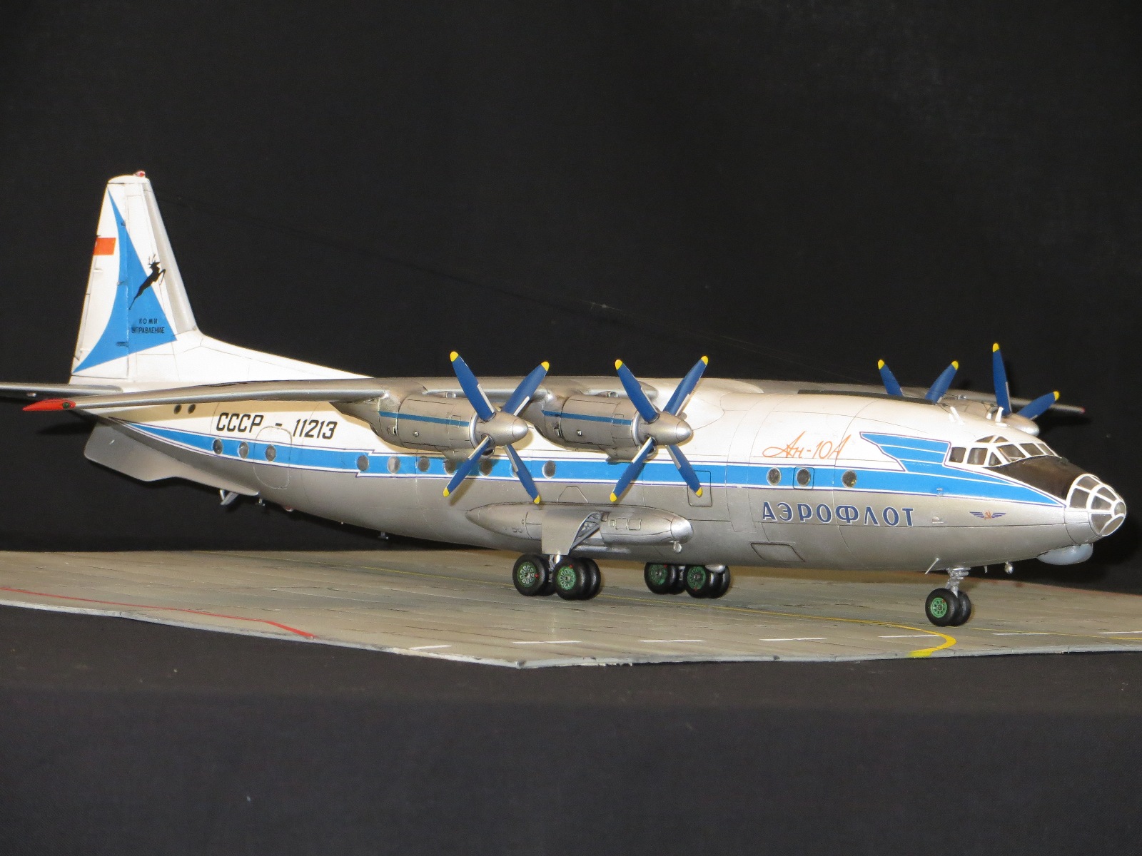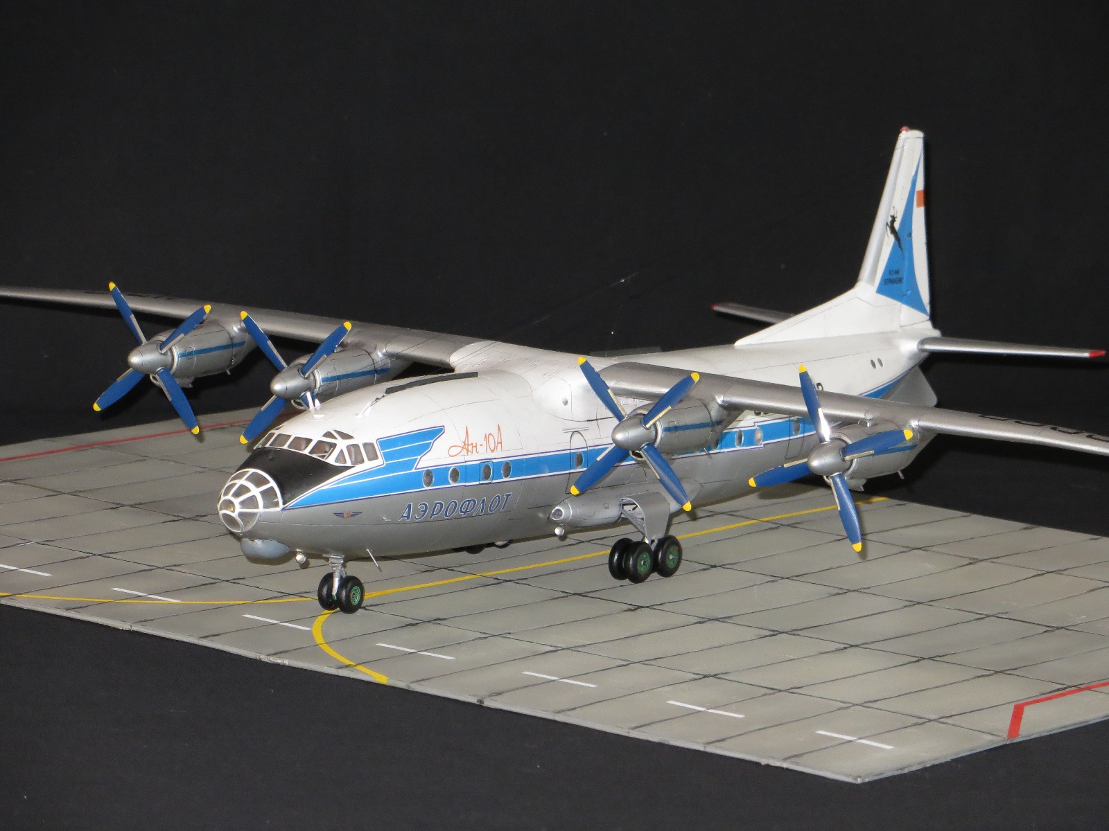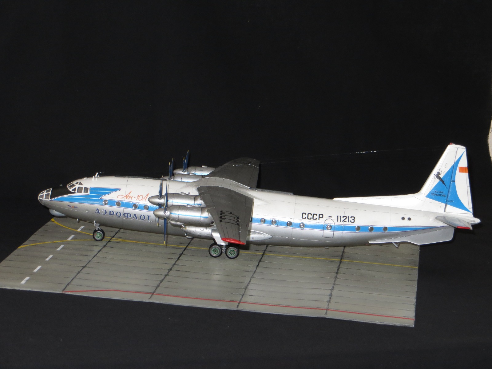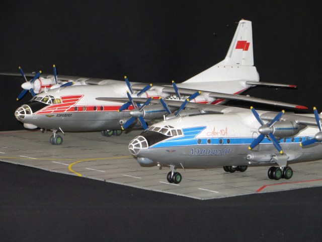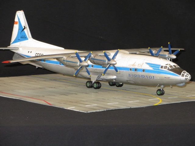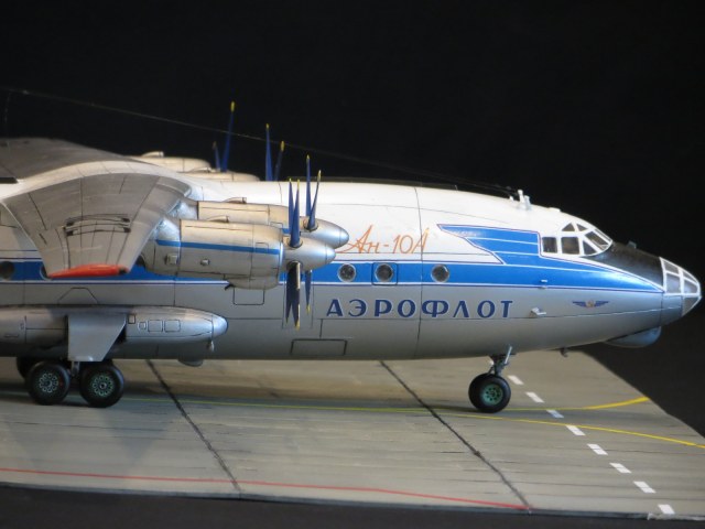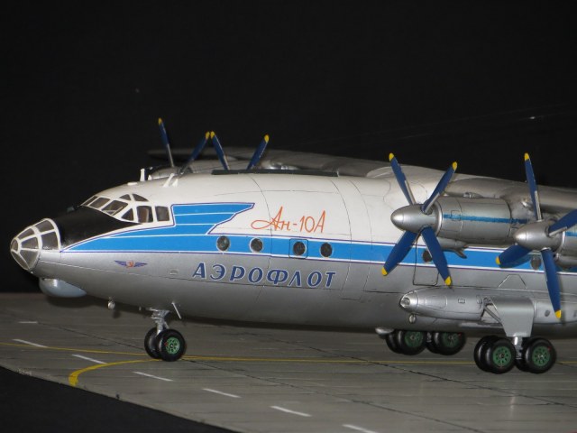 По модели.Я уже выставлял Ан-10А в 2011 году,но захотелось иметь в коллекции в синей окраске и была еще декаль от BSmodelle (от времени она испортилась)Пришлось все ломать и перекрашивать,поэтому вышло не аккуратно.Красил TAMYA.
