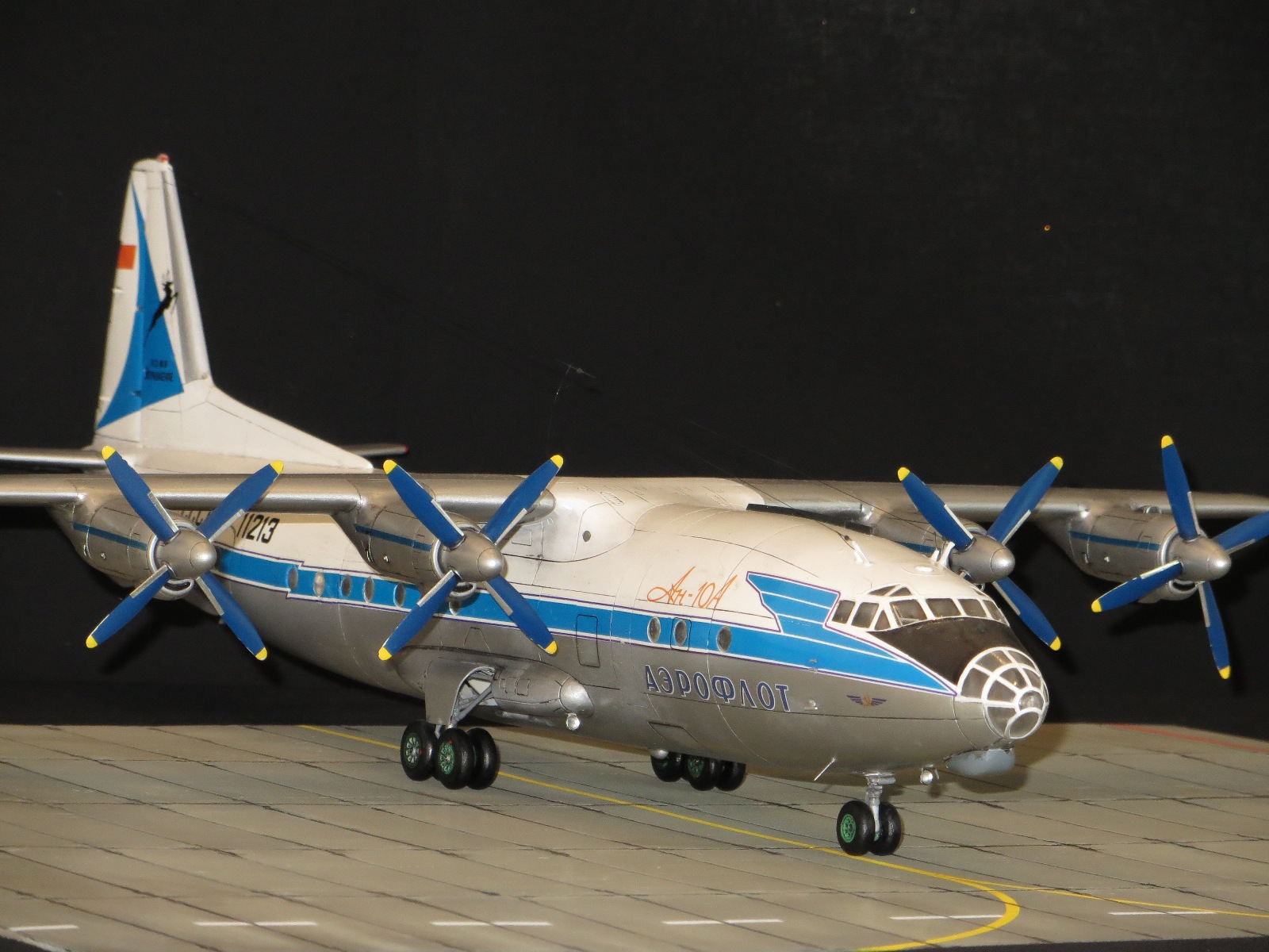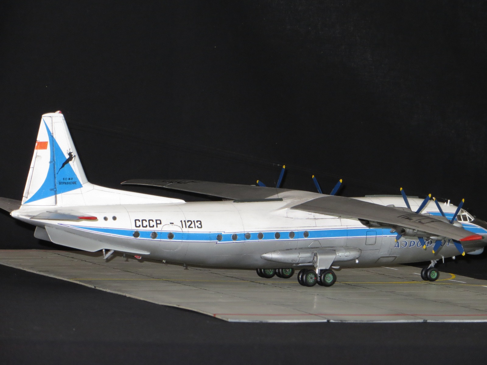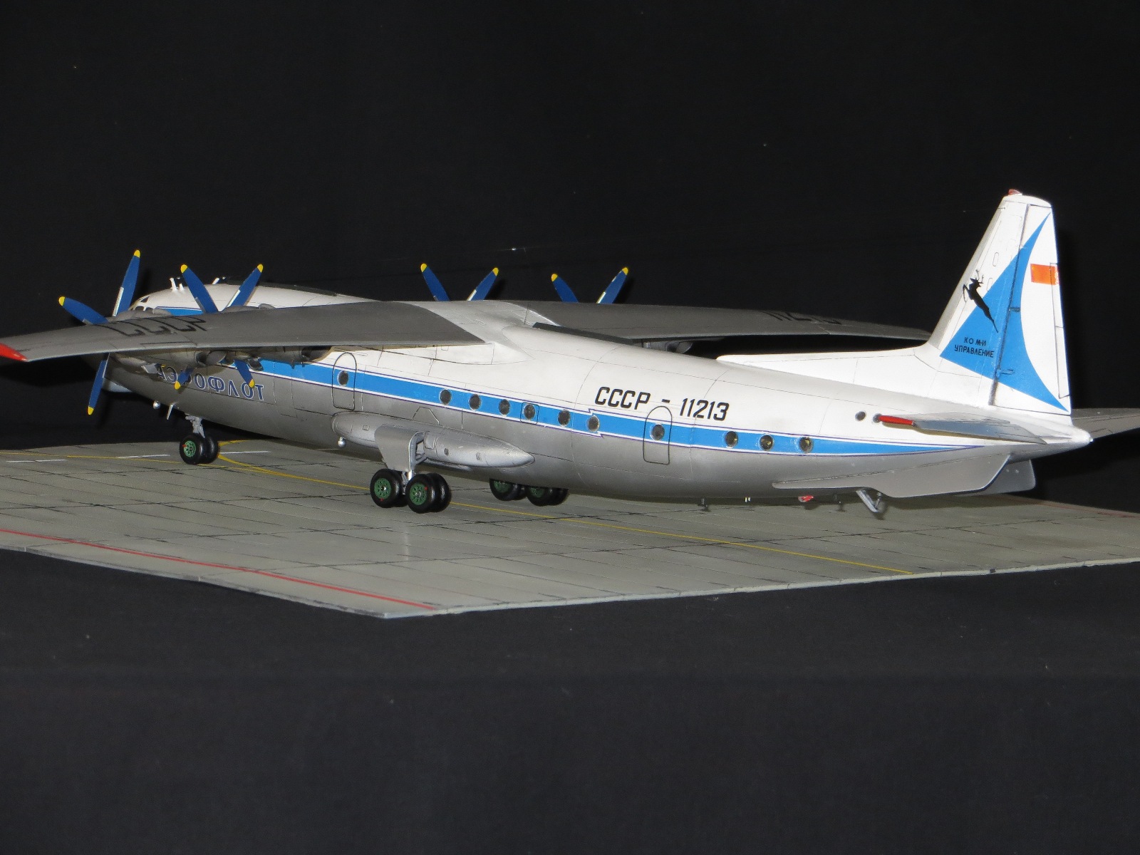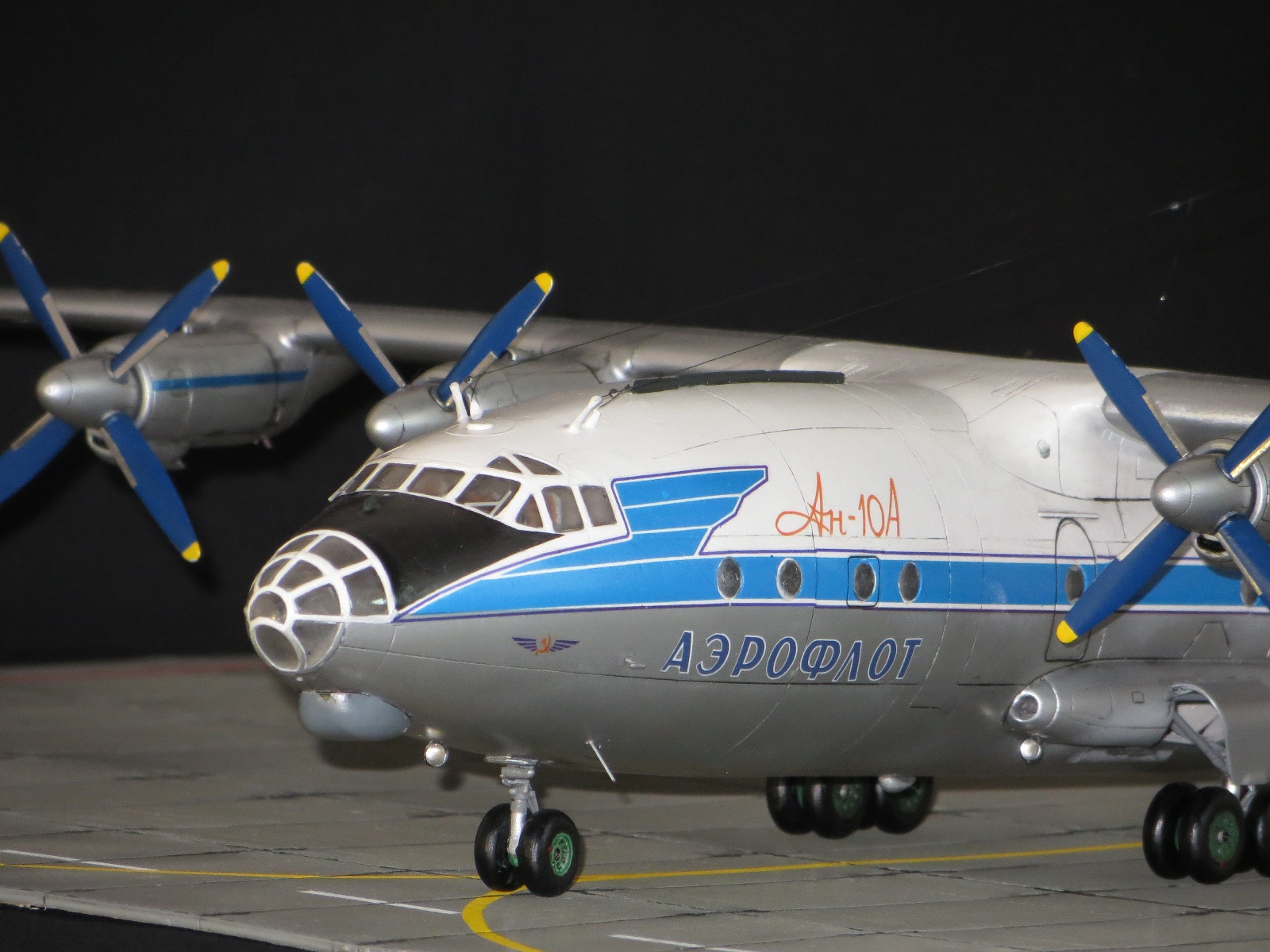 По модели.Я уже выставлял Ан-10А в 2011 году,но захотелось иметь в коллекции в синей окраске и была еще декаль от BSmodelle (от времени она испортилась)Пришлось все ломать и перекрашивать,поэтому вышло не аккуратно.Красил TAMYA.