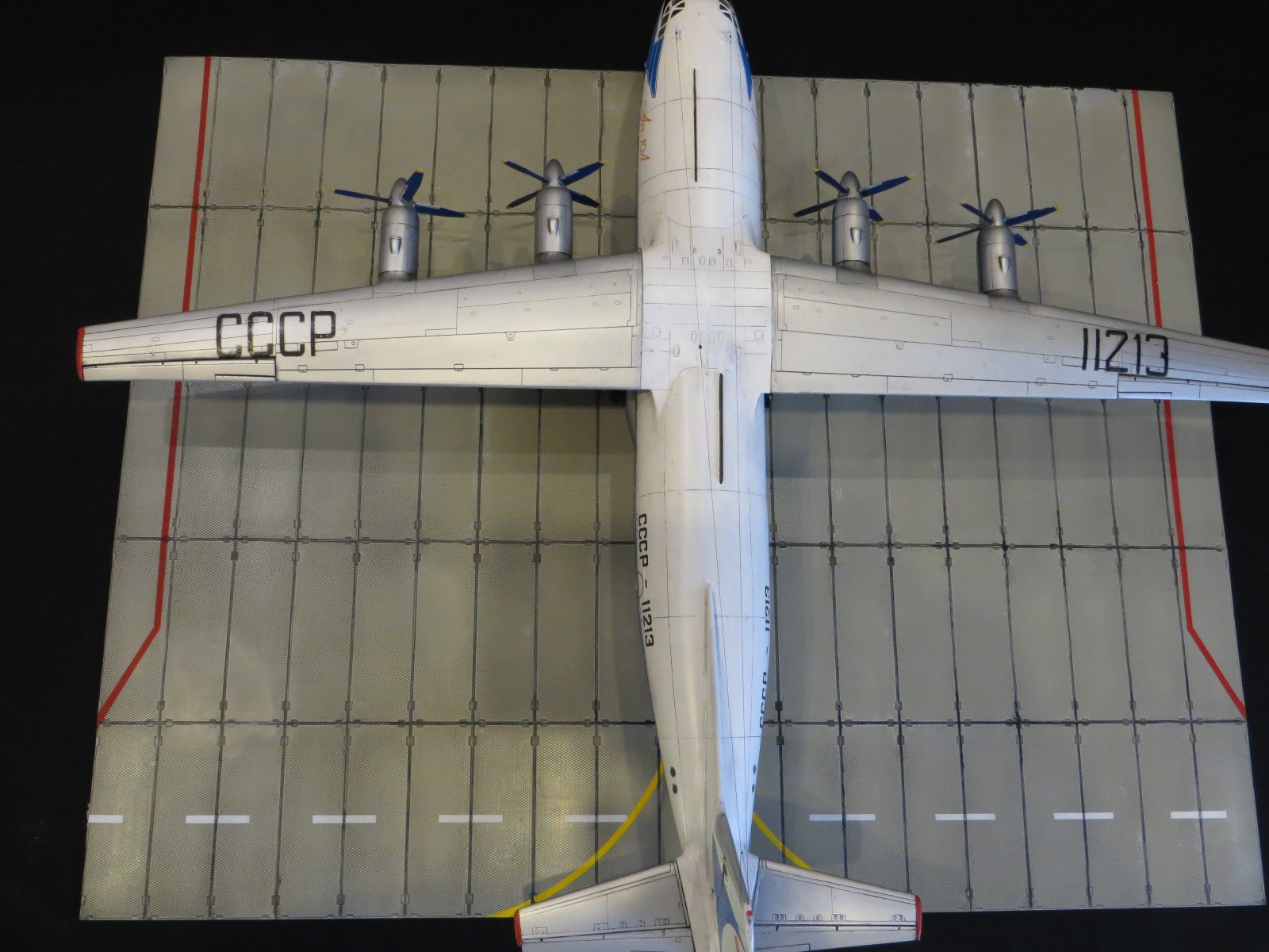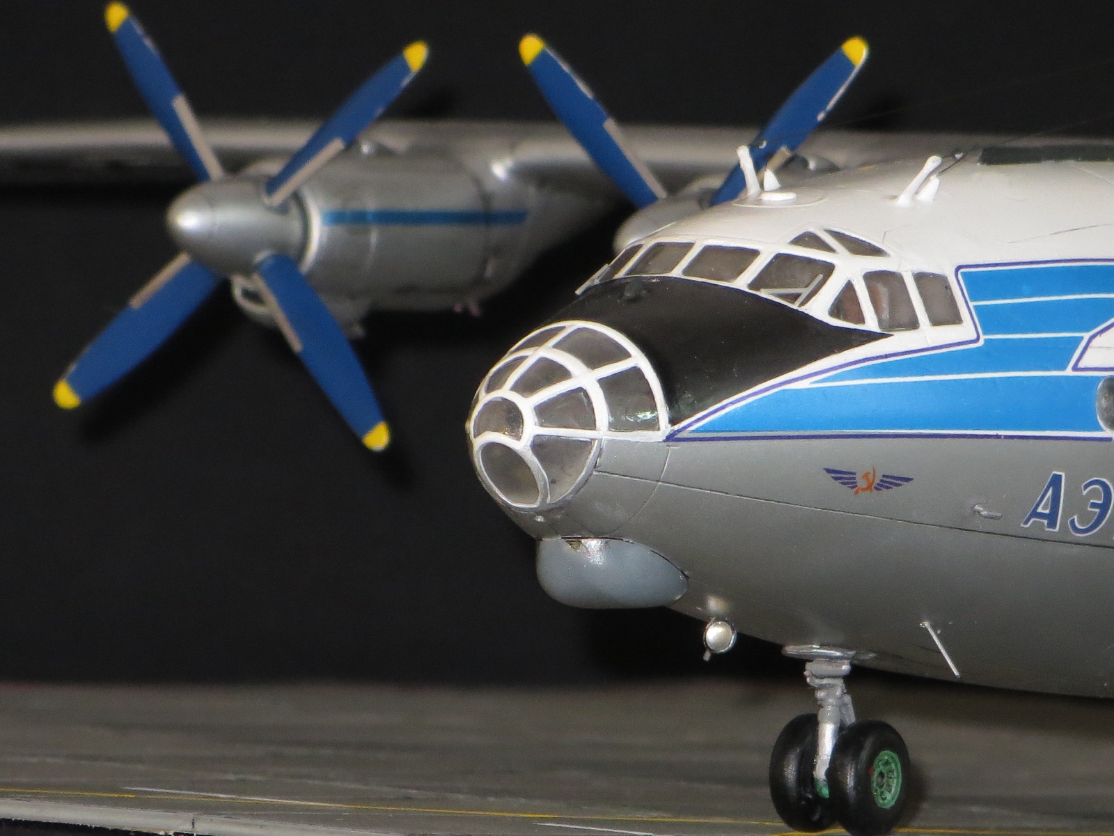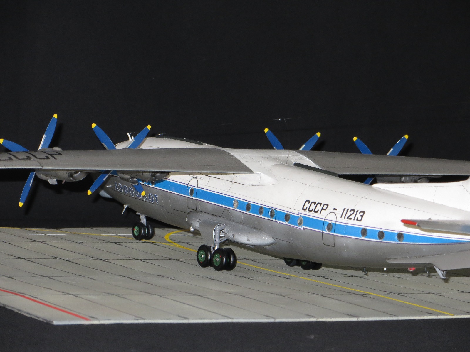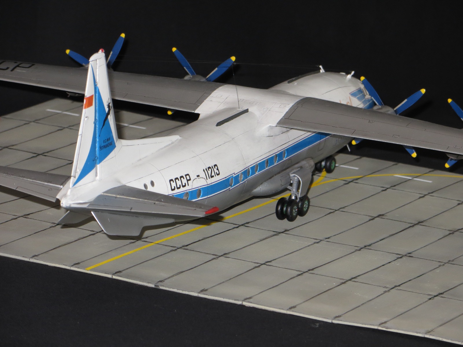 По модели.Я уже выставлял Ан-10А в 2011 году,но захотелось иметь в коллекции в синей окраске и была еще декаль от BSmodelle (от времени она испортилась)Пришлось все ломать и перекрашивать,поэтому вышло не аккуратно.Красил TAMYA.