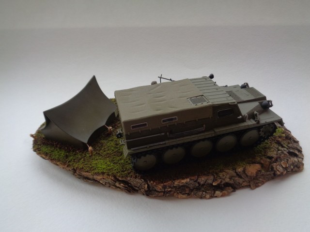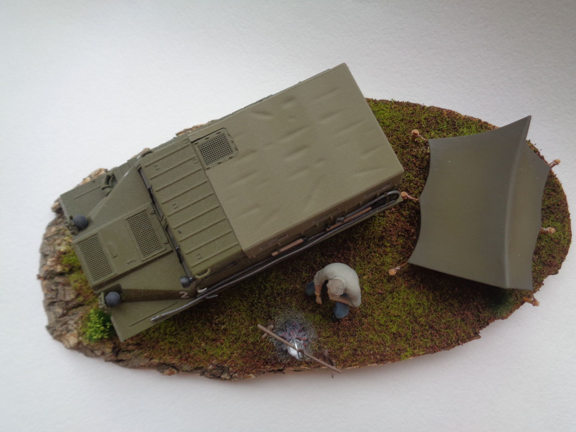Душевно вышло - задумка хорошая. Но есть несколько моментов. Транспортер приехал в лес...с чистой ходовой и корпусом, такое ощущение , что он приземлился с воздуха на этот участок, палатка выглядет - ну скажем пластмассовой, припылить бы ее, поработать над гранями немного , придать им объем,фигурка - тут отдельная тема я понимаю, чот роспись лиц а именно глаз очень сложна для начсинающих моделистов..НО факт таков - лицо, по тому фрагменту , что видно в кадре не вышло явно. А вот подставка и идея с ней понравилось все - тут только + от меня!!!Мое такое виденье. Удачи в следующих работах!!!