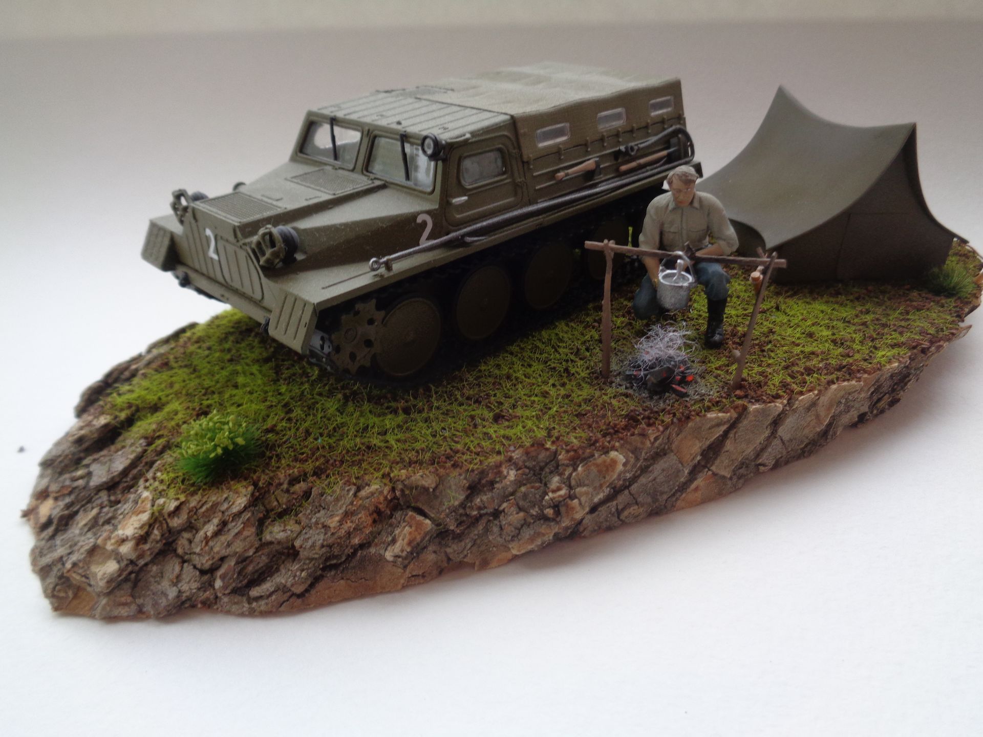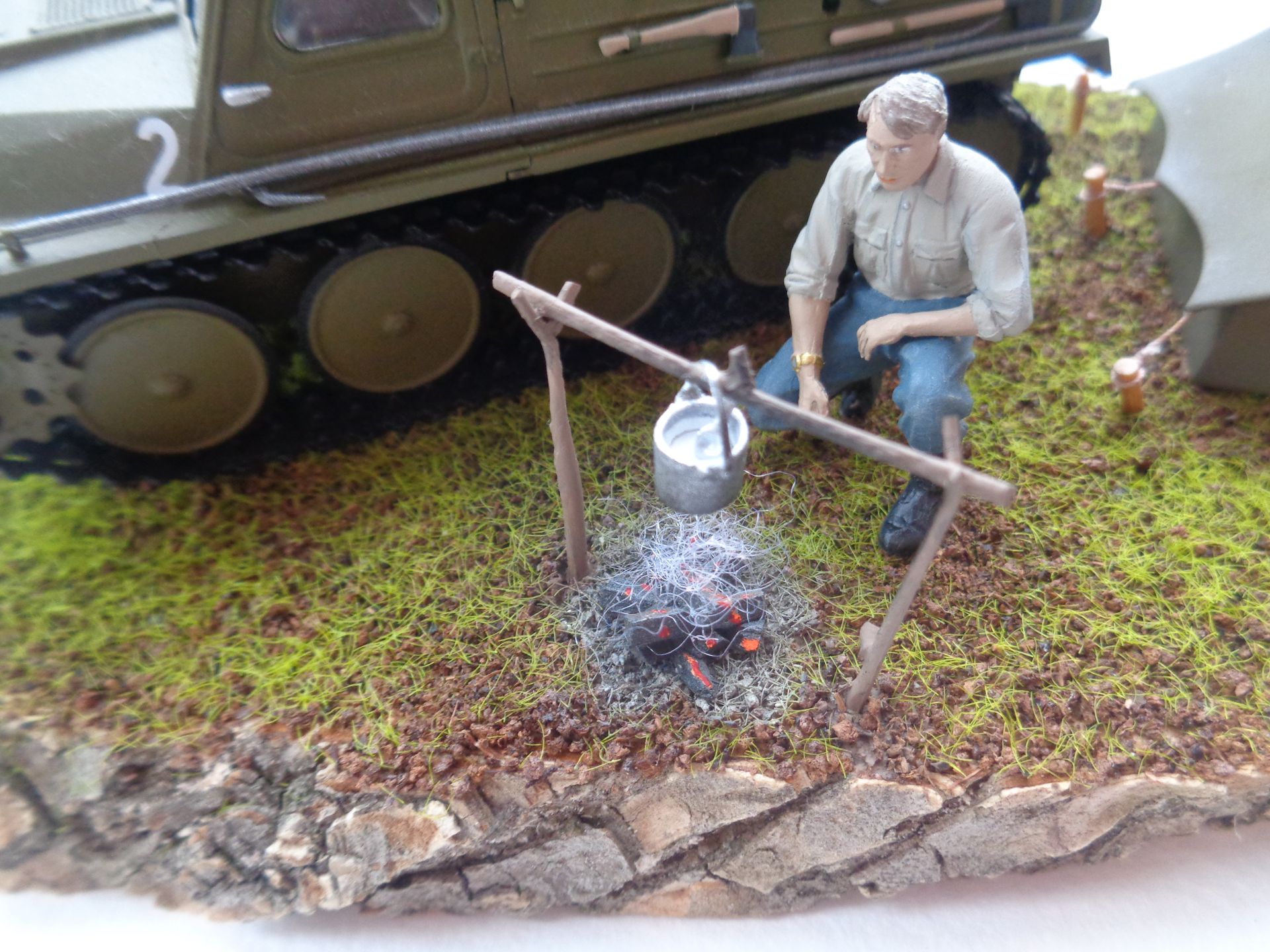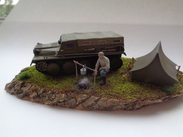 Замечательная модель отечественного "внедорожника" просилась на виньетку. В экспедицию на ГАЗике отправился суровый обрусевший дяденька от miniart, которого я снабдил палаткой из подручных материалов. По замыслу на привале мужичок в котелке варит кашу. Дымом своим от костра я остался не доволен - волокна синтепона на фото больше похожи на белых червяков.