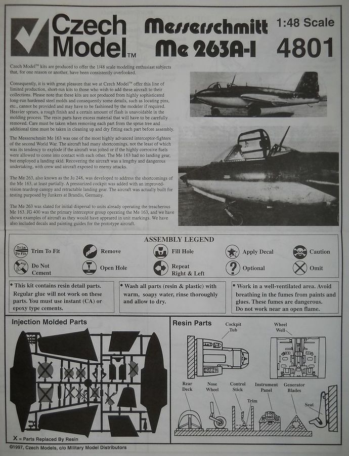 Модель из пластика от Czech Model в масштабе 1/48 (номер по каталогу 4801) упакована в картонную коробку с боковым открытием. Типичное раннее ЛНД с нечёткой расшивкой и облоем. Ваку-фонарь имеется в двух экземплярах, причём один сильно пожелтевший, а второй нормальный. На мой взгляд, это является доказательством того, что фонари желтеют или не желтеют скорее в зависимости от исходного материала, чем от времени. Декаль прилагается на четыре варианта. Выглядит она немного пожелтевшей. Приятным дополнением является смола от True Details. Отливки выполнены вполне достойно - хорошо проработанные интерьеры кабины и подшассийных ниш. Присутствуют также колёса шасси и носовой ветряк. Инструкция вполне информативна.