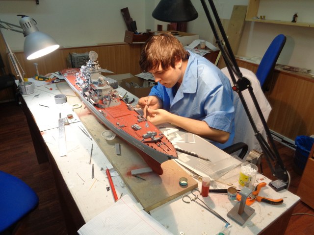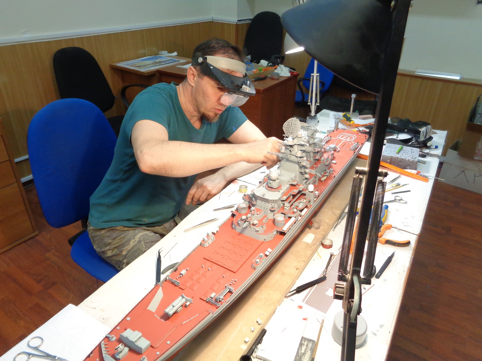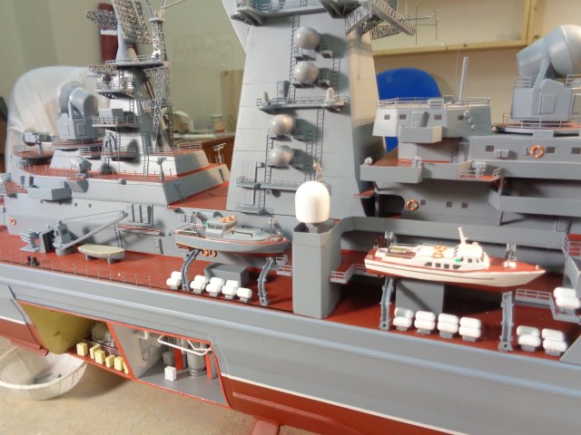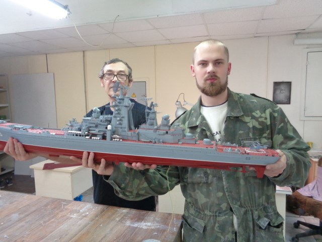 В мастерской "МоделлМикса" работа над моделью началась где-то в апреле, когда коллега В. Червонящий "вырастил" на 3D принтере первые секции корпуса, которые я склеил, насаживая для прочности сборки на водопроводную трубу - модель-то увесистая и длинная, 125,5 см. А потом бедного "Кирова" из-за других срочных проектов мы всё откладывали, изредко вяло делая для него то башни АК-100 (растились на фотополимерном принтере), то РБУ-1000 (от руки). И вот наконец 22 августа мы за него взялись всерьёз. Организация нашей стройки очень напоминает организацию строительства настоящего корабля: я как бы "главный строитель", "заказываю" коллегам системы и устройства, которые по готовности собираю на корпусе, стоящем на стапеле. Множество сложных конструкций нарезал лазером или отфрезеровал А. Гореленко, сотни отверстий под стойки леерного ограждения и различные устройства вручную высверлил В. Авхуцкий, вертолёт и катера (как и ко всем нашим предыдущим проектам) изготовила наша единственная представительница "слабого" пола Олеся Гапеева, а во всей завершающей сборке отлично поработал Евгений Крягин. О себе тоже не умолчу - делал все надстройки (лазерная резка по оргстеклу) и красил.