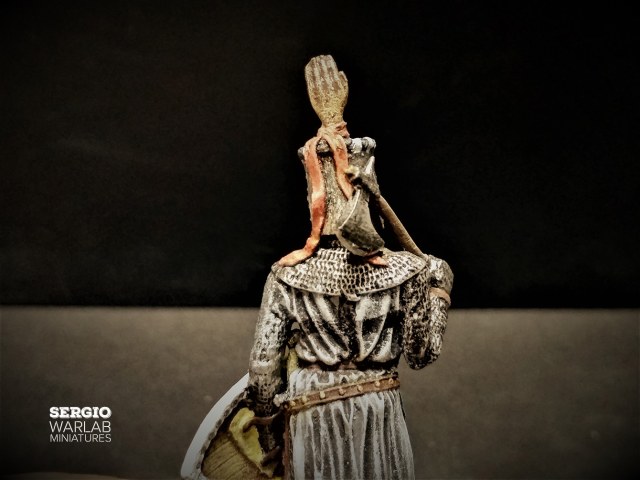 Драйбраш по плащу тут я думаю неуместен. В следующий раз при окраске белого плаща, закройте сначала всю окрашиваемую поверхность в смесь белого немного синего и черного, в зависимости от глубины тени в складках и от этого темного постепенно высветлять тонкими слоями смеси белой краски, хайлайты само собой уже чистым белым. По металлу советую сделать неплохую подложку и не использовать 1 цвет металла, что бы добиться опять же теней, немного проливая вошами, метал высветляется так же ,как и обычный не металл.