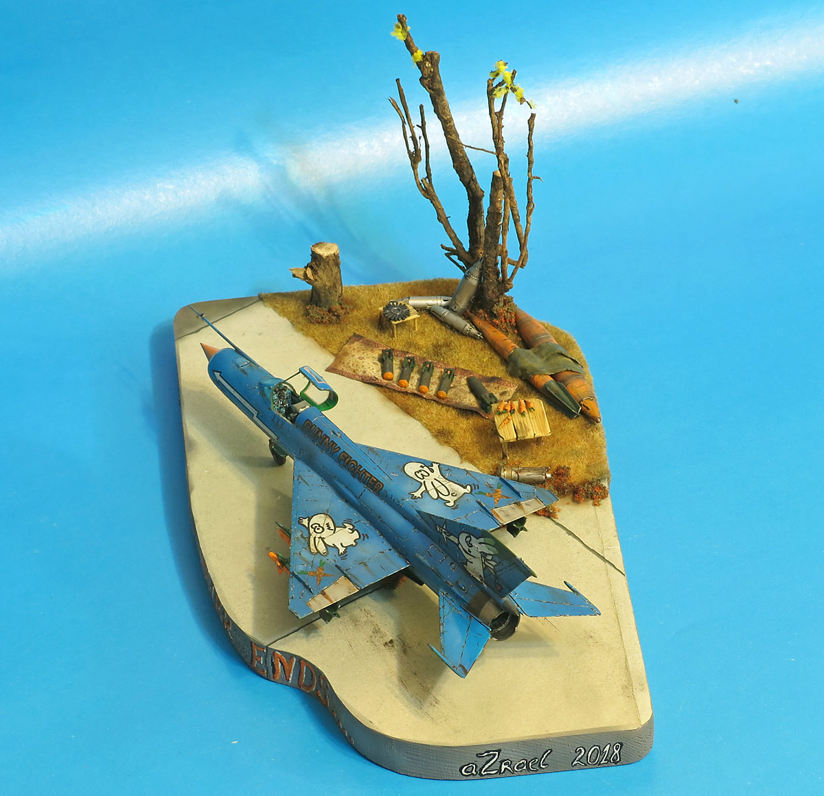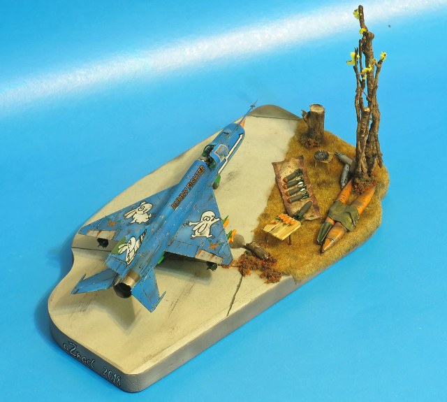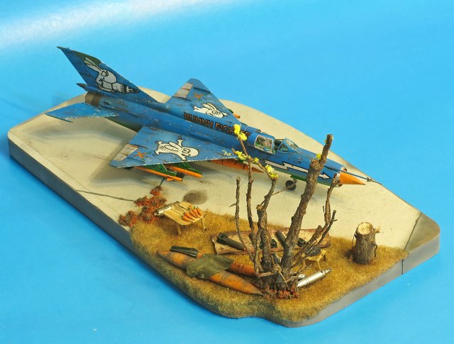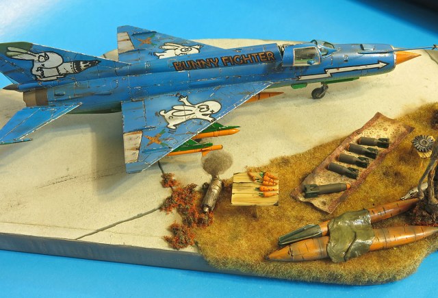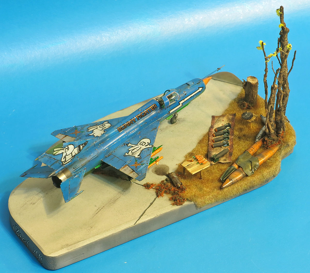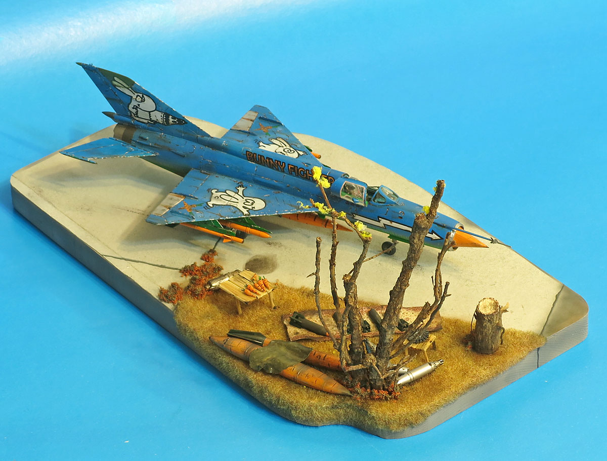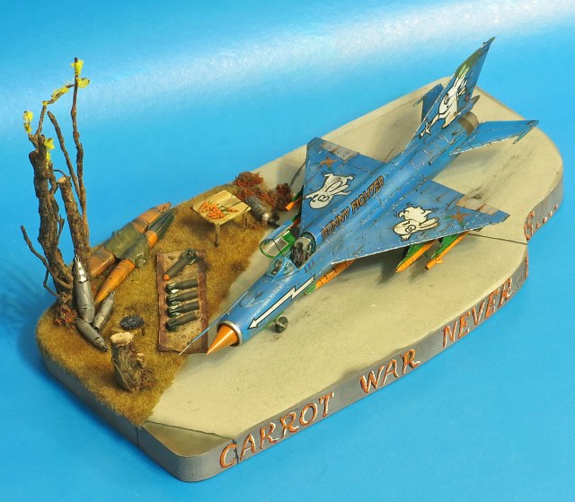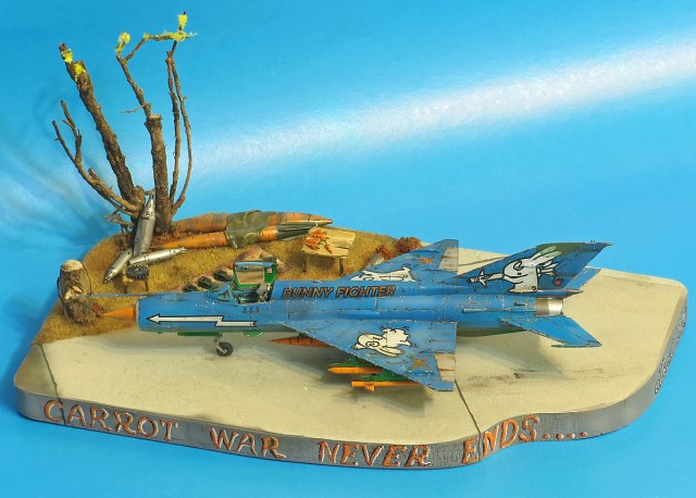 "Этот самолет участвовал в одном из менее известных конфликтов, так называемой «Морковной войне». Эта локальная война произошла в Центральной Африке, полностью вне внимания мировой прессы. Ядром войны была собственность на местные морковные поля. МиГ-21BFC (Бомбардировщик - истребитель - Канибализированный) был продан в Центральную Африку из бывших запасов чешских ВВС, поэтому на ранних этапах «Морковой войны» на крыльях были видны чешские знаки отличия. Три метки убийства под кабиной символизируют вражеский самолет, сбитый лейтенантом Кэрролом Баннифилдом. Необычайно красочный замаскированный МиГ служил приманкой для вражеских оппортунистов. Вражеские самолеты были сбиты другими МиГами при попытке уничтожить самолеты Баннифилда."