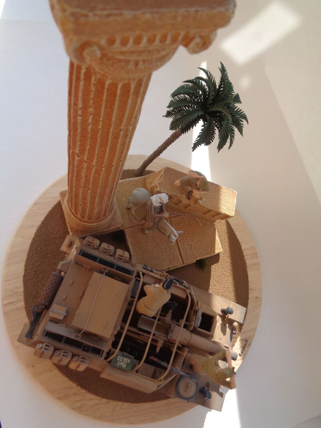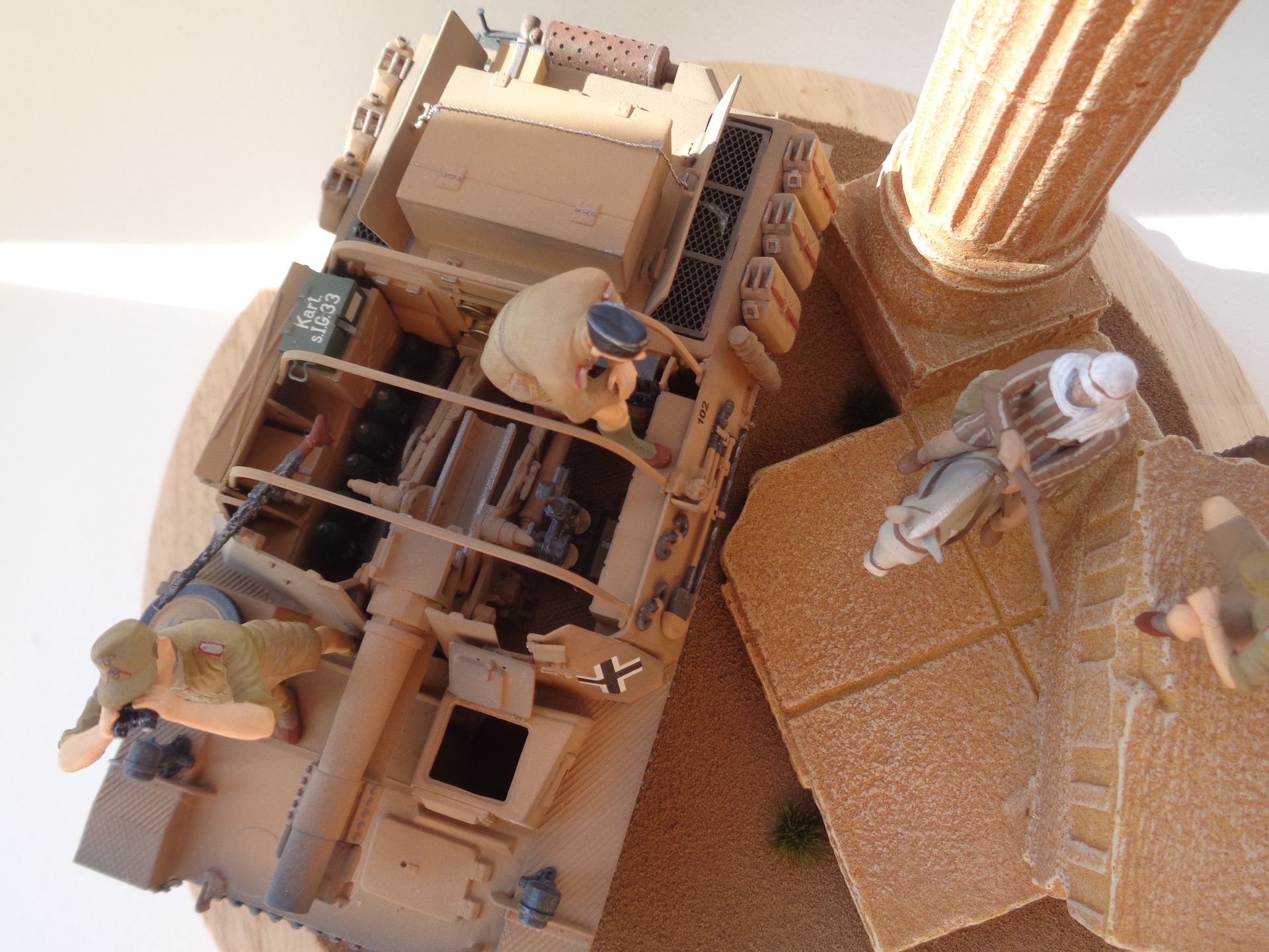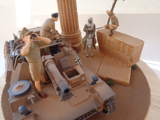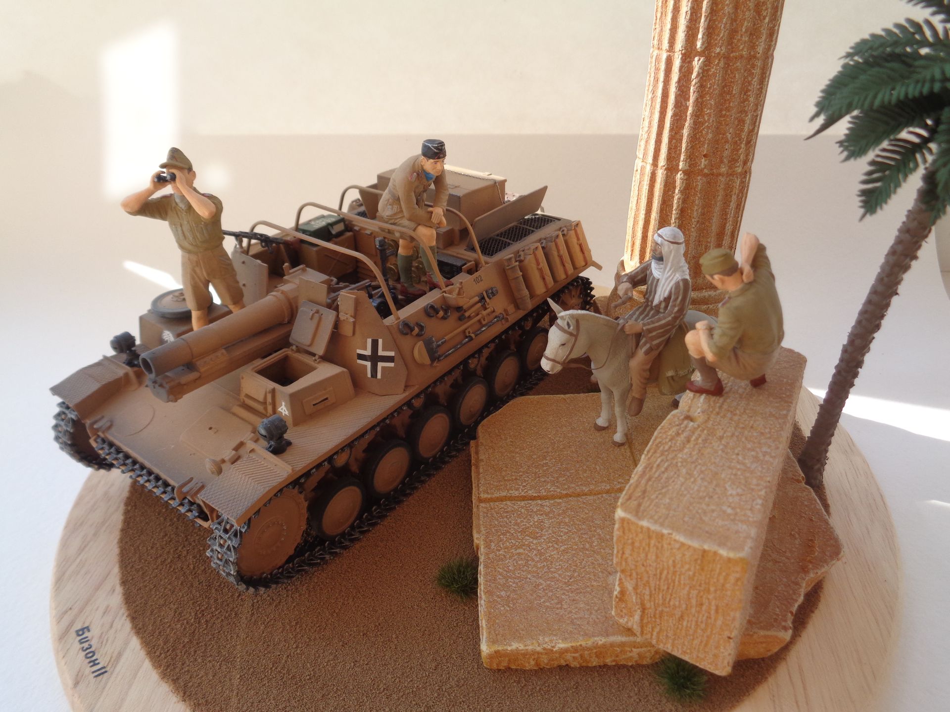 Для его создания выбор пал на немецкую САУ "Бизон 2", стоявшую на вооружении Африканского Корпуса. Экипаж мобилизовал из набора от MasterBox. Мудрить с оформлением не стал, использовал фрагмент постройки из полистоуна для декорации аквариума из ближайшего зоомагазина и страшную пальму из АБС-пластика от zip Maket. Всё это безобразие я поместил на разделочную доску, злодейски добытую на кухне у жены. Очень приятную в сборке модель от экс-Alana дополнил кожухом глушителя из стика чая teatone и самопальными сеточками мехотделения. Всё задул акрилом Tamiya. Этой же химией покрыты и фигурки.