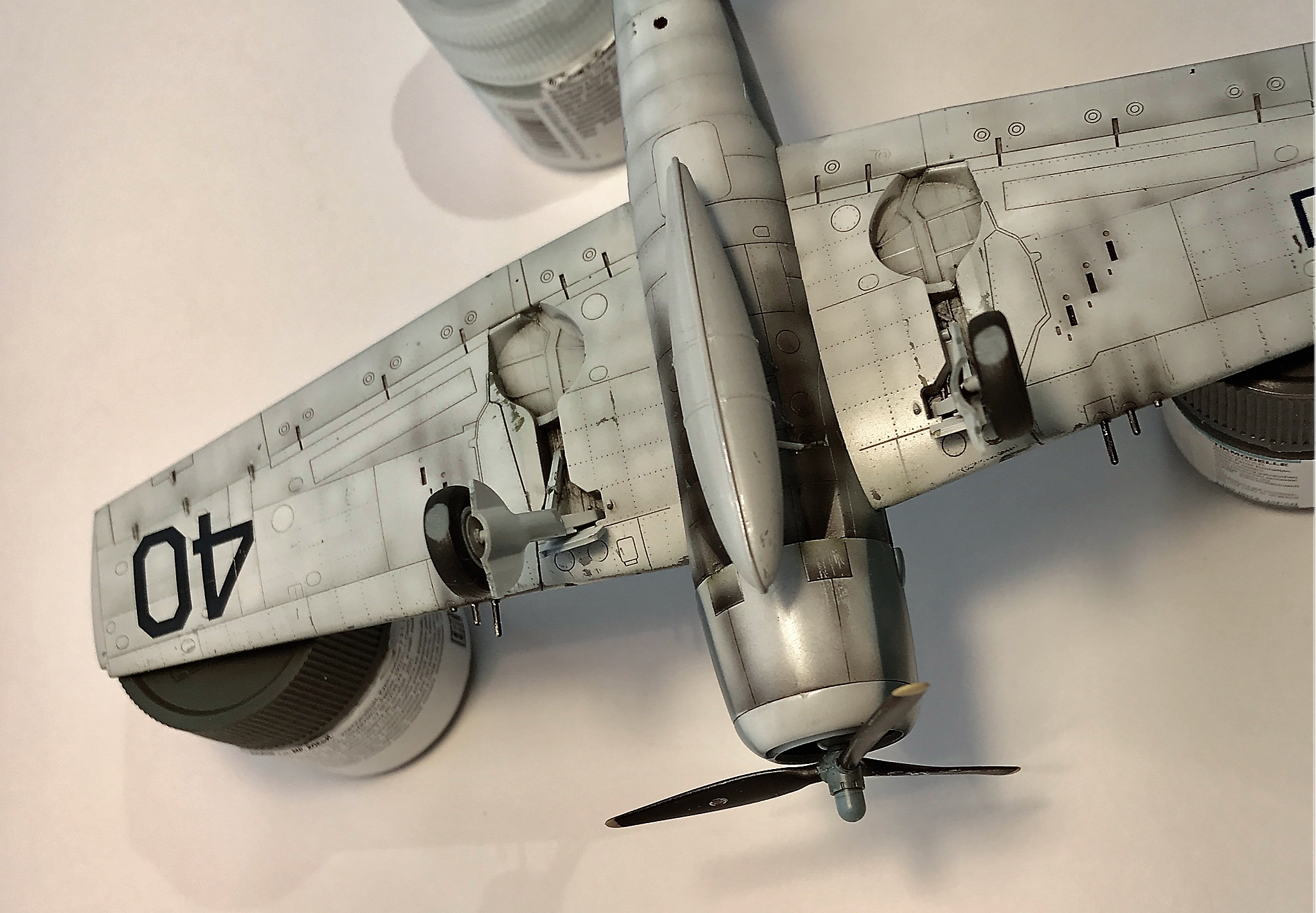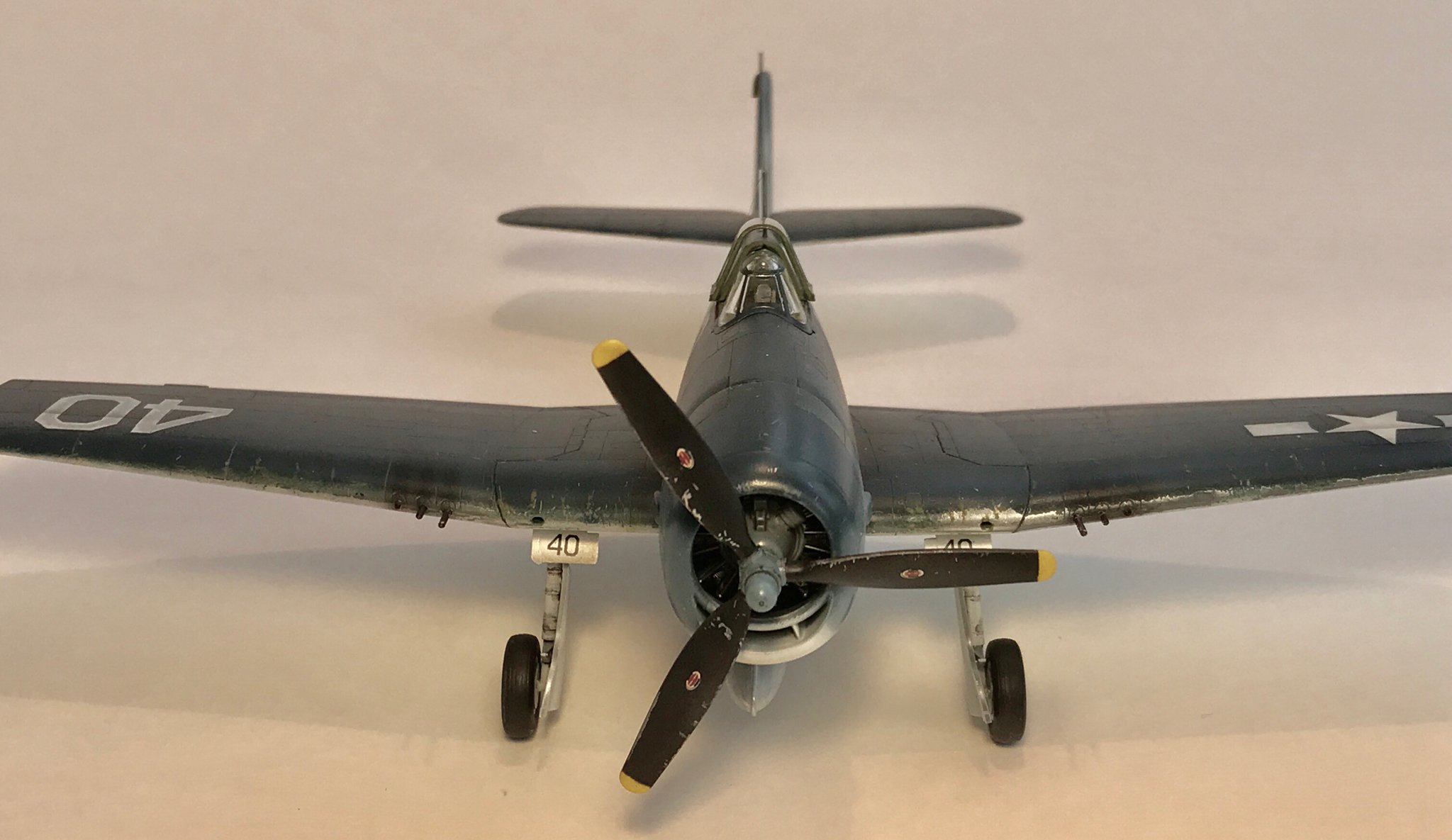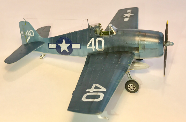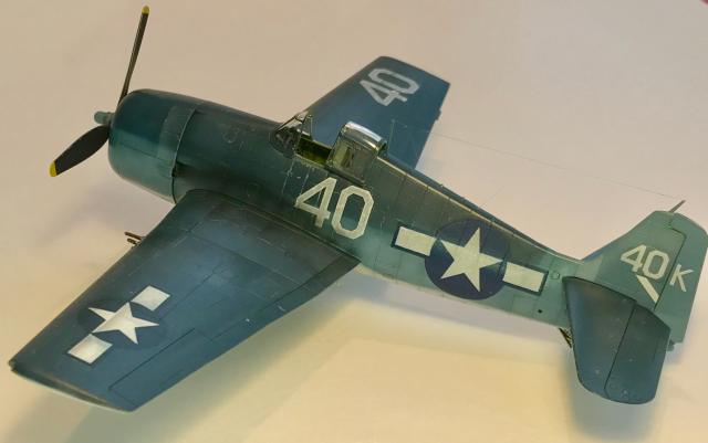 Модель из дуалкомбо профипак. С травлом и масками. Но для английских вариантов. Пришлось брать деки от моделистовского хеллкэта. Но деки жутко прозрачные и белые звёзды получились, мягко говоря, не очень белыми((( печаль. Один ОЗ на крыле нанёс с трафаретом( подошёл размер) . Краски Gunze и tamiya . Футура дала кракелюр( полумат от Тамии.клепку местами нанёс, натянул антенны , пушки от моделмастер. Постшейдинг высветлением и смоуком.фото с айпашки , ББ вывести не смог. Сорри.