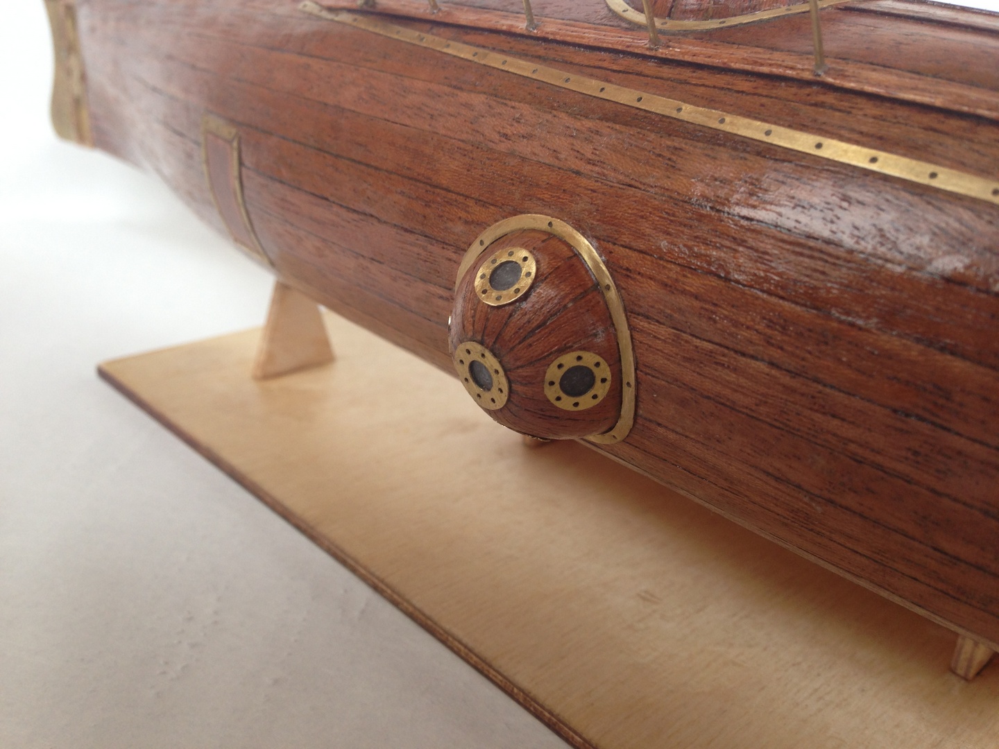 Модель в масштабе 1:46. Производитель : «Wooden Кит».Содержимое набора оставило о себе очень приятное впечатление. Материал хороший, без сучков и расслоений. «Самовыравнивающийся» каркас выравнялся и модель не повело. Обшивка однослойная. Раскрой точный. Всё сделано лазерной резкой — только в некоторых местах приходилось «дорезать». Очень много латунных/медных деталей, что, конечно, очень украшает. Не понравились леера, вернее их отсутствие, предлагается их сделать из проволоки — а её то как-раз и не хватило. Ещё один минус — это подставка — очень упрощена и ухудшает восприятие модели.