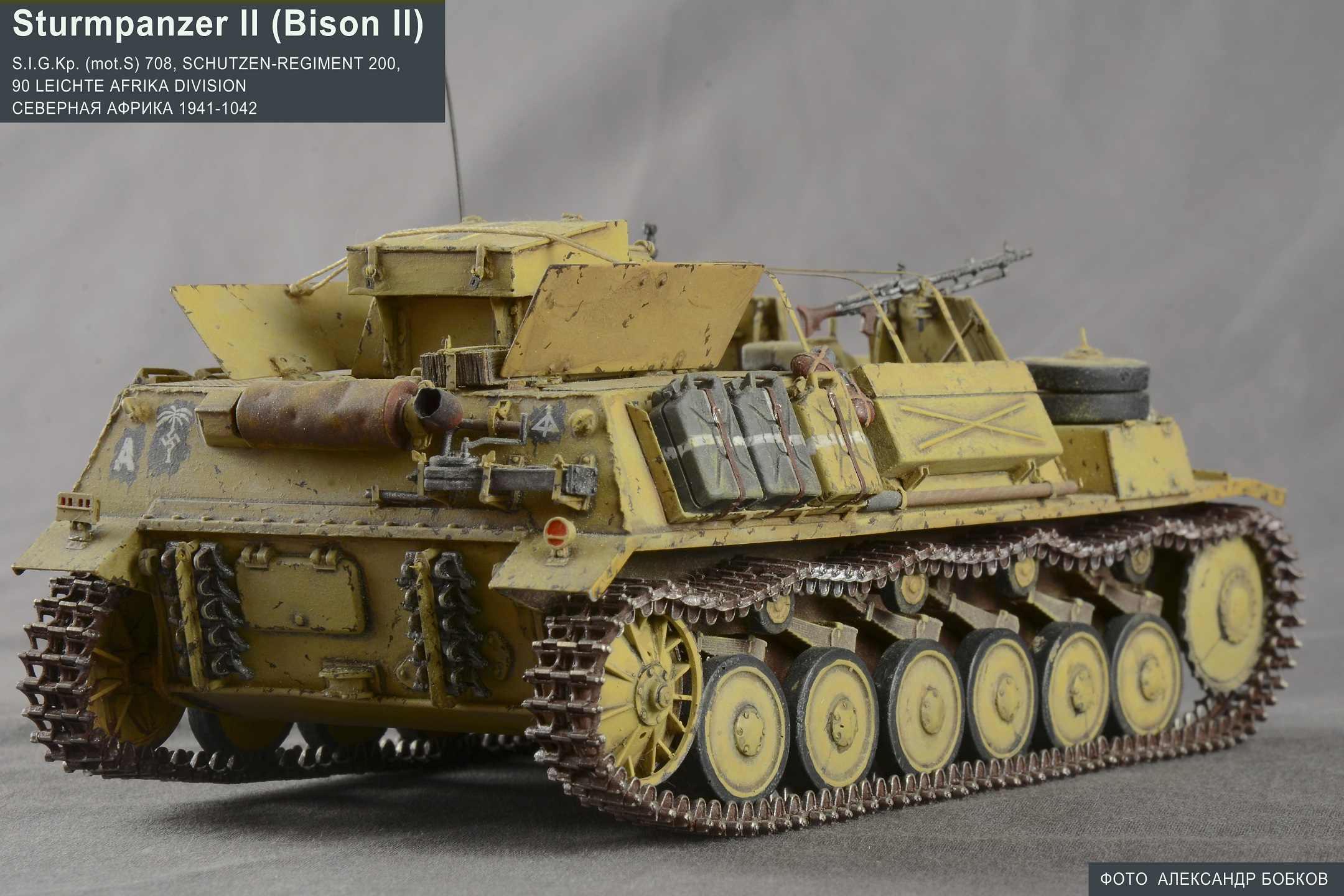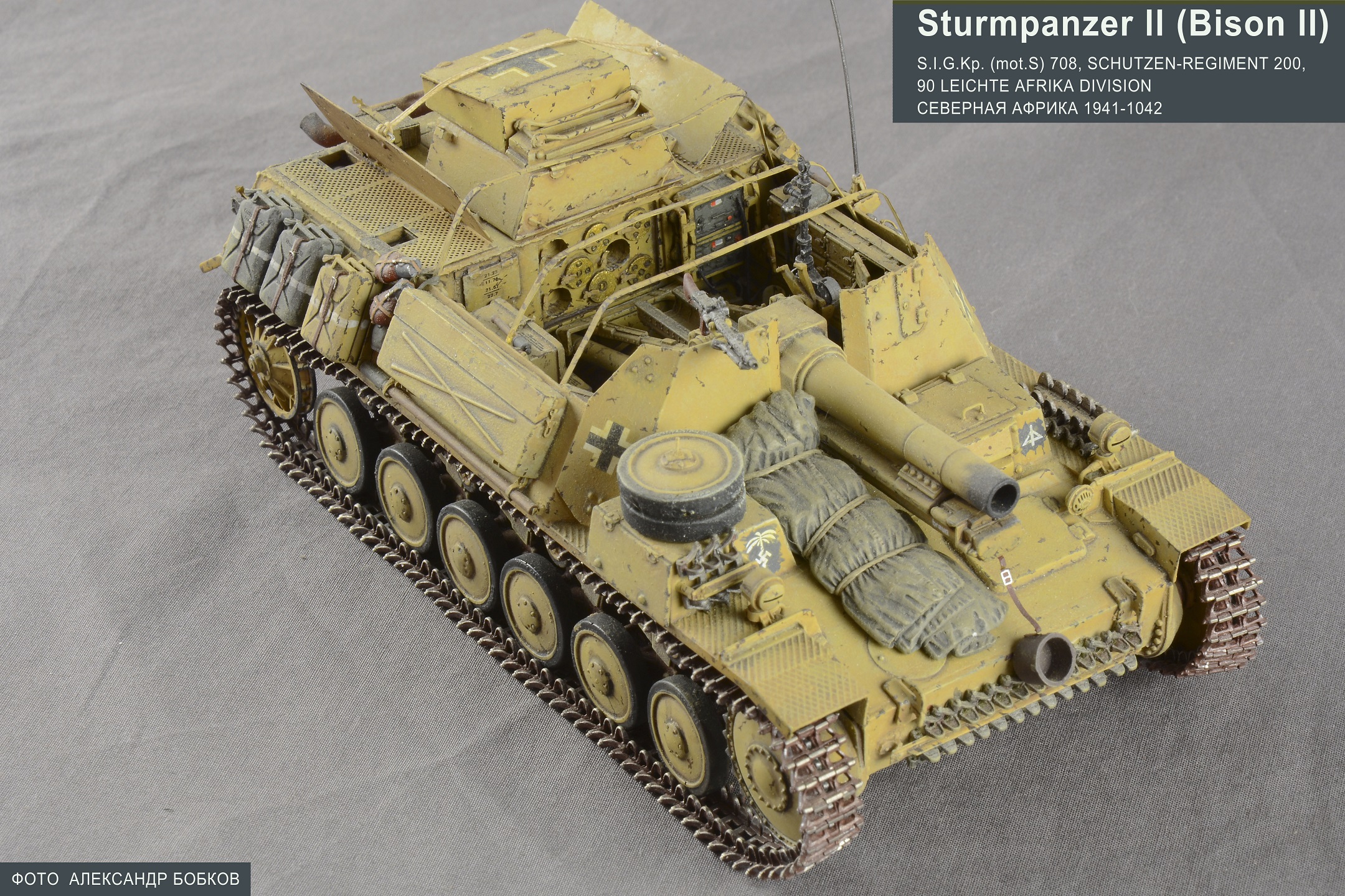 В предыдущий период своего творчества в моделизме (2008-2013) я занимался немецкими самоходами. Причиной было обилие и качество представленных на рынке моделей. В рамках этой темы я очень хотех Бизон 2 и он был, но был только Алан. А это сами знаете что такое. И все же решился. Для работы собрал следующее: 2 набора от Алан (один для эксперимента пилить-примерять другой для работы), танк Pz llC от Dragon из него взял интерьер, ведущее колесо, ленивец и снял копии катков и рессор (катки и рессоры лил из эпоксидки в силикон), SiG33 от Dragon, глушитель от Moskit (была такая замечательная контора), набор фототравлёного крепежа для шанца от Aber, шанец из смолы от Танка, канистры от Tamya, детали внутреннего интерьера от разных наборов Dragon (радиостанция и сопутствующее ей оборудование, укладка боеприпасов, и т.д), гуси Friul и разное по мелочи. По сборке интерьера - в общем и целом импровизация на тему. Остальное там без особых сложностей по схеме и немногим доступным фото. Красил акрилом от Tamya. И как не раз с моими запилами рад что успел закончить раньше релиза на эту модель от Драгона. Модель как и прочие из того периода пережила два переезда отсюда мелкие косяки (кое-что поломалось из мелочей) увидел после того как отсняли.