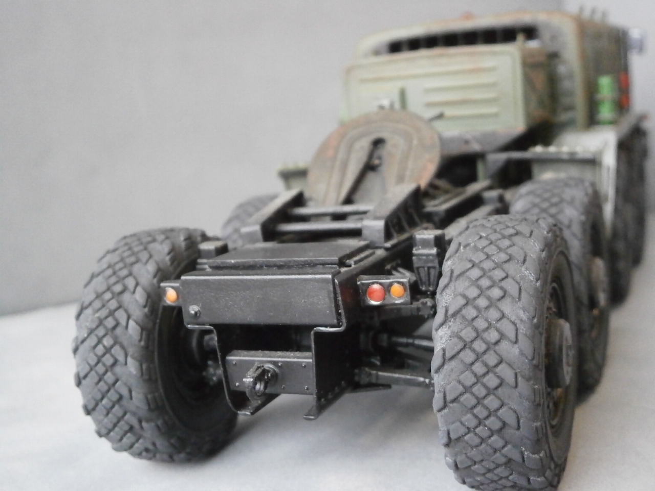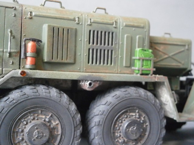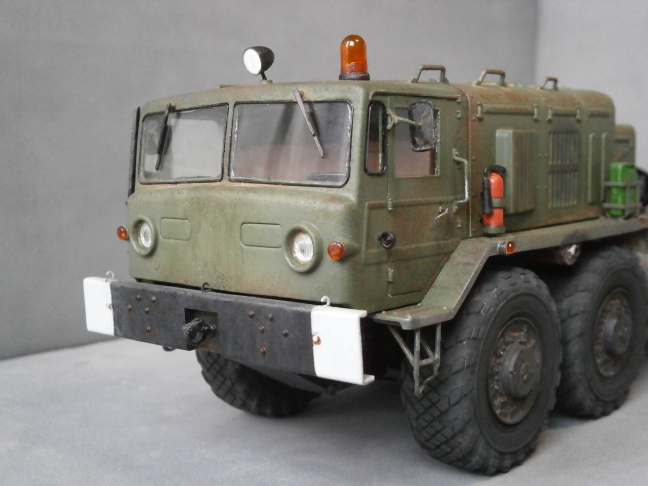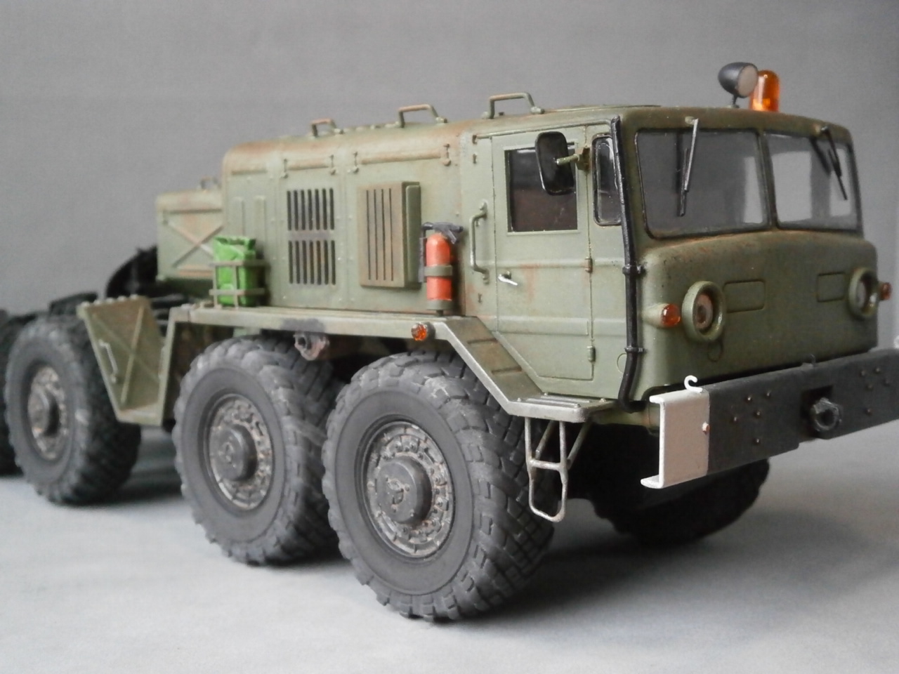 Вот решил перекрасить собранный давным-давно "МАЗ".Покрашен он был из баллончика нитрокраской,аэра у меня тогда не было.Ничего не исправлял и не добавлял,ходовую не трогал вообще. "Верхи" отмыл в "тормозухе" и банально задул аэрографом. Цвет тоже "мой",смешал остатки краски из всех баночек.