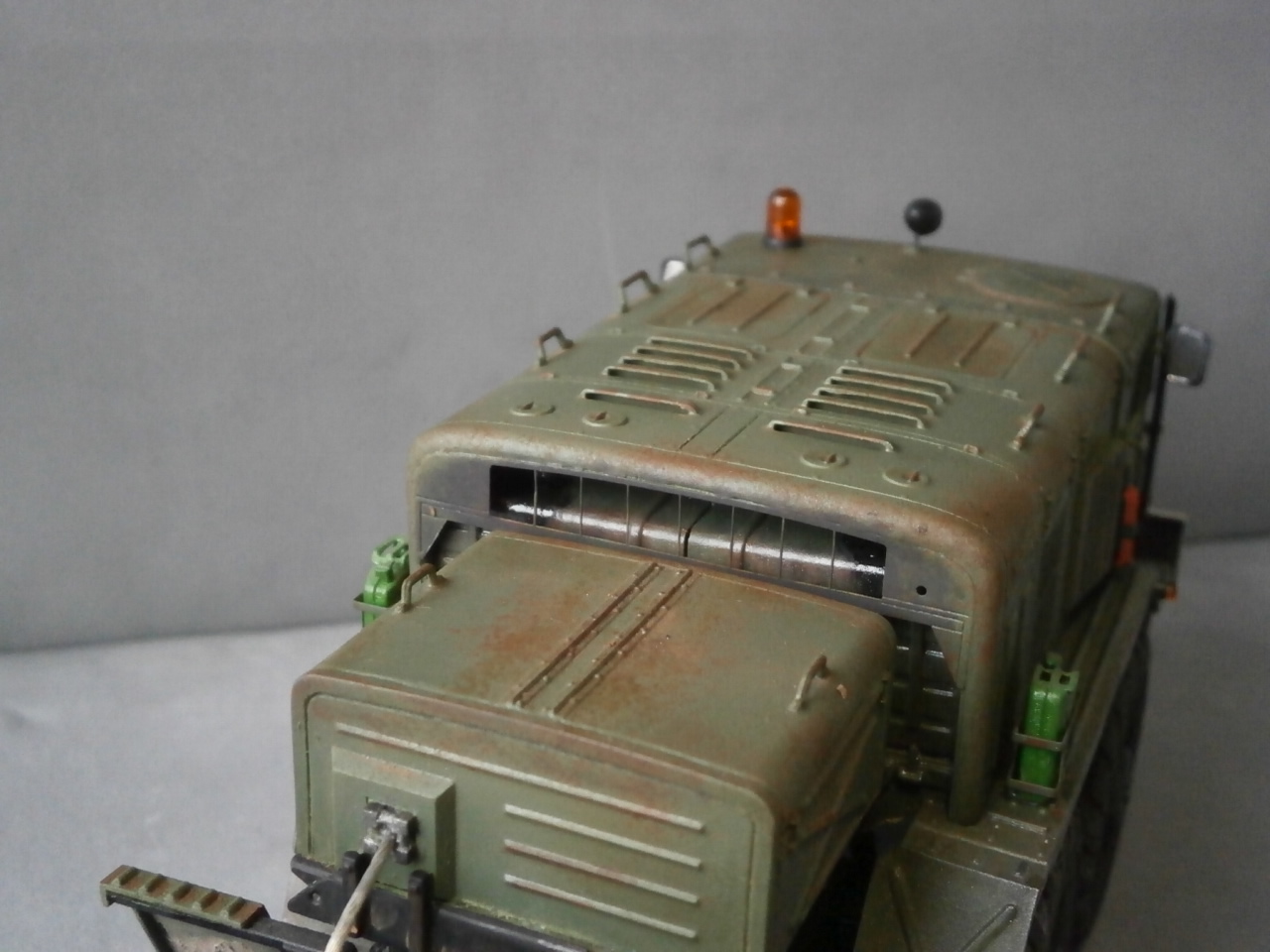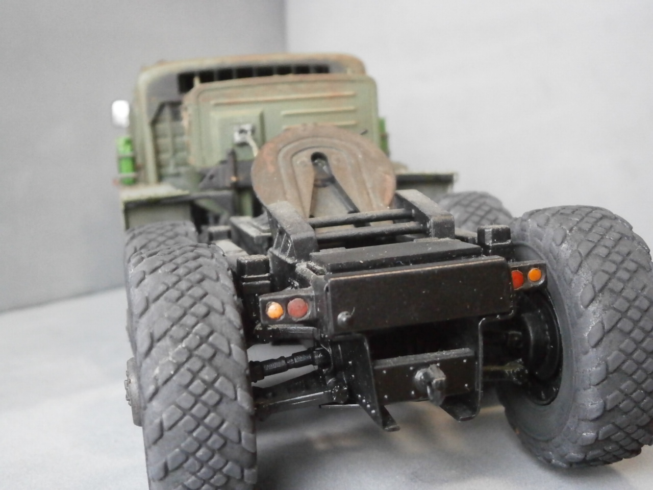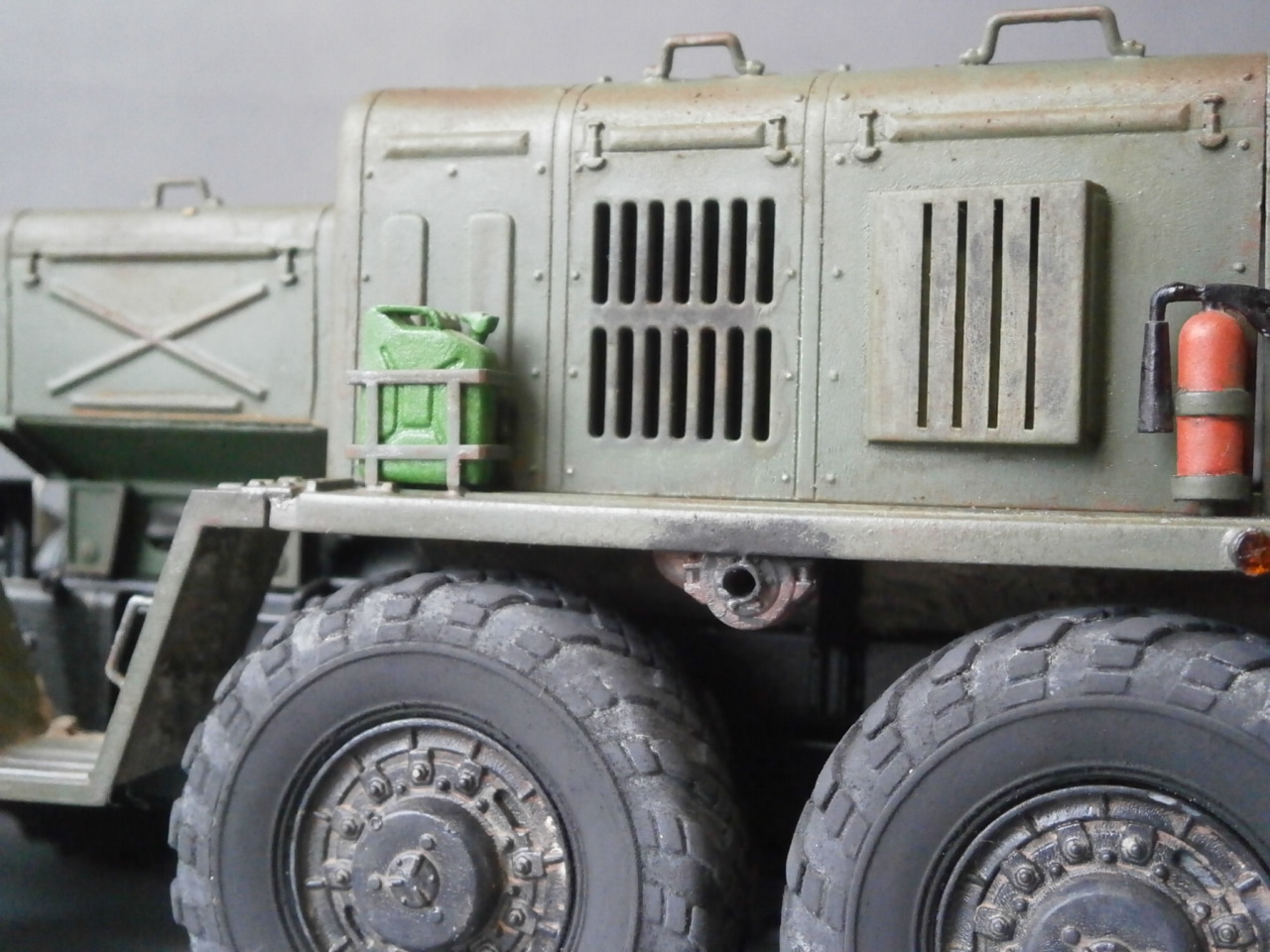 Вот решил перекрасить собранный давным-давно "МАЗ".Покрашен он был из баллончика нитрокраской,аэра у меня тогда не было.Ничего не исправлял и не добавлял,ходовую не трогал вообще. "Верхи" отмыл в "тормозухе" и банально задул аэрографом. Цвет тоже "мой",смешал остатки краски из всех баночек.