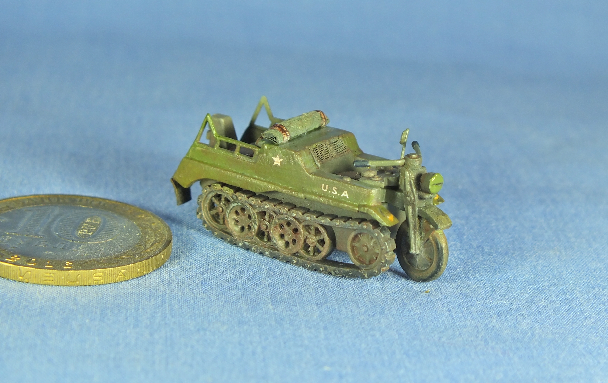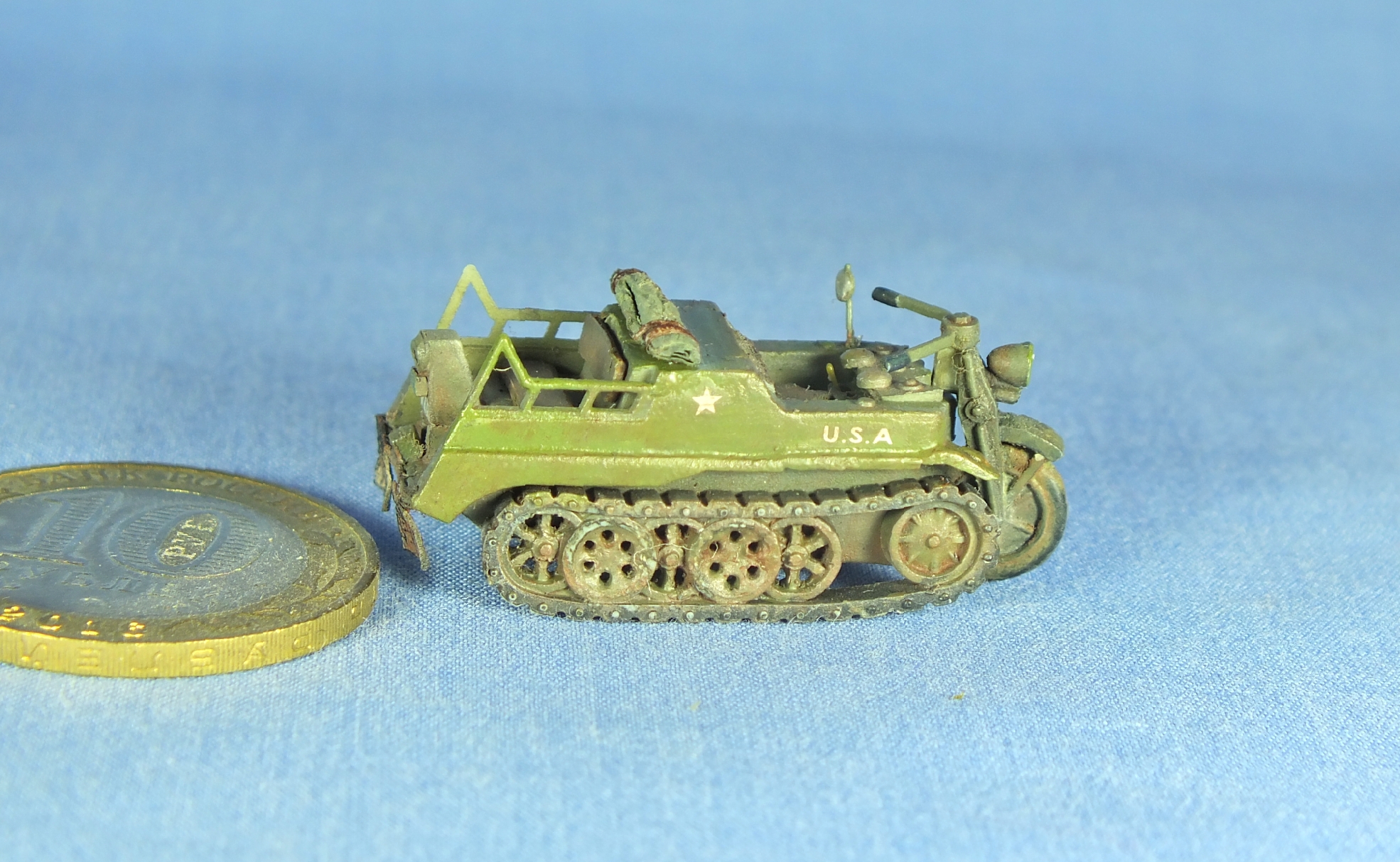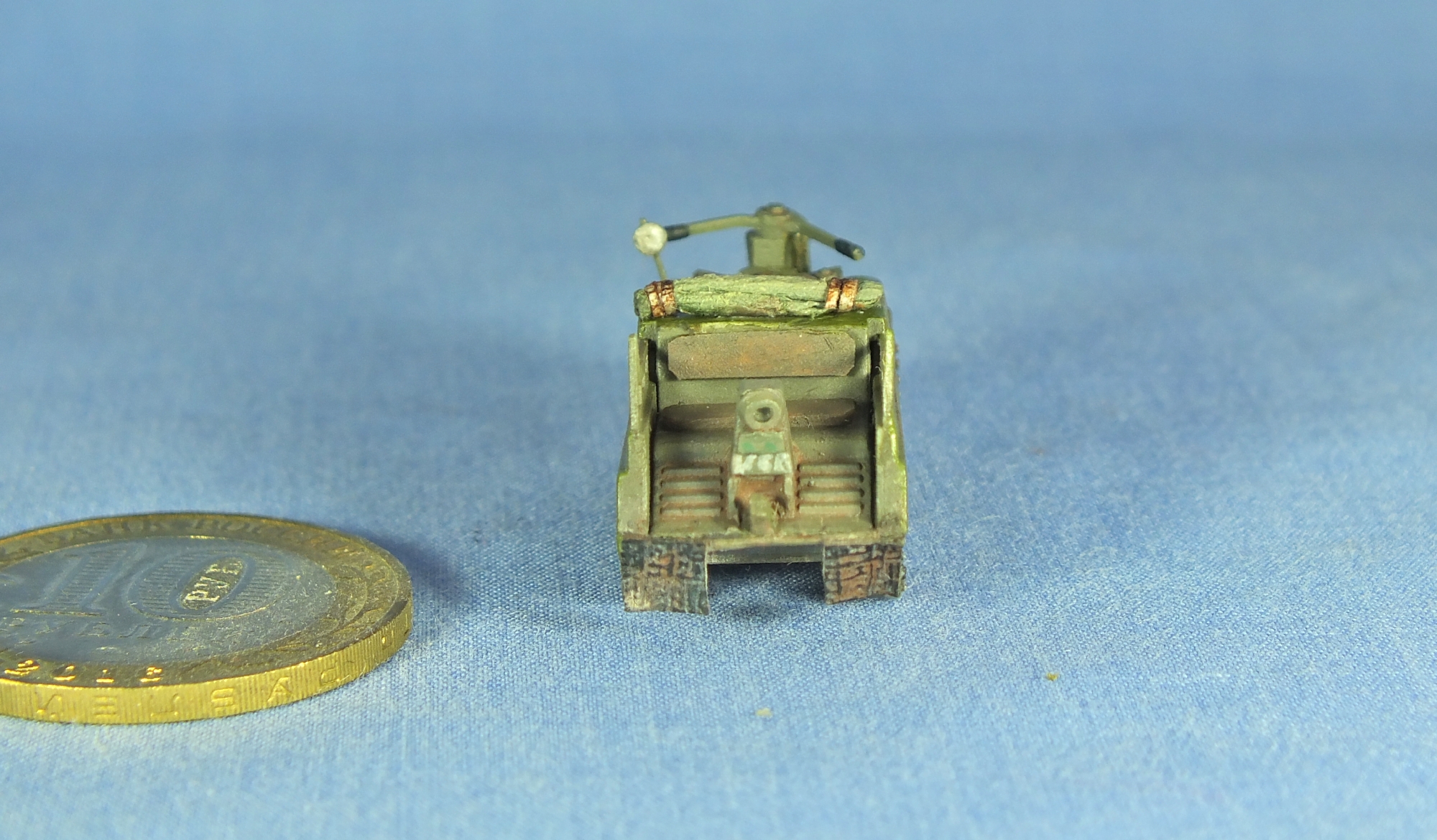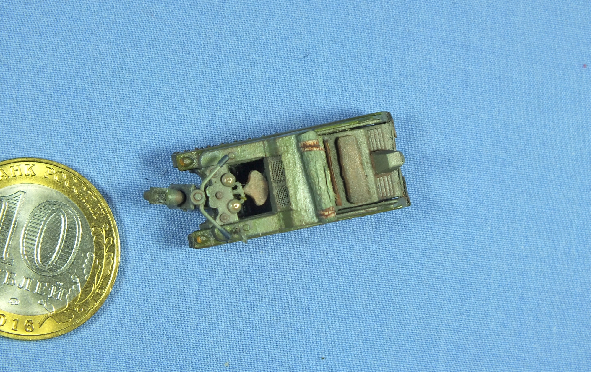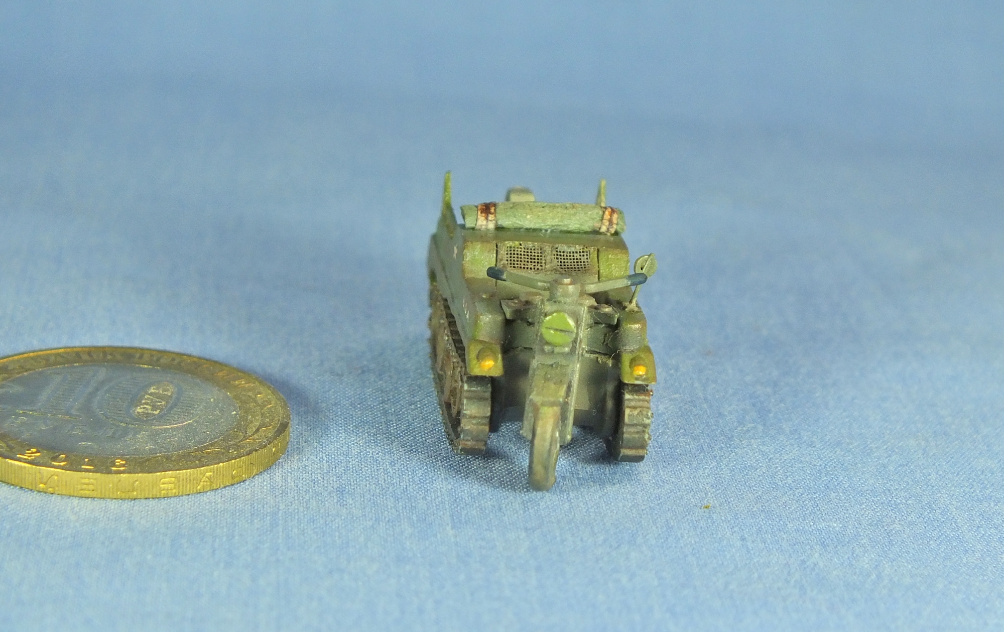 Колесо запылил, вроде зелень ушла, проволоку заменил. Брызговики были, но тонкие, под ширину гусеницы и потому сливались, заменил на более широкие.