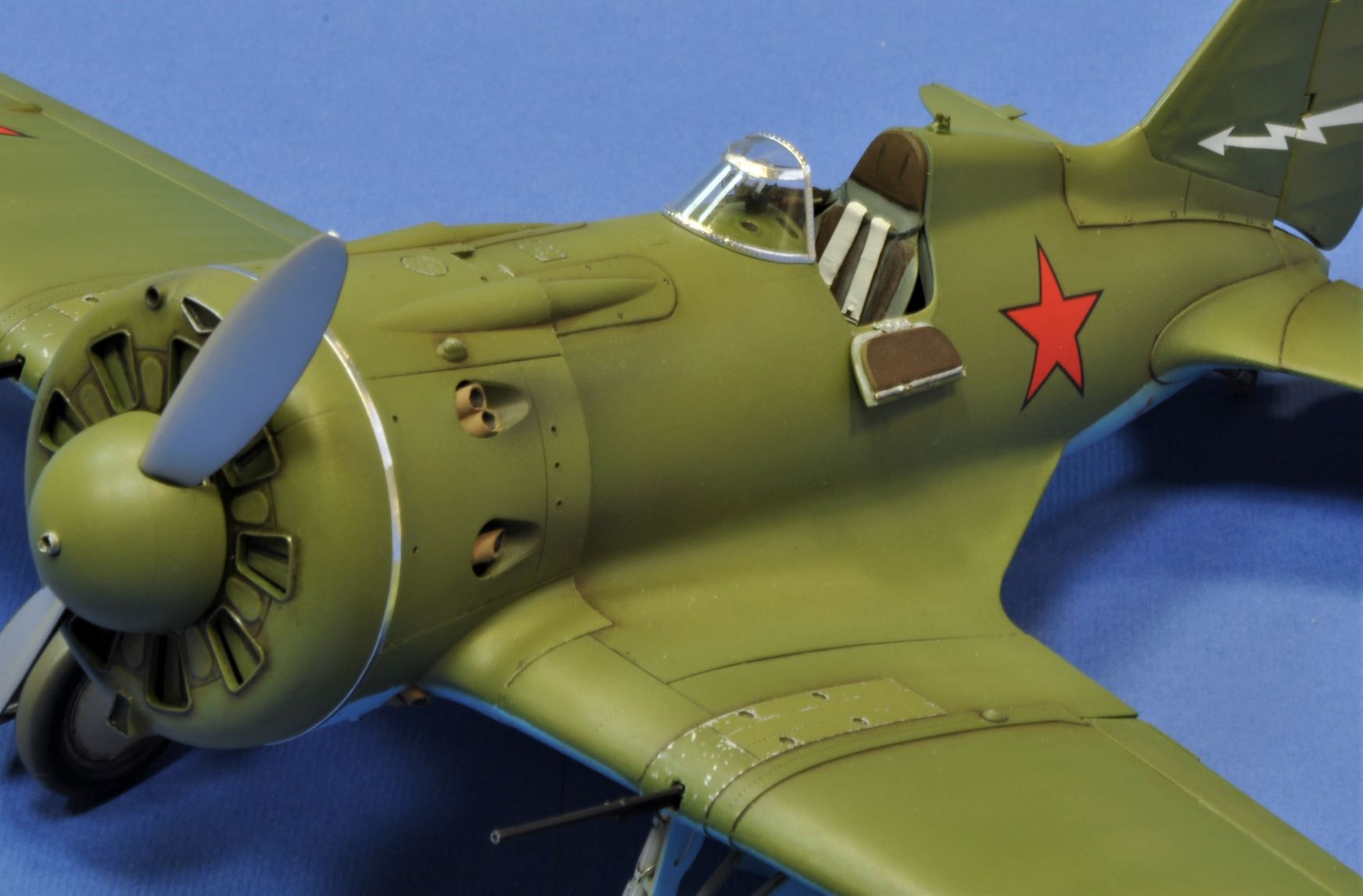 Модель в сборке очень хороша. Потребовалась лишь небольшая доработка кабины и стоек шасси. Единственным "узким" моментом набора стали слишком мелкие патрубки. Диаметр был явно не для 32-го масштаба. Сделал их заново из ушных палочек. Еще пришлось шпаклевать стыковочный шов детали верхней части фюзеляжа от кабины до капота. На настоящем самолете этого шва не было.
