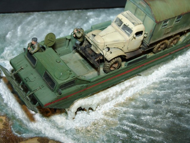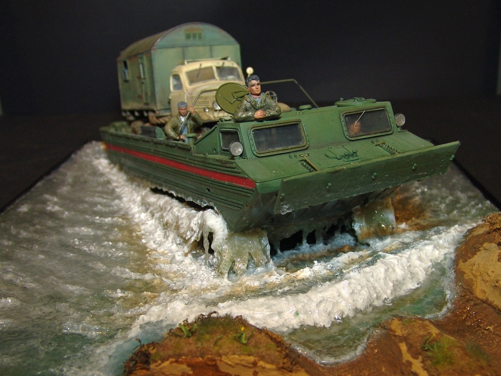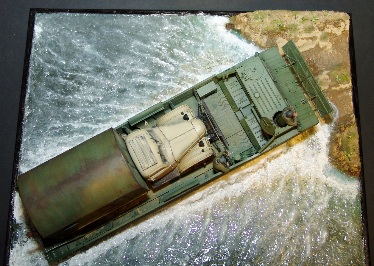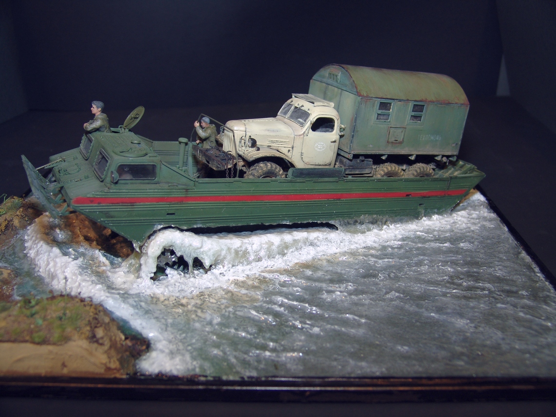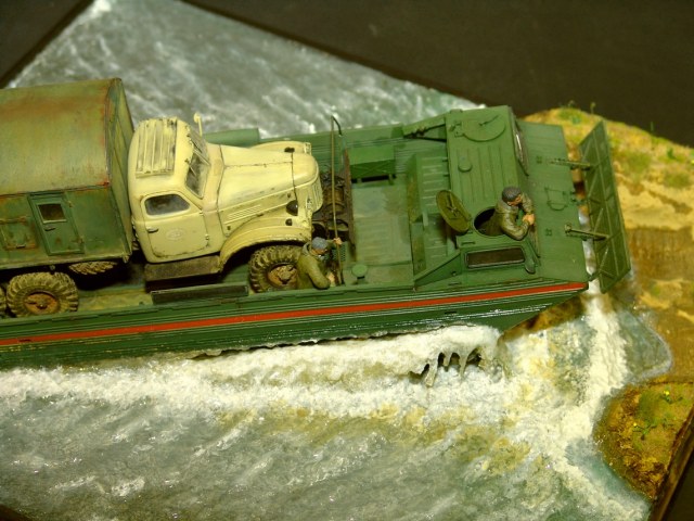 В любом случае, работа получилась живая! Техника (и плавсредство, и автомобиль) - шикарны. Даже если есть замечания к стекающей воде, то расходящиеся волны очень натуральны. Роспись фигурок тоже хороша!