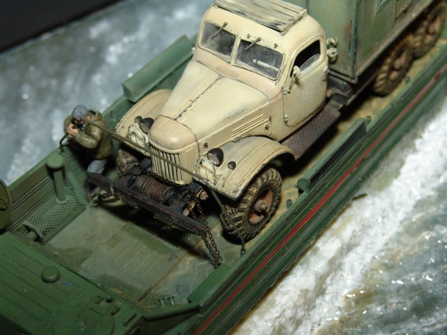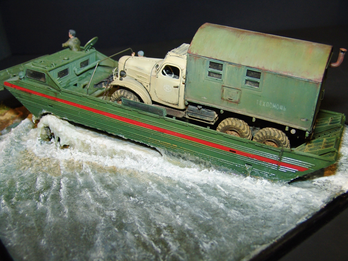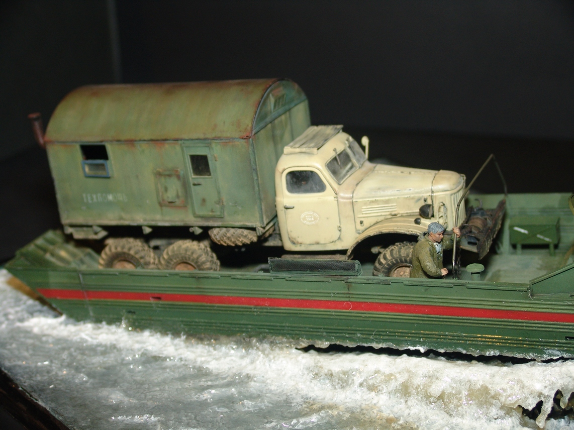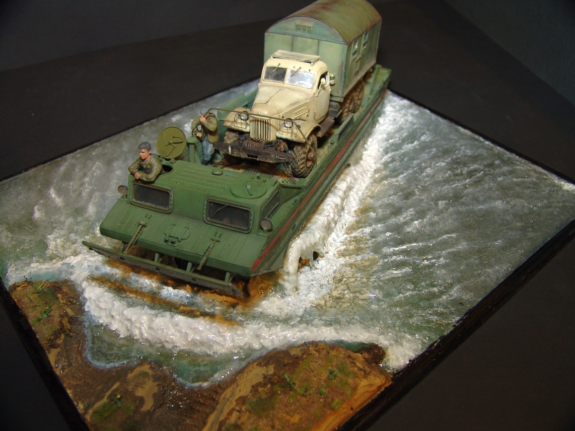 В любом случае, работа получилась живая! Техника (и плавсредство, и автомобиль) - шикарны. Даже если есть замечания к стекающей воде, то расходящиеся волны очень натуральны. Роспись фигурок тоже хороша!