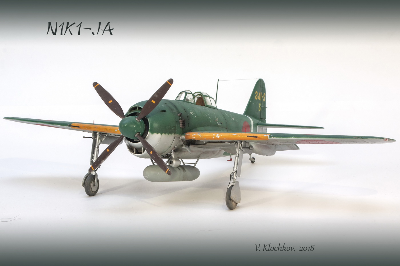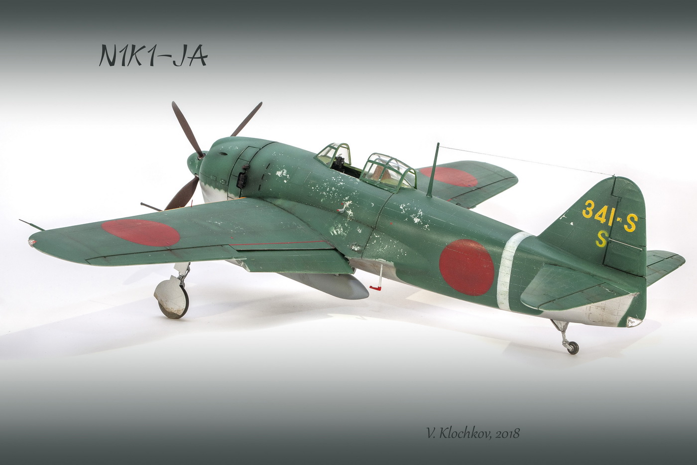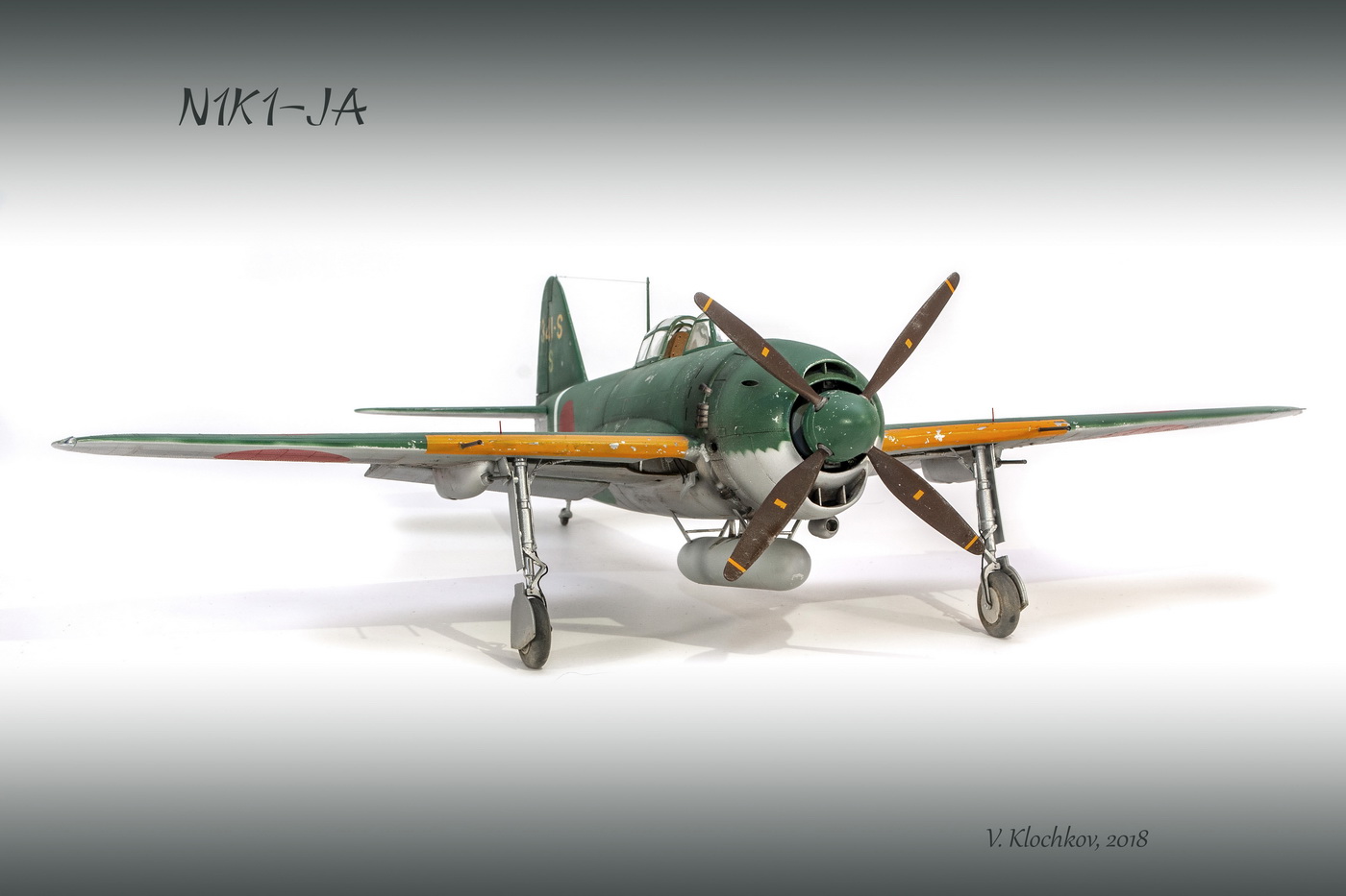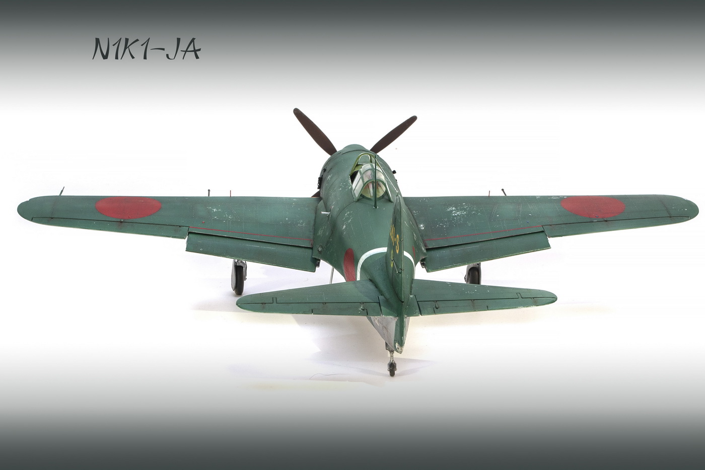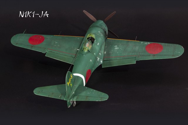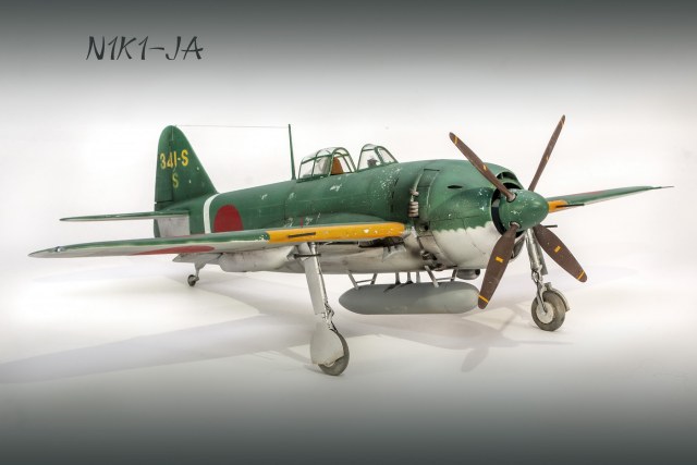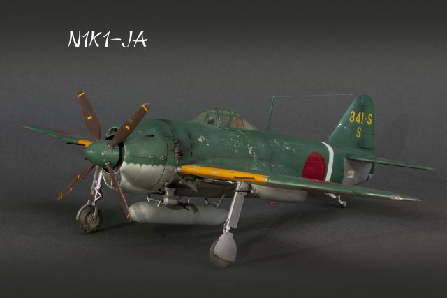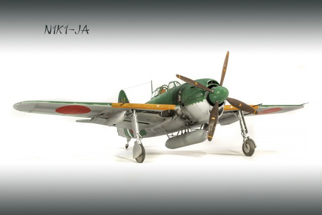 Краски все мешал сам. Для палитры использовал краски АКАН, литературу и информацию из интернета, что нашёл . Самолёт не стал сильно старить и обдирать, старался ориентироваться на фото. При покраске использовал соль, при нанесении основного цвета оттенки трёх красок , потом тонировка, масло. Кое-где чуть акварельный карандаш. Работа с моделью получилась достаточно долгой. Возможно из-за того, что часто просто руки опускались и смотреть на модель не мог. Но вроде я победил эту модель. Конечно, результат меня не совсем устроил, возможно это 4( на мой взгляд).Ну как на самом деле судить вам. Как обычно фотосъёмка снова с поиском, но вроде сейчас фото на белом фоне с градиентом верху и снизу смотрятся неплохо. В конце я хочу показать 3 снимка. Когда я делал этот истребитель, всё думал, что вот какой он большой, неуклюжий и толстый. Но сделав, поставил рядом с более поздней модификацией N1K2-J. И смотрю — а следующий то самолёт даже чуть и побольше.