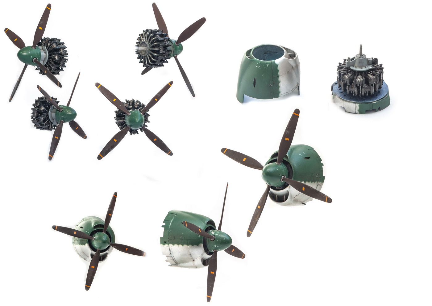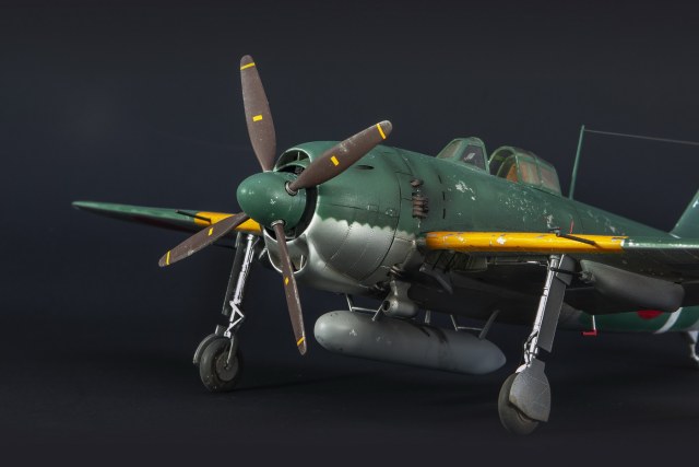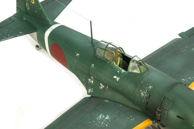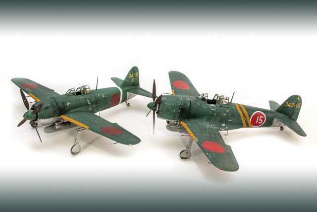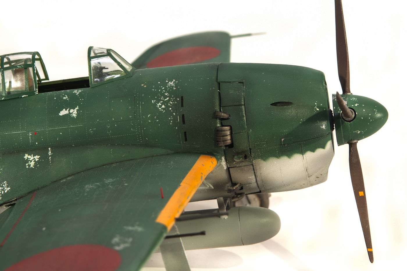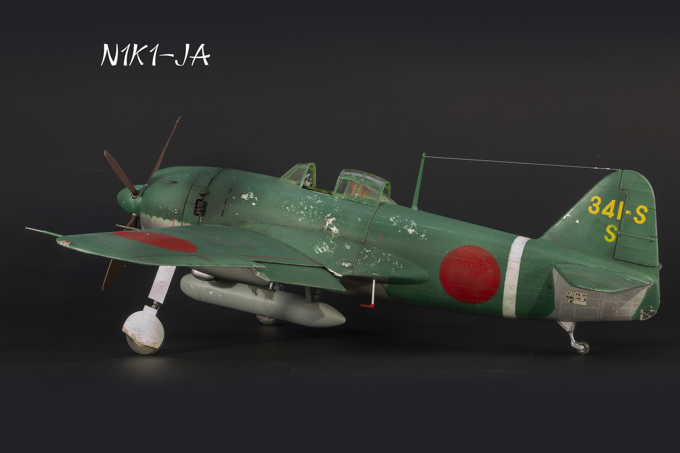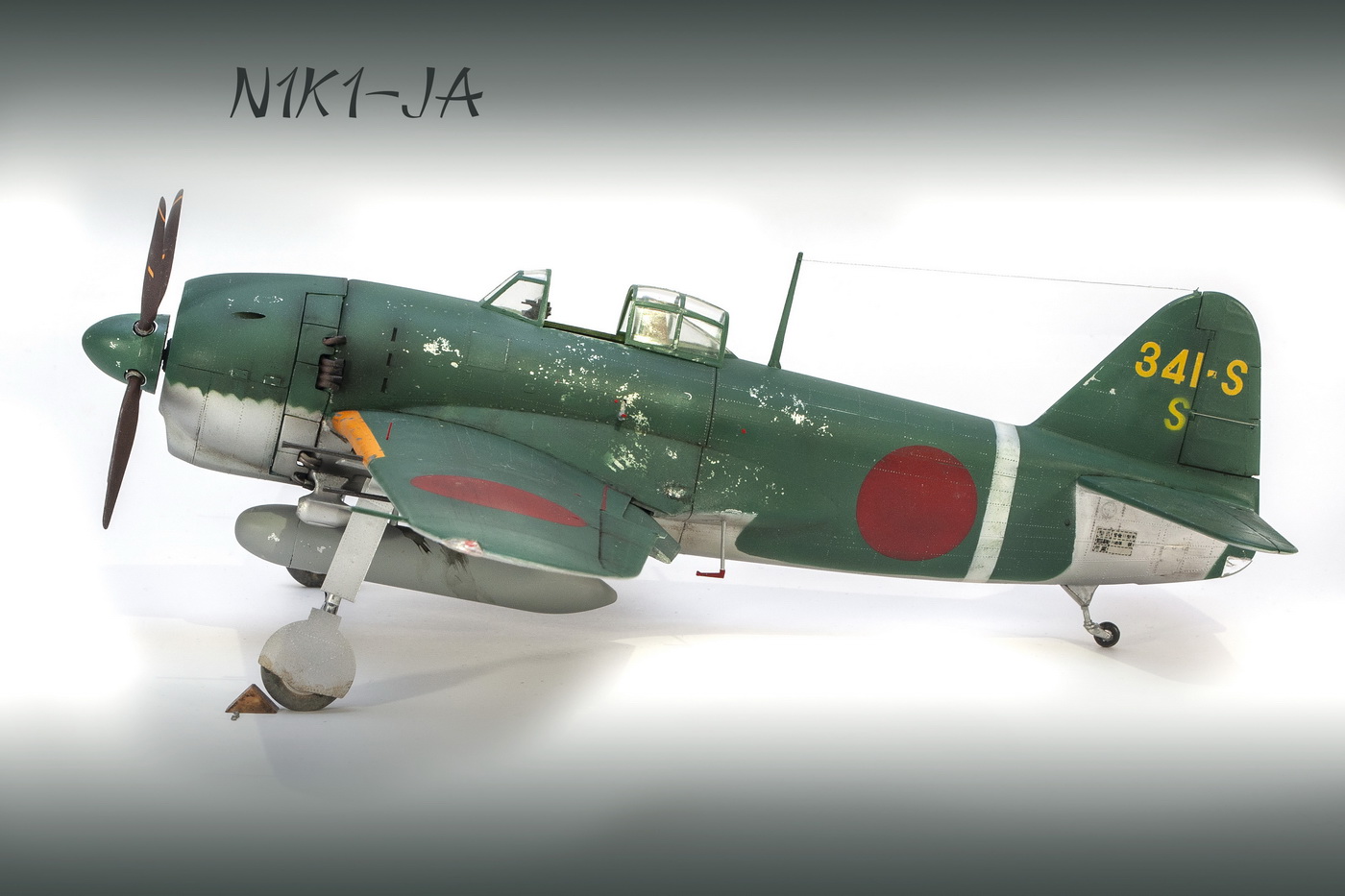 Краски все мешал сам. Для палитры использовал краски АКАН, литературу и информацию из интернета, что нашёл . Самолёт не стал сильно старить и обдирать, старался ориентироваться на фото. При покраске использовал соль, при нанесении основного цвета оттенки трёх красок , потом тонировка, масло. Кое-где чуть акварельный карандаш. Работа с моделью получилась достаточно долгой. Возможно из-за того, что часто просто руки опускались и смотреть на модель не мог. Но вроде я победил эту модель. Конечно, результат меня не совсем устроил, возможно это 4( на мой взгляд).Ну как на самом деле судить вам. Как обычно фотосъёмка снова с поиском, но вроде сейчас фото на белом фоне с градиентом верху и снизу смотрятся неплохо. В конце я хочу показать 3 снимка. Когда я делал этот истребитель, всё думал, что вот какой он большой, неуклюжий и толстый. Но сделав, поставил рядом с более поздней модификацией N1K2-J. И смотрю — а следующий то самолёт даже чуть и побольше.