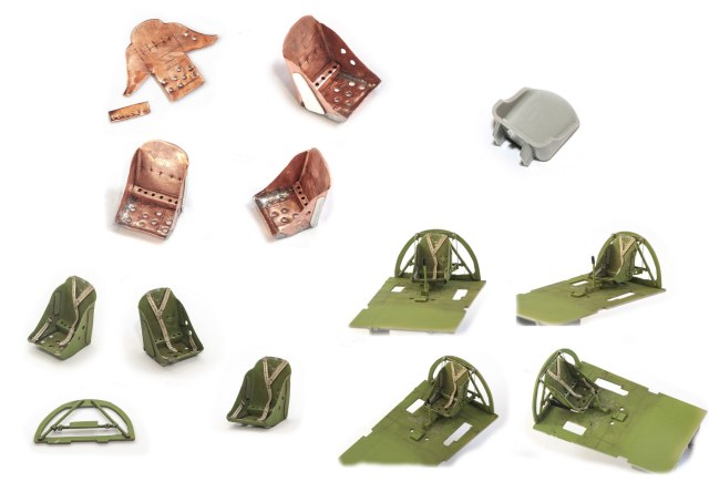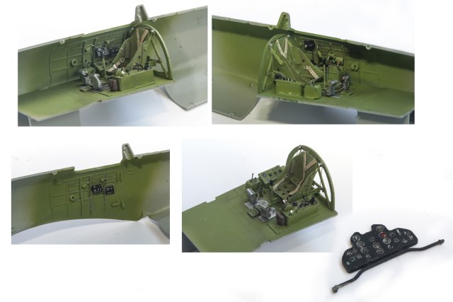 Начал я с двигателя. Сделан он достаточно копийно, но просто и замылен. Правда его и не будет видно практически, даже если захотеть и заглянуть во внутрь капота. Всё аккуратно покрасил, добавил пару трубок, провода свечей. Внутренние всасывающие патрубки сделаны неплохо, хоть они и остаются внутри, а вот наружные выхлопные никакие. Надо доделывать. После двигателя настала очередь кабины. Кабина очень простая 0 грубое кресло и 2 ящика сбоку. Поэтому я решил практически всё ( кроме приборной доски) сделать заново. Кресло спаял из меди, ремни у меня комбинированные — что-то из остатков, что-то самодельное. Вроде получилось. После этого взялся за крылья и ниши. На криле я решил выпустить посадочные щитки. Вроде они идут в модели, но вот крыло под это не сделано. Нужно самому резать и переделывать. Ниш шасси на модели нет вообще. Просто пустая дырка. Пришлось что-то делать по немногим фото. Стойки тоже доделывал. Колёса «подспустил» нагретым паяльником. Небольшие трудности возникли при стыковке частей модели. Первое — сходимость не на лучшем уровне, второе — не хотелось бы портить наружные элементы модели. Поэтому я заклеивал скотчеи всё вокруг швов, оставляя 2-3 мм. Зачищал, и потом накатывал клёпку и расшиву прорезал. Ревитер пластик немного приподнял, тут всё нормально, а для восстановления расшивки я взял сделал резак с кромкой вроде как у колуна. Вроде получилось.