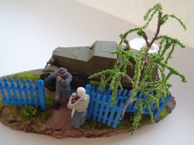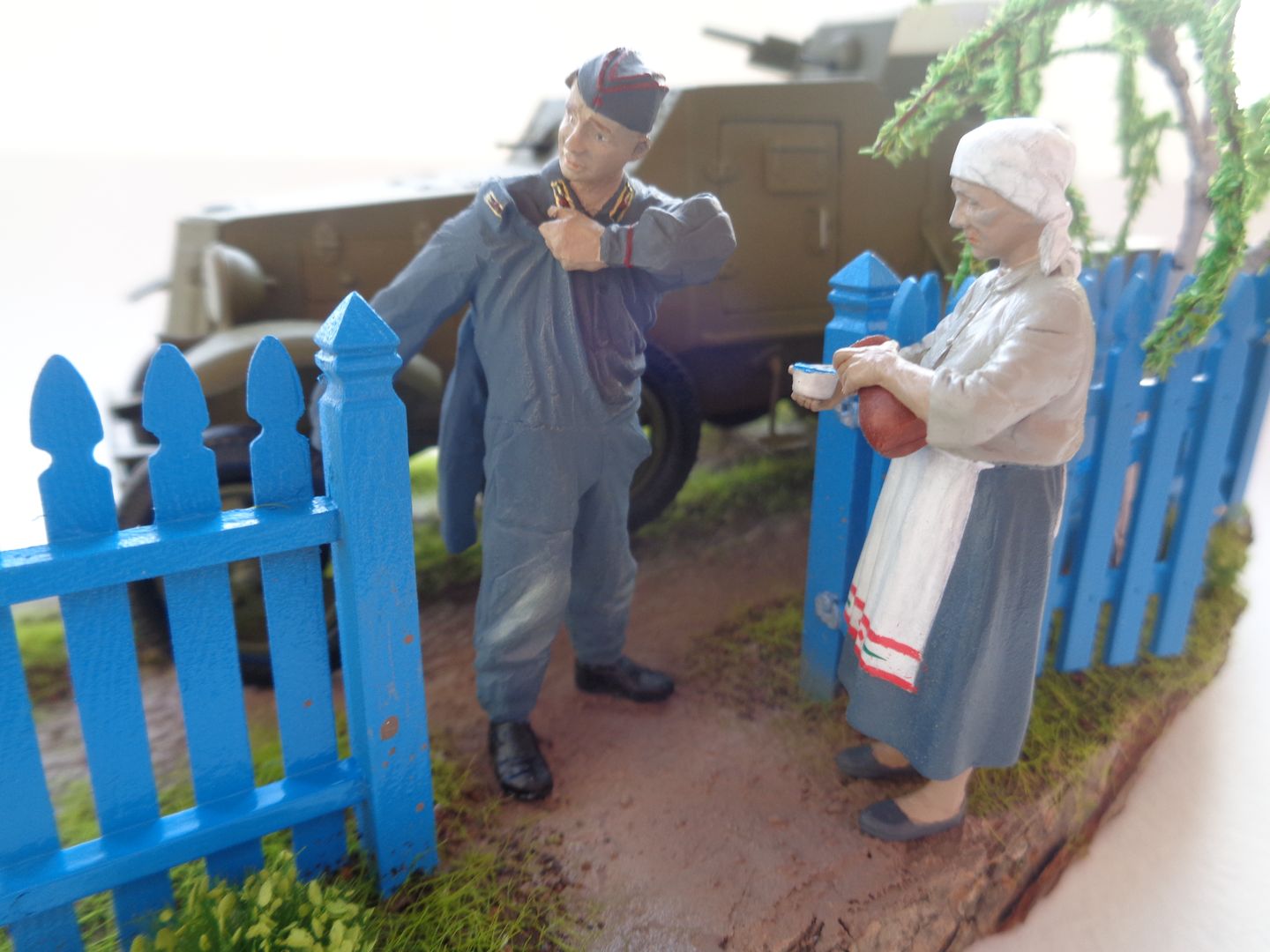 Броневик - восточный экспресс, старушка - masterbox, механик - miniart с головой icm, забор - miniart, береза - самопал.