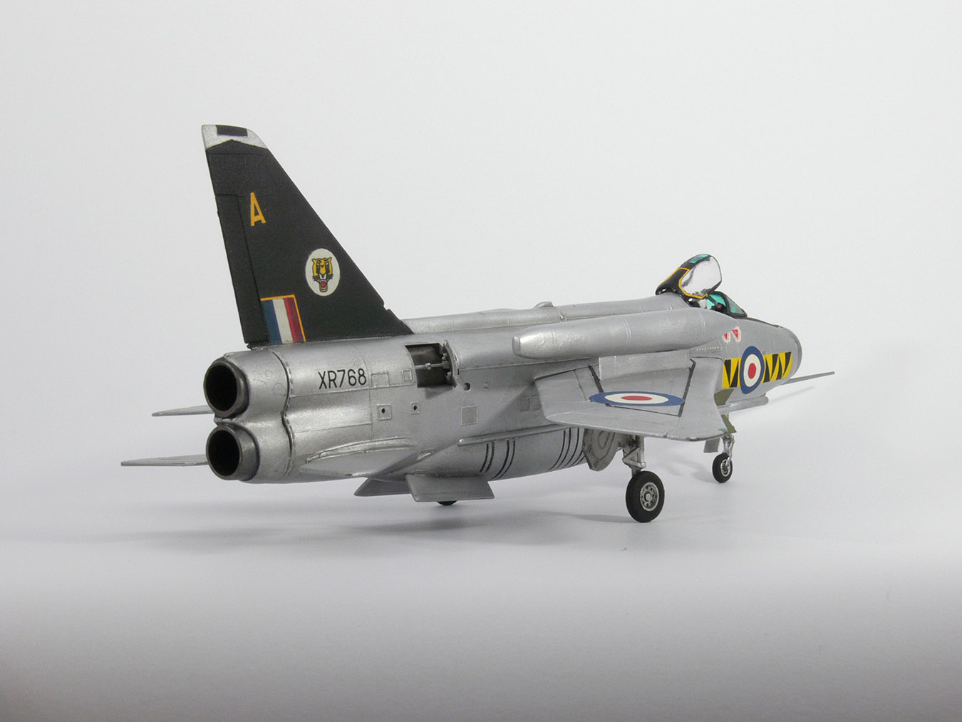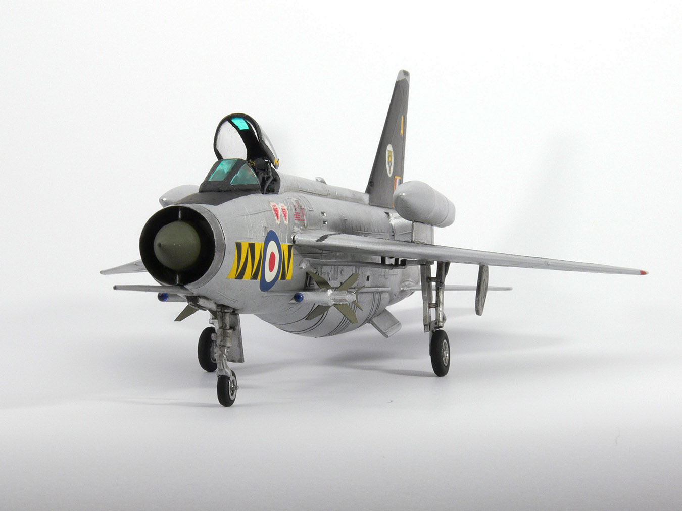 Пожертвовал Lightning из личных запасов, еще в нововской упаковке. Можно сказать, от сердца оторвал :))) В стройку не вмешивался, только швы подчистил. Краска BOSNY Silver показалась мне очень яркой, поэтому слегка приглушили фильтром (масляная краска на уайт-спирите). Мишка переводил декали сам, а потом позвал меня посмотреть - некоторые поправить уже не удалось, поэтому буква "А" на хвосте по правому борту слегка перекошена. По прототипу эти буквы на хвосте должны быть желтыми, а декали в наборе - белые. Поэтому, поверх белой декали прошлись желтой краской. С помощью масок подкрасил желтые полоски вокруг триколора и изоляцию на фонаре. Декали кстати очень плотные - переводятся легко, не рассыпаются, но практически не возможно их приварить. Лакировать металлик мне не хотелось. Поэтому при дальнейшей работе с масками, декали остались на скотче. Новые декали мне достать не удалось и пришлось заказывать новую модель (благо не дорого стоит).