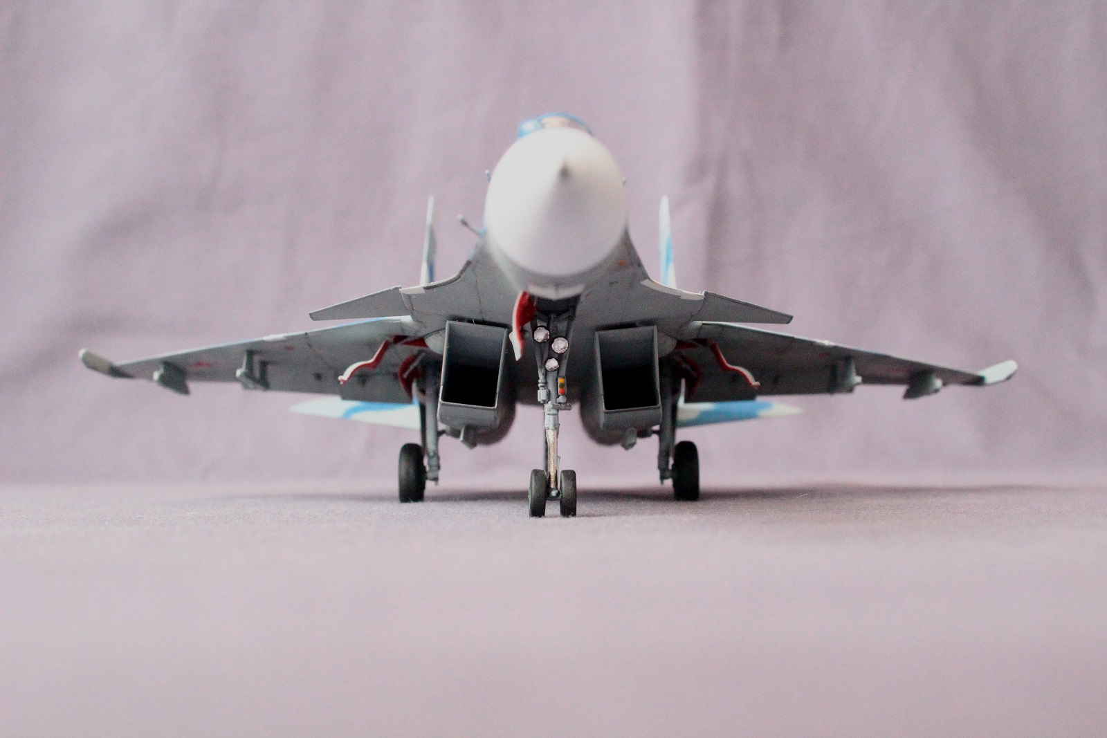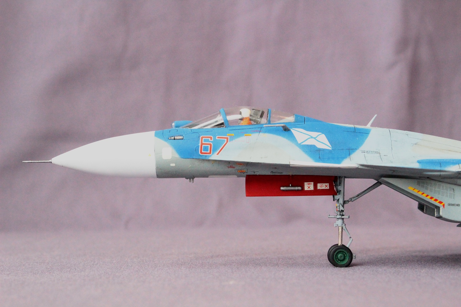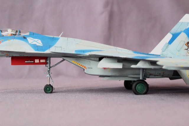 3. Вот Вам надо всего и без хлеба - и стойка носовая раскрытая на максимум, и гак выпущен. Тут или взлет, или посадка. Если гак выпущен, то стойка обжатая должна быть, и на оборот. Изза этого самолет визуально на хвост присел, что очень для семейства Су-27 не характерно.
