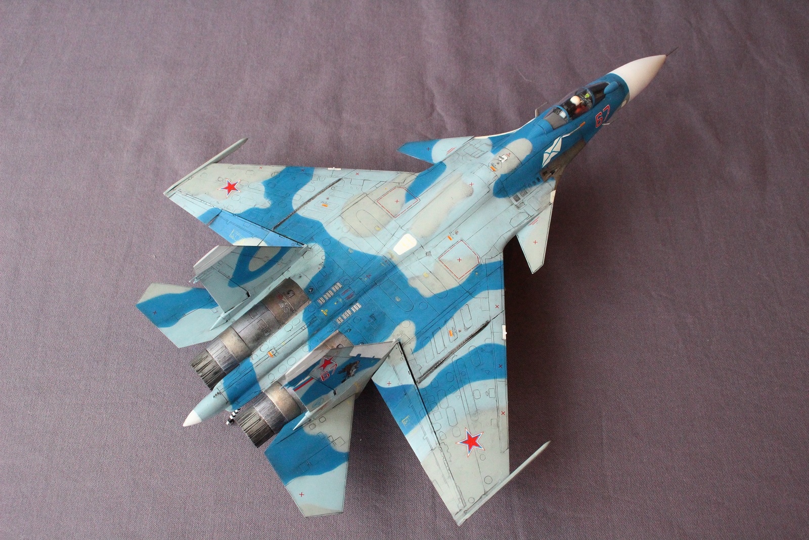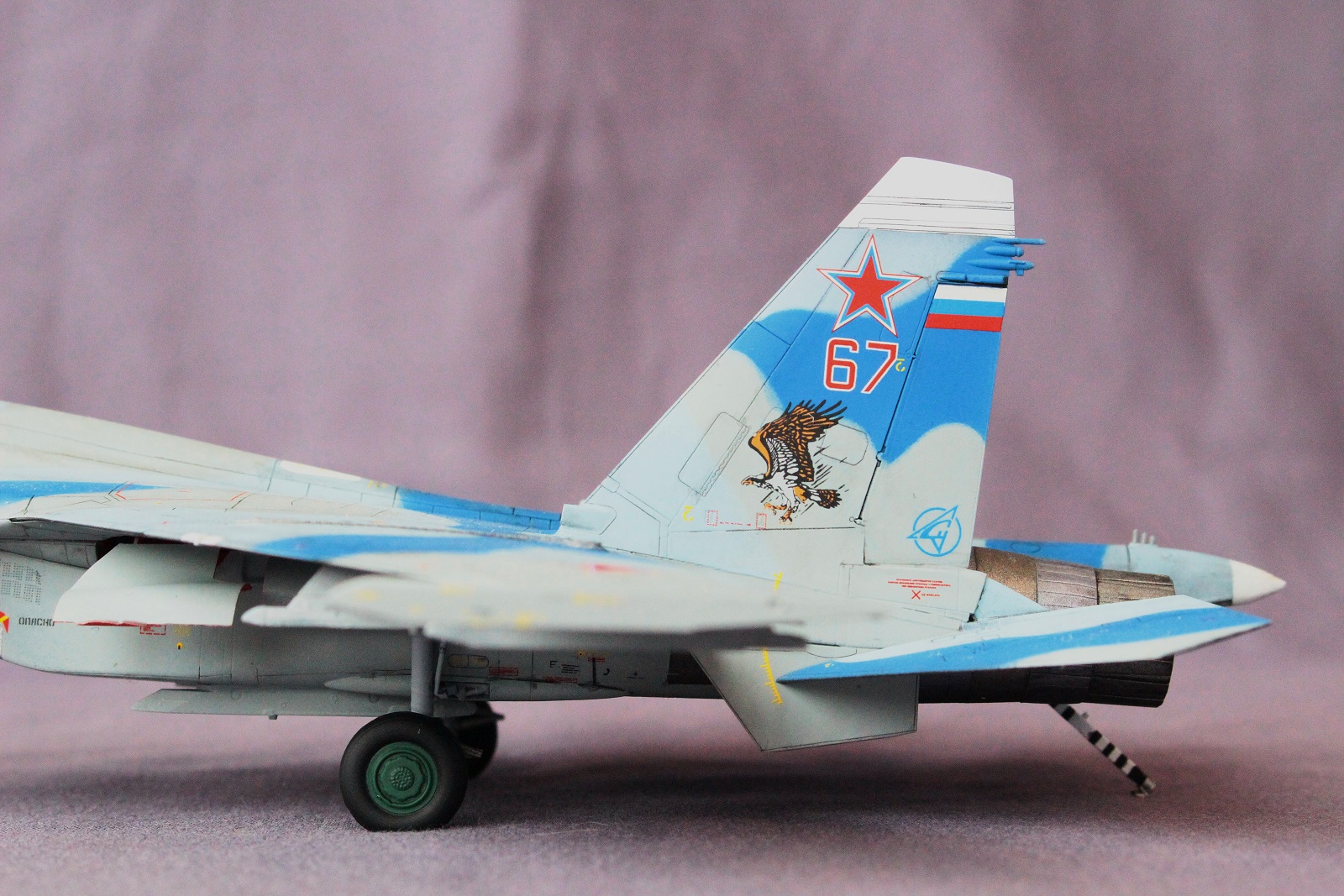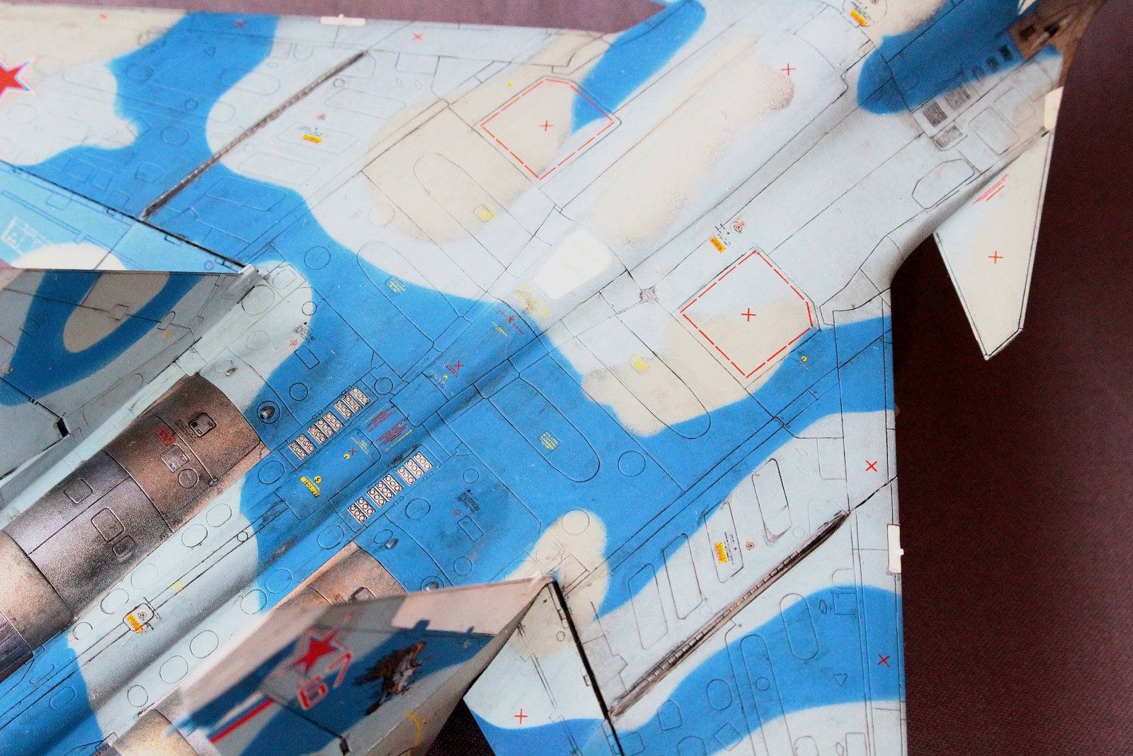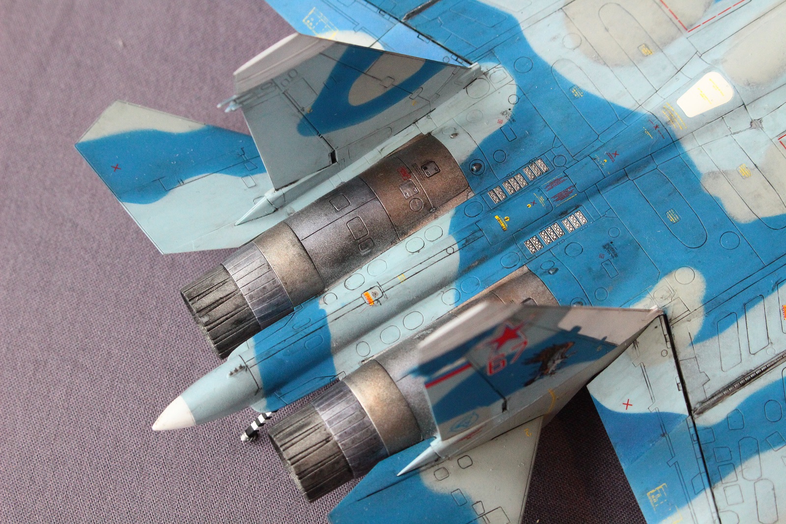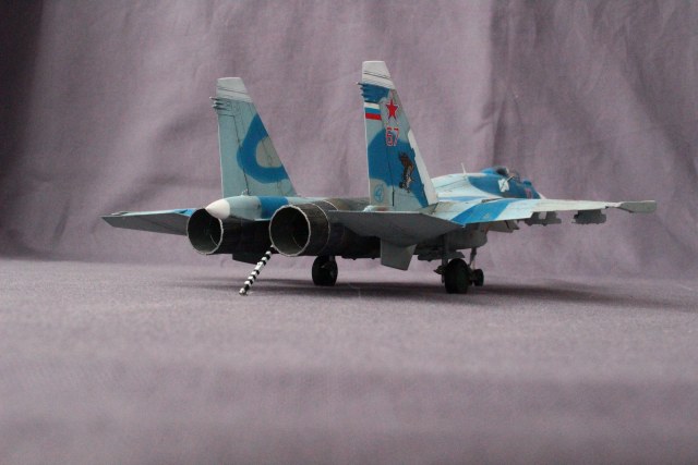 По покраске, на мой взгляд в цвета я не попал, да и схема камуфляжа у меня вышла собирательной и не совсем соответствует данному борту. Краски использовал разные: Revell, Tamiya, Акан, Звезда. Жаропрочные панели и сопла красил Пасификом 88. Лаки- Revell , смывка- скипидар с маслом.