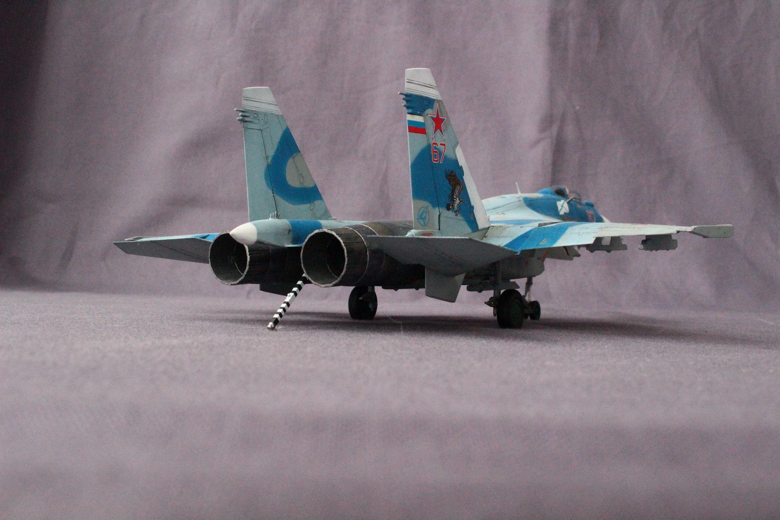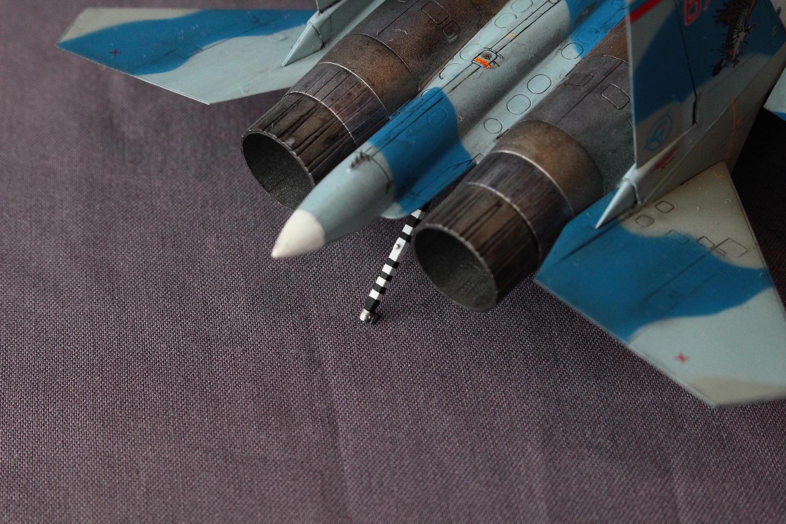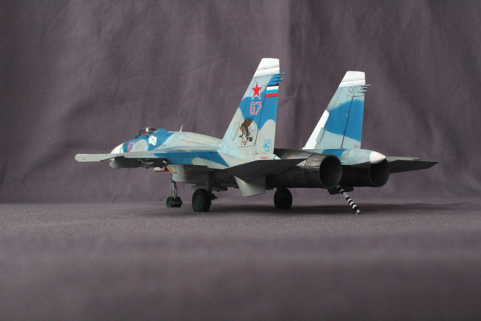 По покраске, на мой взгляд в цвета я не попал, да и схема камуфляжа у меня вышла собирательной и не совсем соответствует данному борту. Краски использовал разные: Revell, Tamiya, Акан, Звезда. Жаропрочные панели и сопла красил Пасификом 88. Лаки- Revell , смывка- скипидар с маслом.