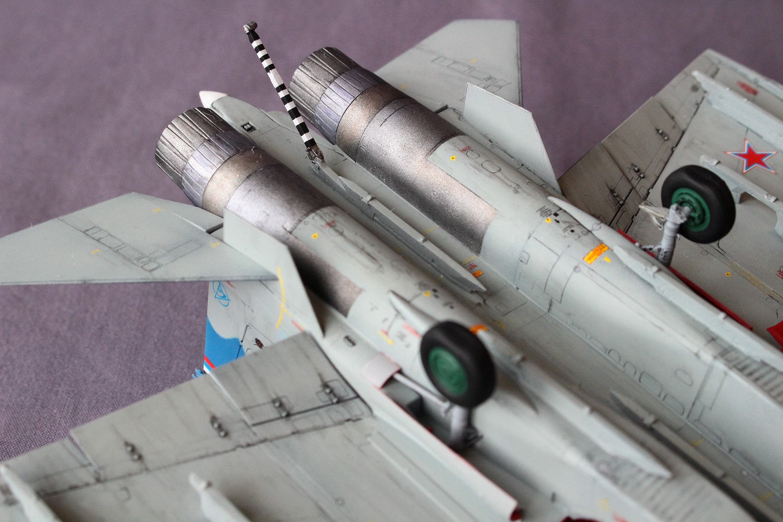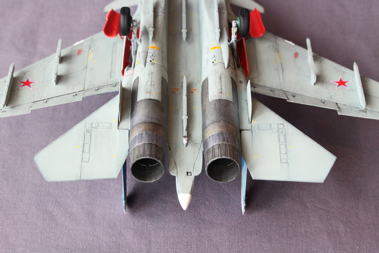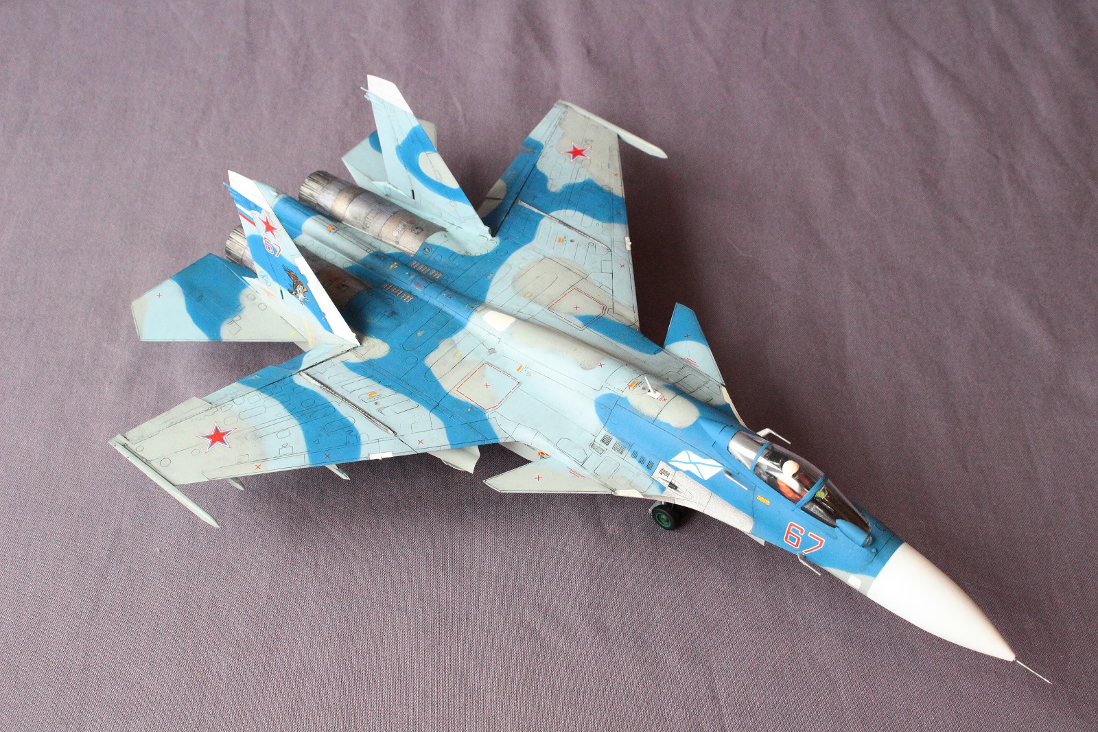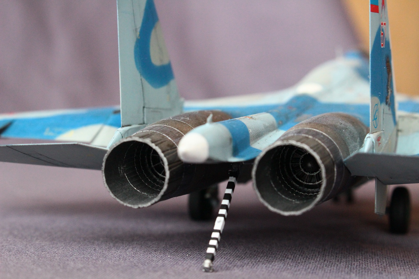 По покраске, на мой взгляд в цвета я не попал, да и схема камуфляжа у меня вышла собирательной и не совсем соответствует данному борту. Краски использовал разные: Revell, Tamiya, Акан, Звезда. Жаропрочные панели и сопла красил Пасификом 88. Лаки- Revell , смывка- скипидар с маслом.