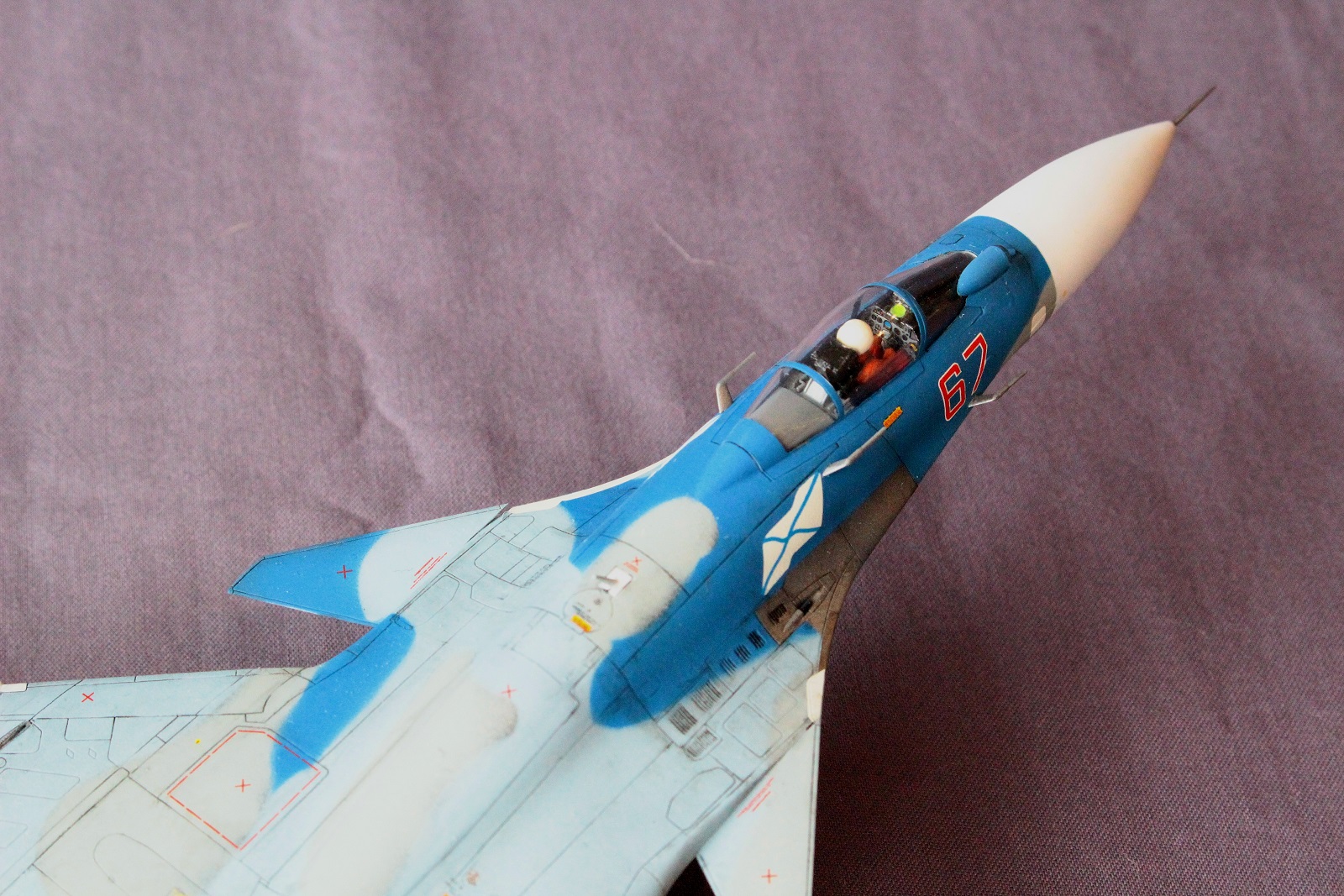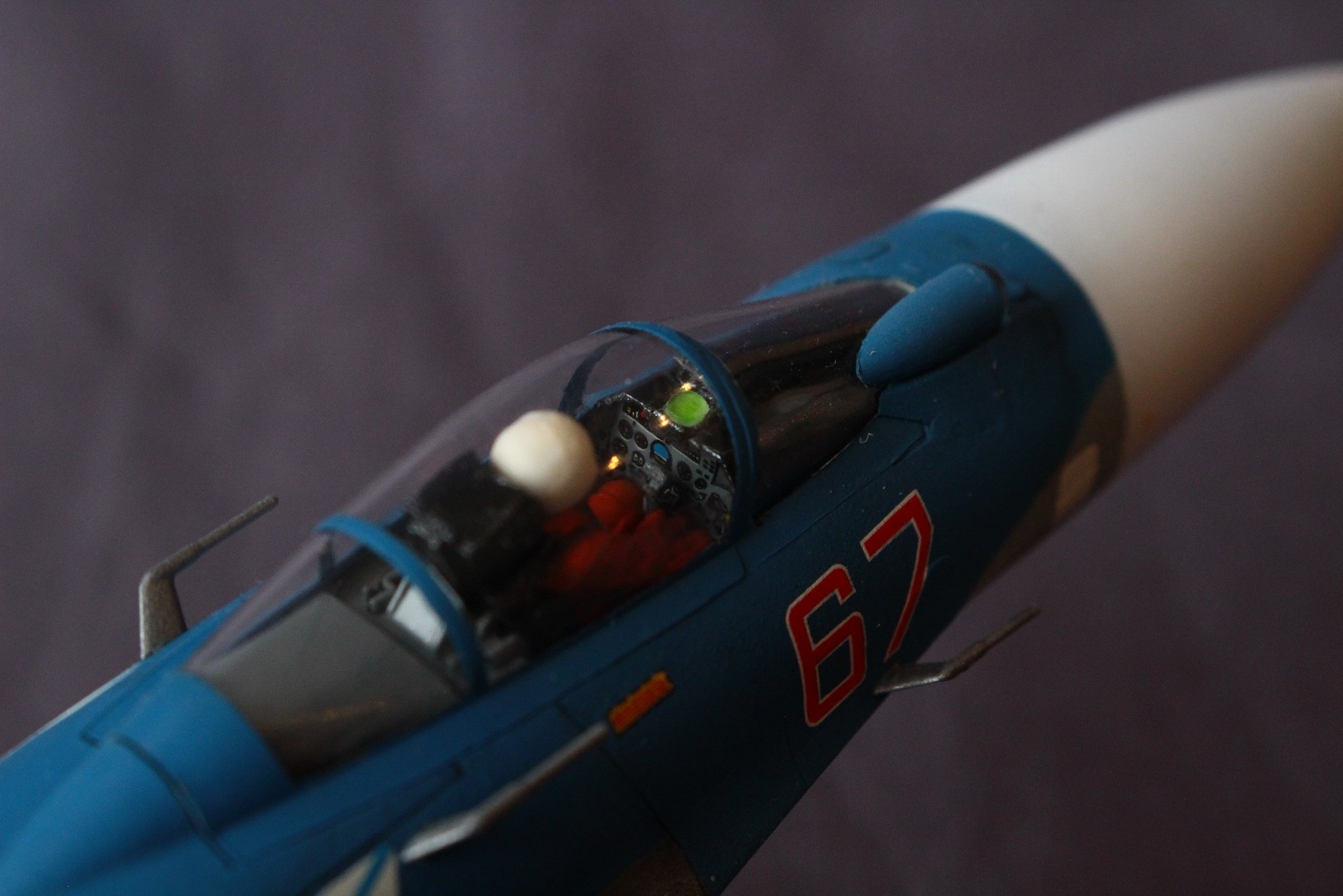 Выбор конфигурации самолета не занял много времени. Очень понравилась фотография жесткой посадки самолета после отказа корабельной системы посадки "Луна-3"(фото в самом конце). Далее вся сборка проходила с оглядкой на эту фотографию. Первым делом удлинил носовую стойку шасси, отрезал со стойки пластиковый шток и заменил его удлиненным металлическим, тем самым сымитировав длину разгруженной стойки. Основные стойки наоборот были укорочены до длины полного обжатия. Потом под нож пошла механизация крыла, флапероны были отделены от закрылков, "Звезда" почему то делает их одним элементом. Горизонтальное оперение так же пришлось резать и склеивать заново в нужном мне положении как на фото, так как производитель предлагает собрать его только в одном положении (назовем его нейтральным). Носок крыла я не стал резать и отклонять, так как не был уверен в успехе данной операции. Далее был интересный момент с кабиной, все отлично склеилось, но с сидящим в кресле пилотом, фонарь упирался ему в голову и не прилегал плотно к фюзеляжу, пришлось подрезать на пару миллиметров "пятую точку" пилоту.