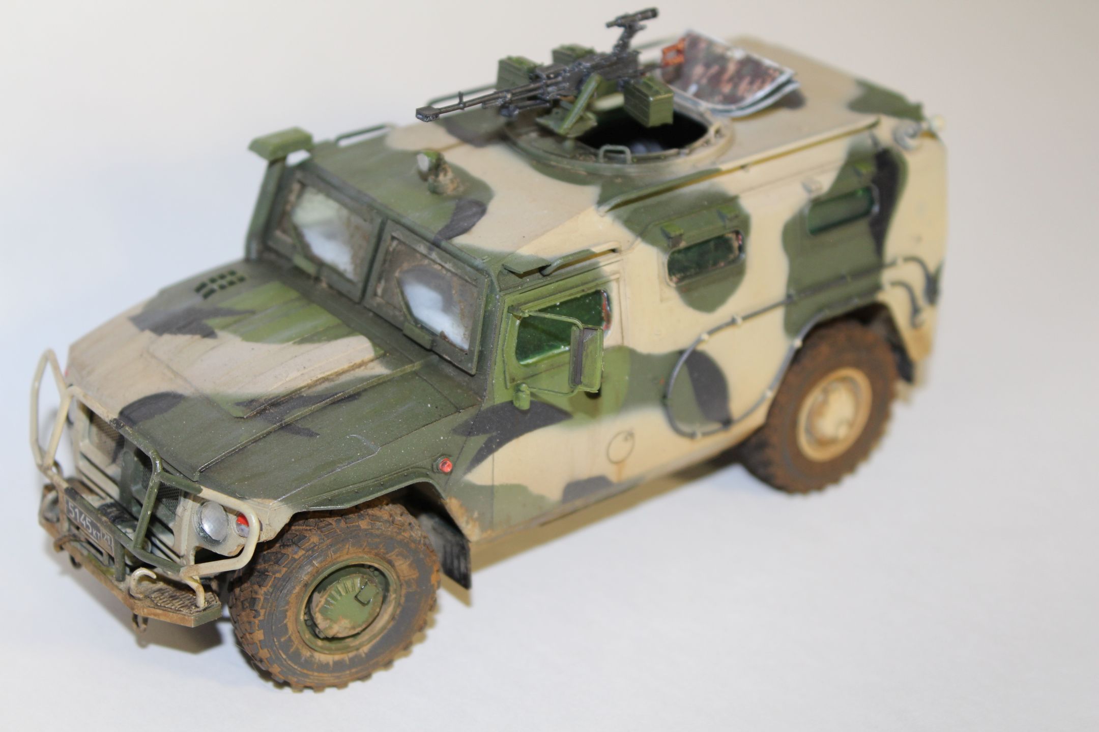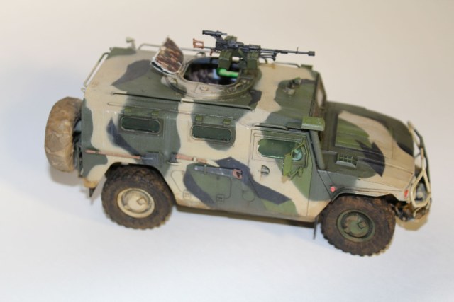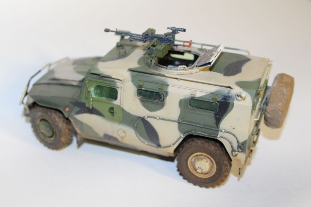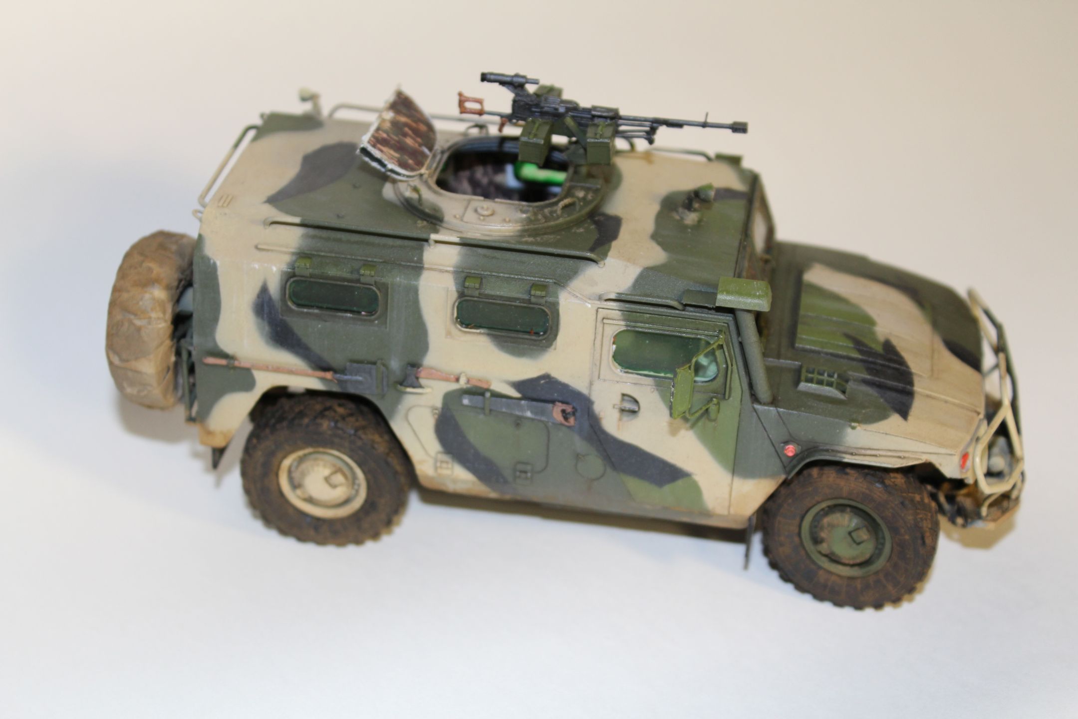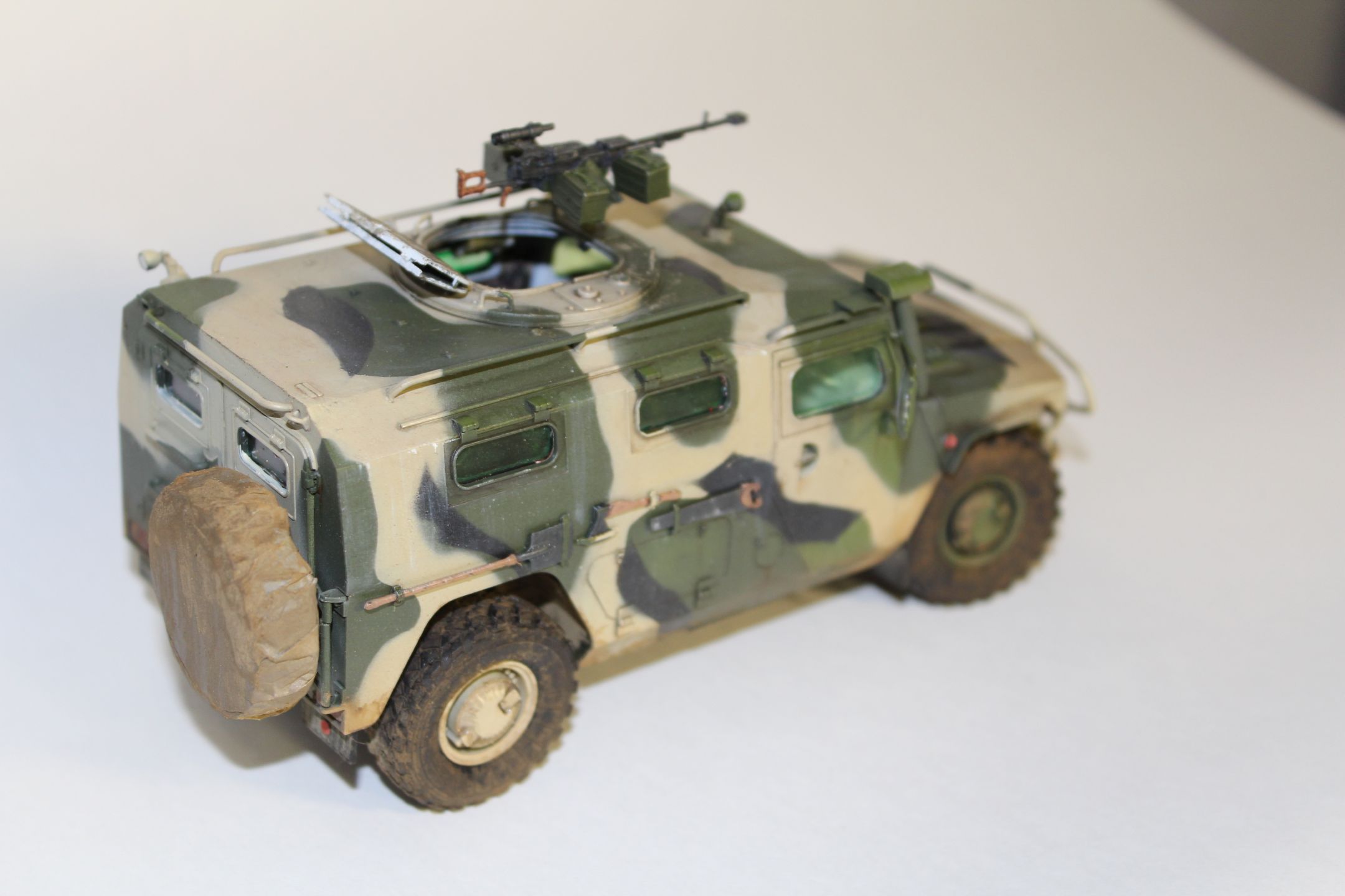 По прототипу ничего не скажу - в матчасть не лез. сборка практически изкоробочная, замене подверглось только вооружение, заменил штатное на Корд от Life Resin. Из незначительных доработок можно назвать пересадку фар и чехол на запаску.