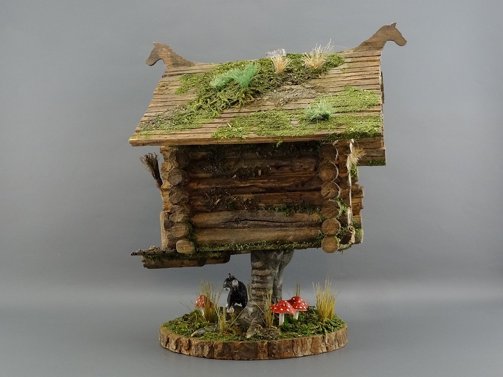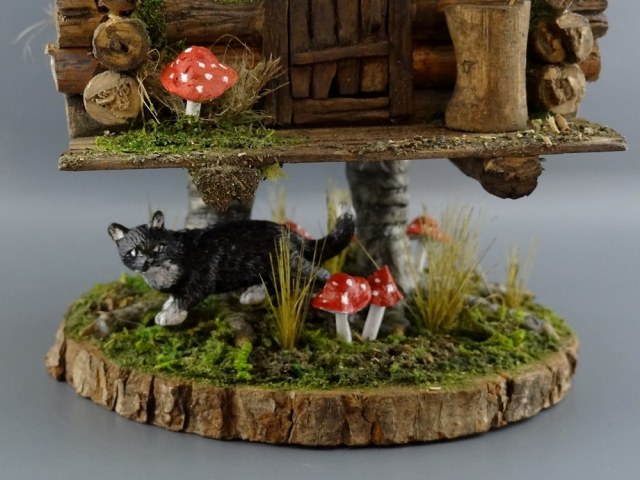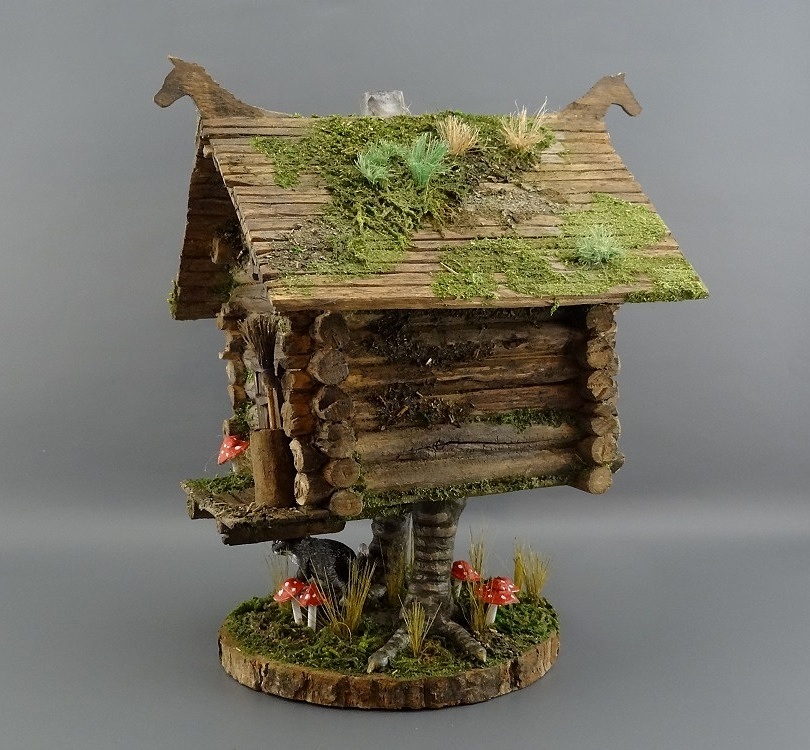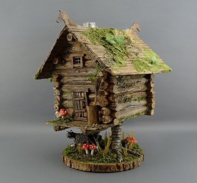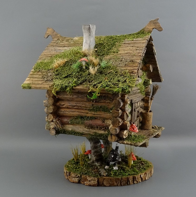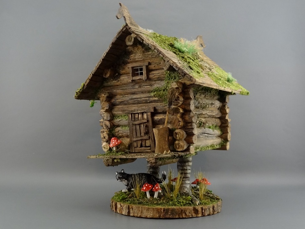 Отличная Баба-ёжкина избушка, выполнена замечательно! Но вот котик крупноват, если сравнивать его с размером двери и бабкиной ступы, просто пантера какая то.