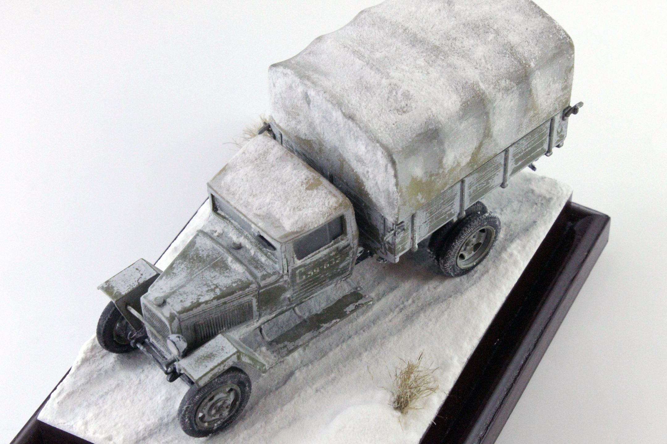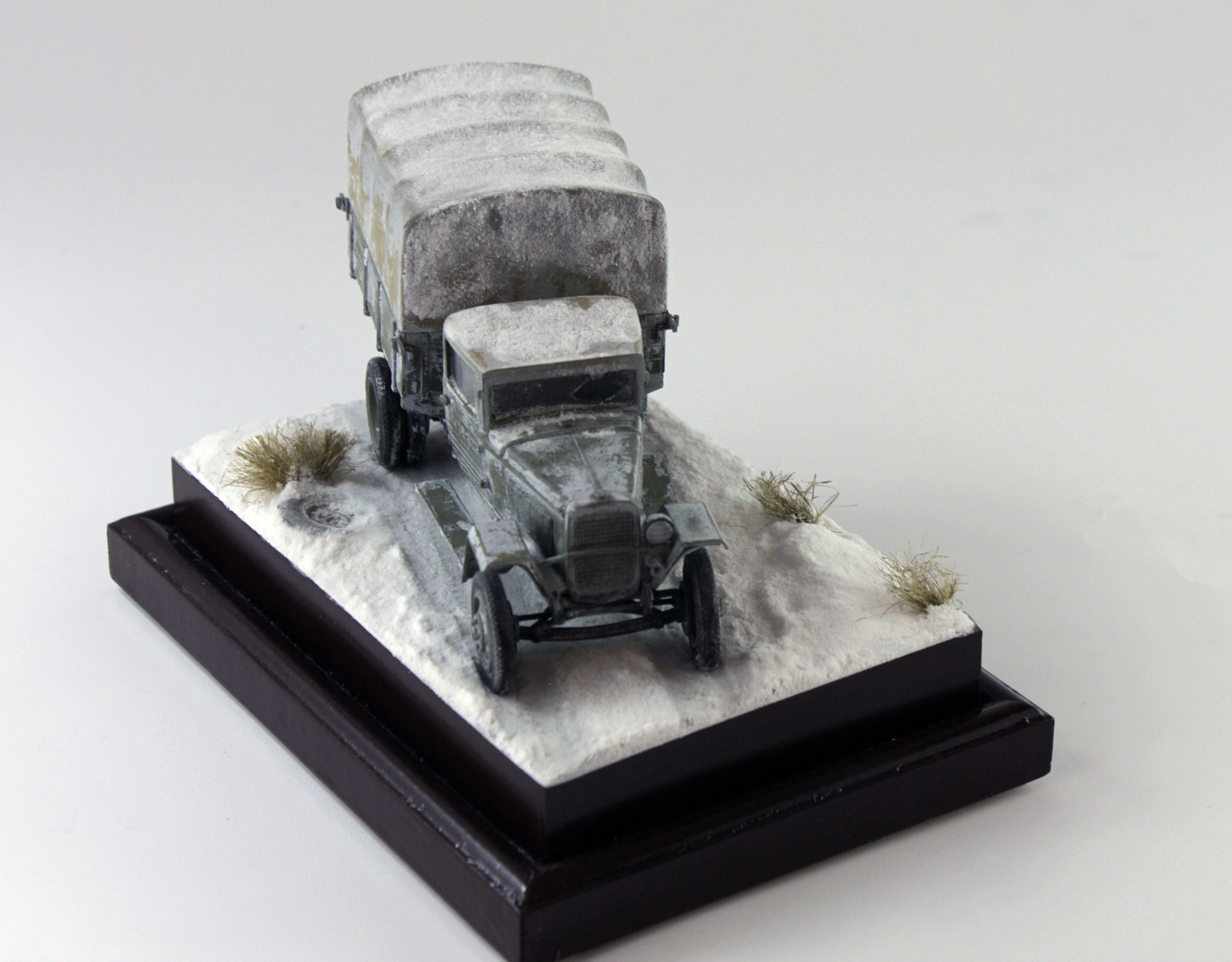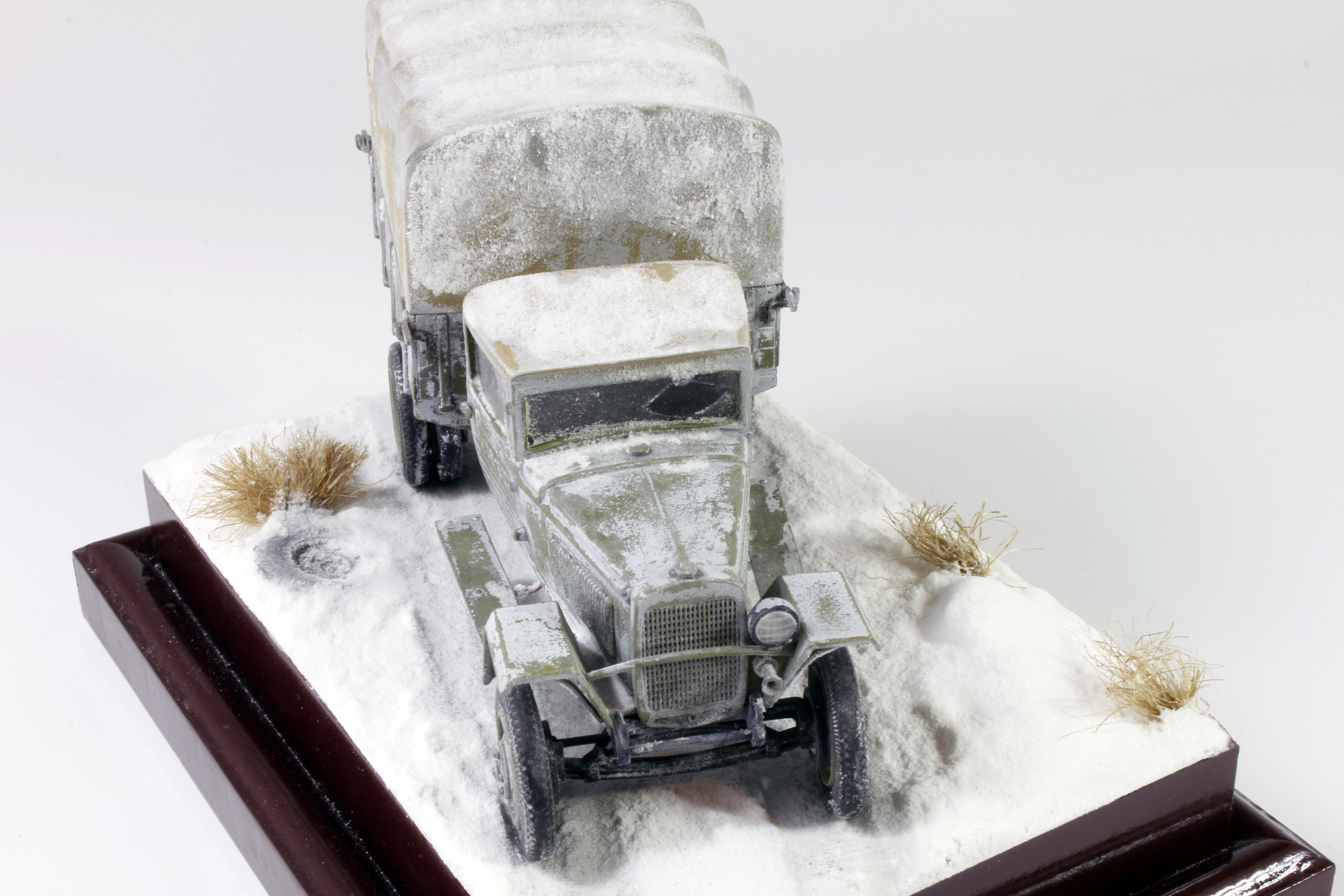 Спасибо, уважаемые. Снег делал по старой технологии: обмазал гипсовое основание ПВА, затем посыпал пищевой содой, после высыхания задул белым цветом, немного добавил в краску глянцевого лака.