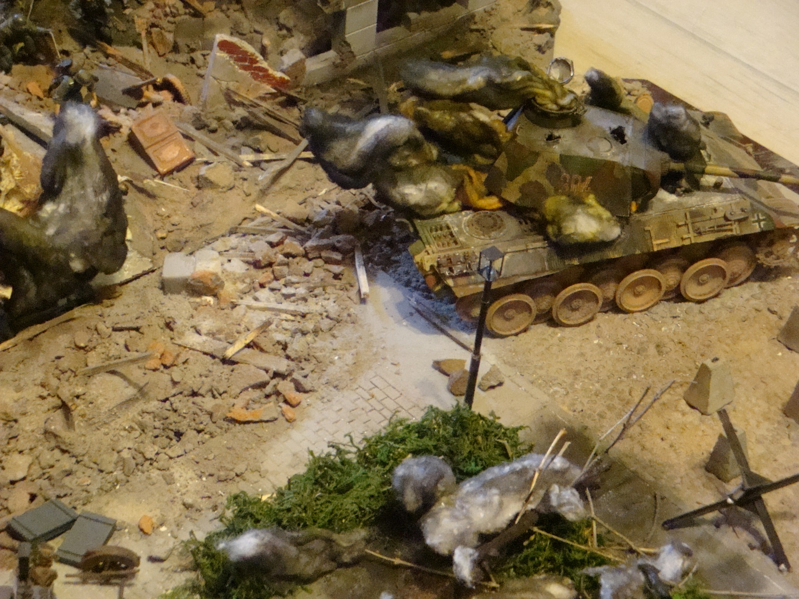 Хаос в строениях понравился, но только то, что относится к разрушениям. Большие диорамы всегда сложнее делать из-за объёма и последующим фотографированием. Техника на диорамах как бы вторична, особенно в больших диорамах, так во всяком случае думают многие моделисты, не говоря уж о киношниках. Но... это не снимает с авторов "ответственности" за происходящее на поле сражения, поэтому больше уделяйте технике на диорамах. Она ведь очень крупная мелочёвка!!! Удачи!!! Думаю, всё у Вас получится. Не используйте старые или первоначальные модели в своих будущих диорамах, если до этого они как бы и не к месту...