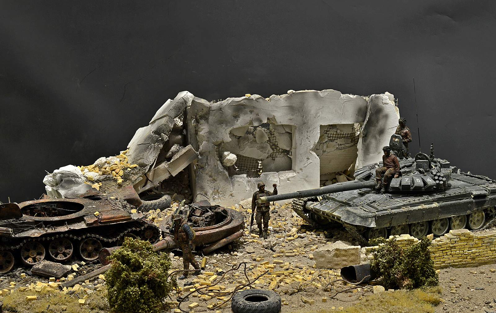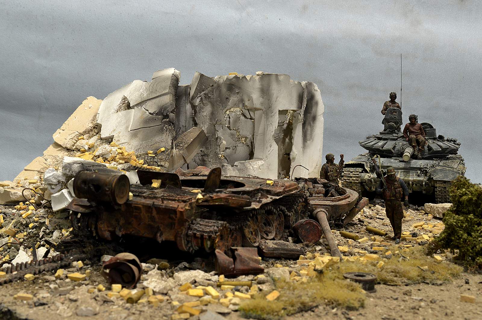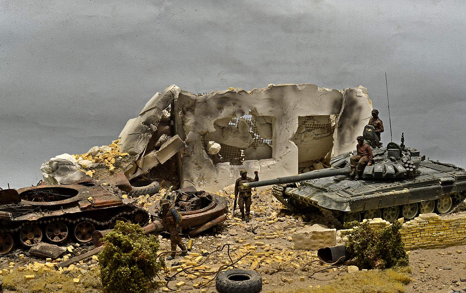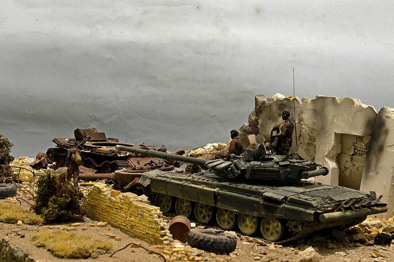 Ну я как ток "погорельца" увидал, так сразу понял, кто автор! Круто, что сказать. Единственный мелкий "придиризЬм" - слишком чистый силуэт "семьдесятдвойки". Сирийцы, конечно не американцы и не сомалийцы, но барахла на танк нагрузить тоже обожают. Ковёр, матрасы, ящики, бочки с водой, чайники, кастрюли - да что угодно на корму накидать - ошибки не будет.