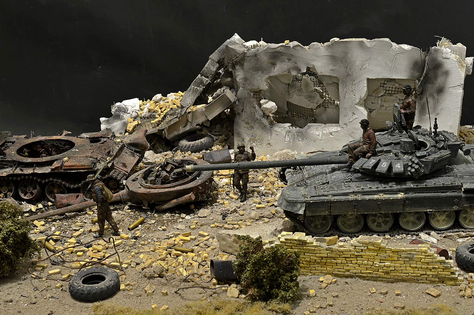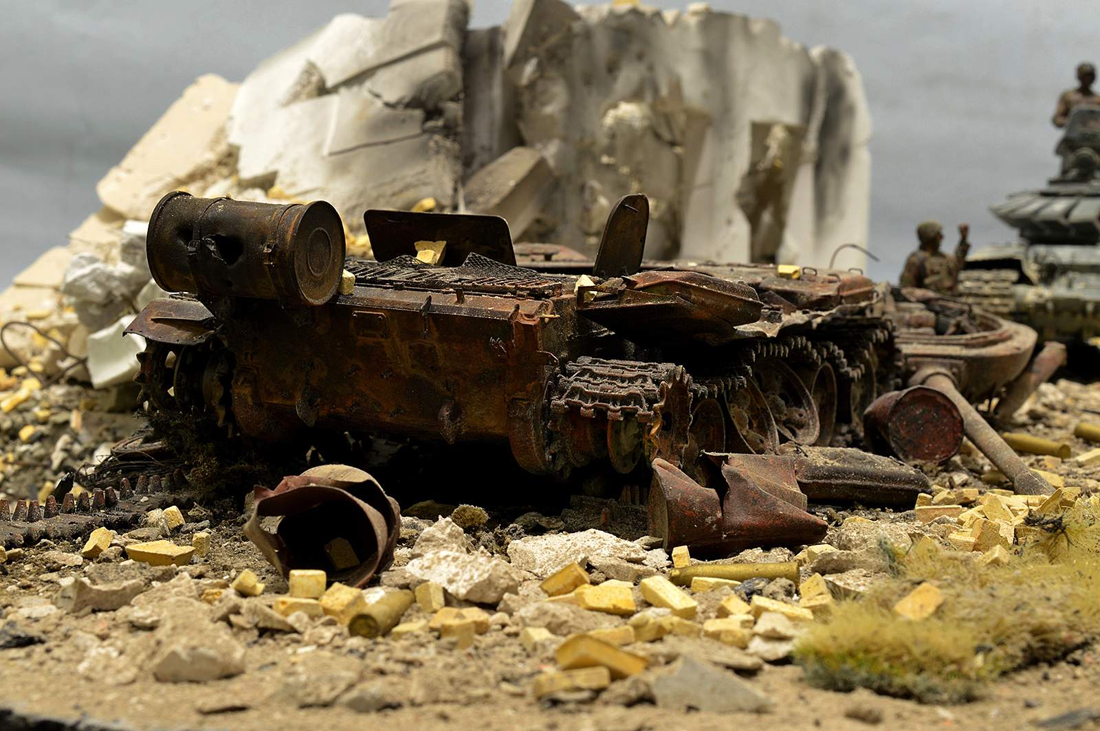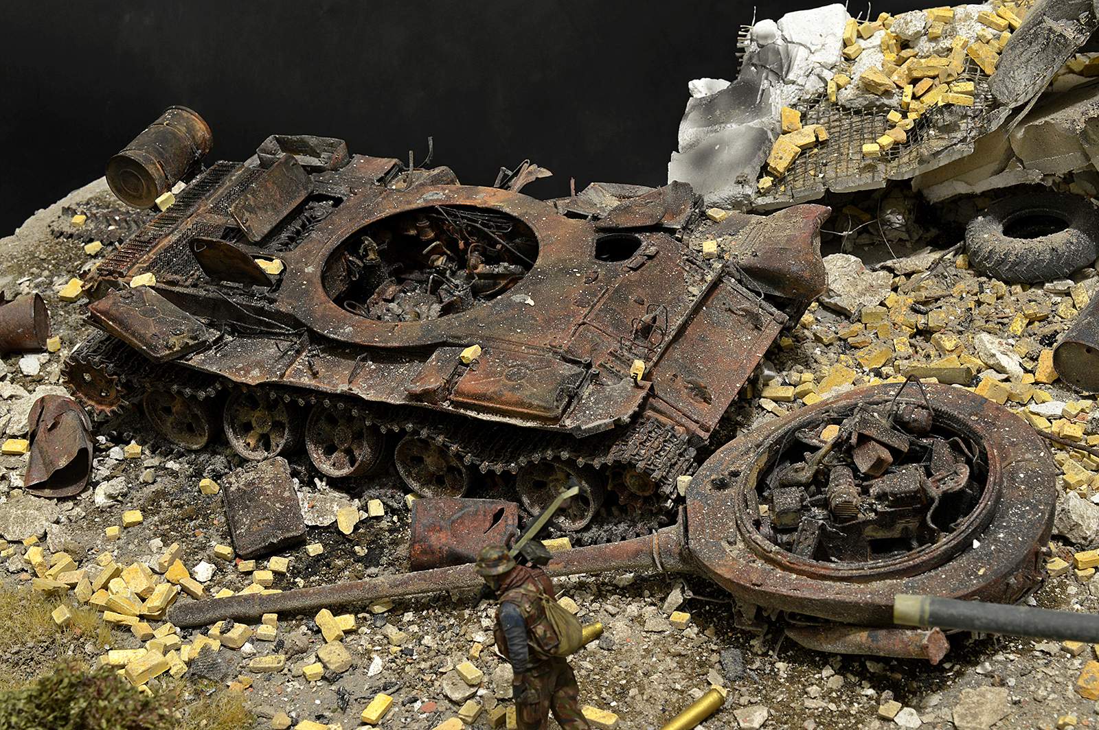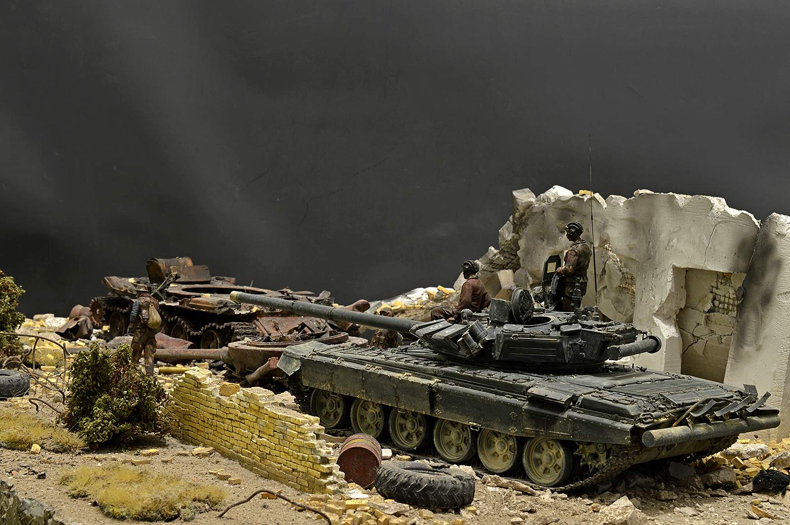 Ну я как ток "погорельца" увидал, так сразу понял, кто автор! Круто, что сказать. Единственный мелкий "придиризЬм" - слишком чистый силуэт "семьдесятдвойки". Сирийцы, конечно не американцы и не сомалийцы, но барахла на танк нагрузить тоже обожают. Ковёр, матрасы, ящики, бочки с водой, чайники, кастрюли - да что угодно на корму накидать - ошибки не будет.