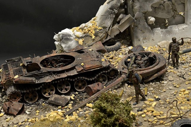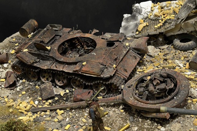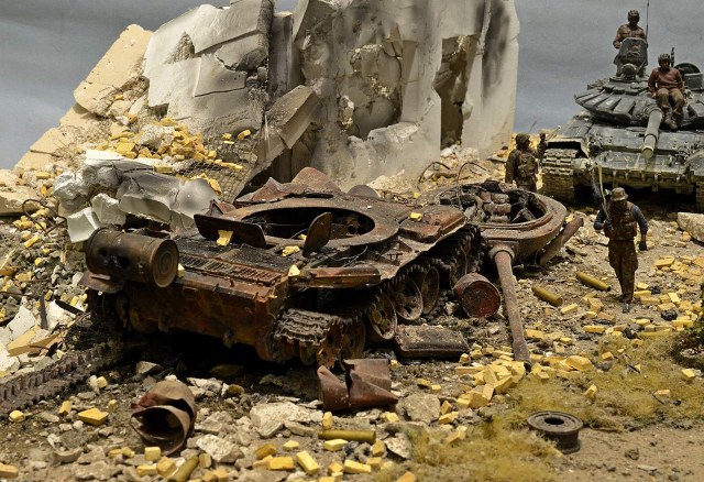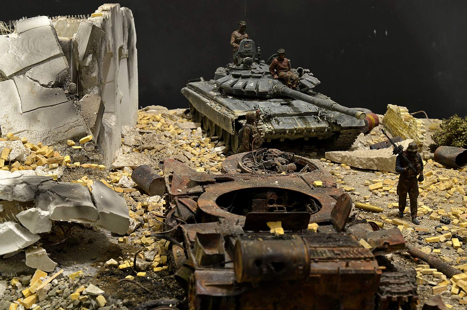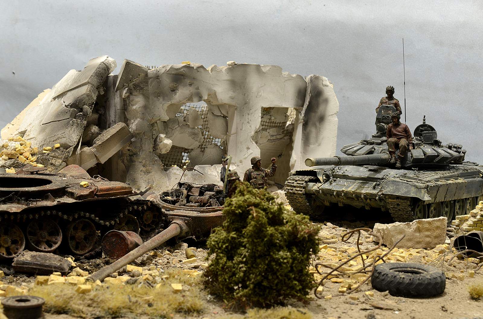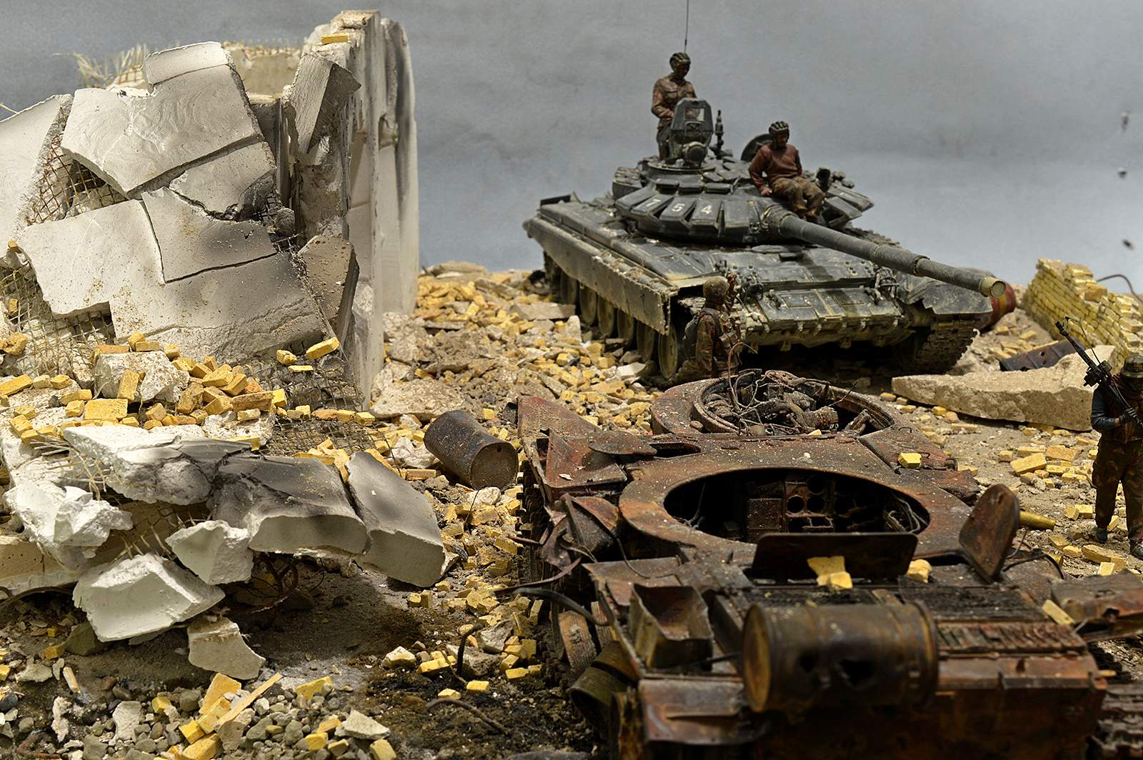 Ну я как ток "погорельца" увидал, так сразу понял, кто автор! Круто, что сказать. Единственный мелкий "придиризЬм" - слишком чистый силуэт "семьдесятдвойки". Сирийцы, конечно не американцы и не сомалийцы, но барахла на танк нагрузить тоже обожают. Ковёр, матрасы, ящики, бочки с водой, чайники, кастрюли - да что угодно на корму накидать - ошибки не будет.
