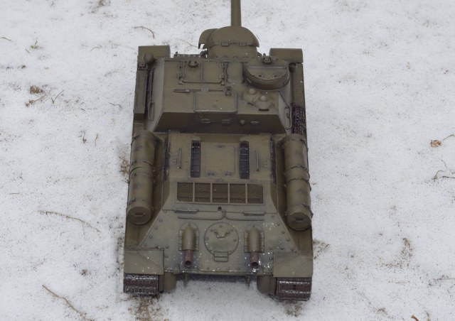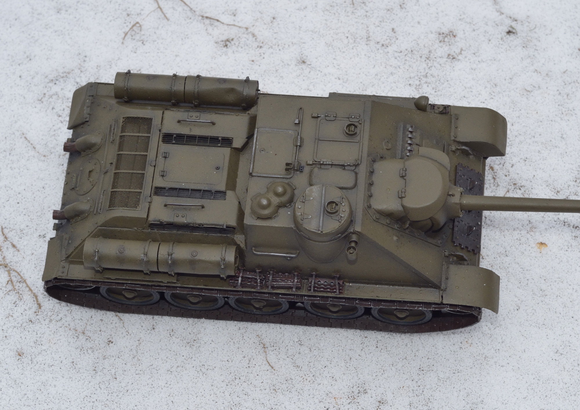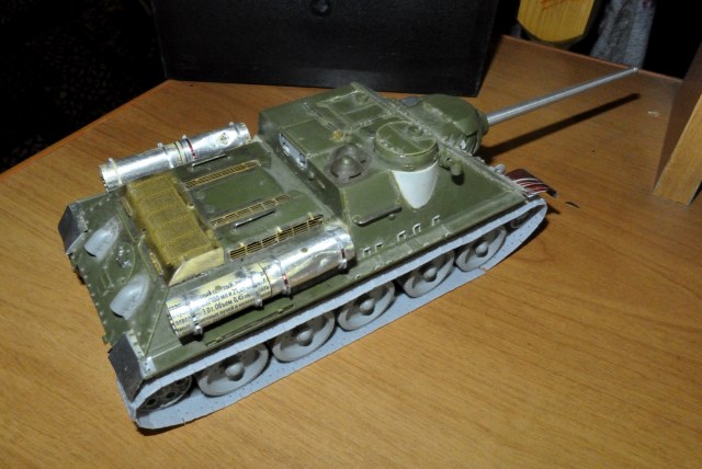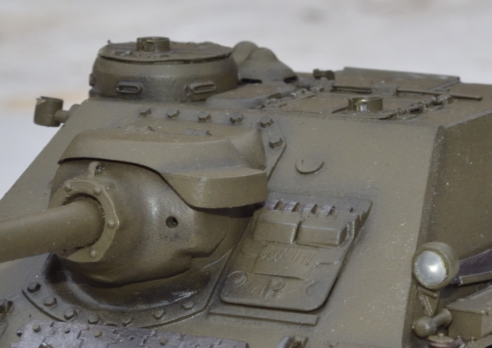 В качестве прототипа был избран один из первых образцов машины по фотографии с испытаний. Отсюда большое количество деталей и инженерных решений с Су -85. Некоторые спорные моменты (как например проточки под болты на боковой поверхности орудийной маски) я так и не разрешил и сделал... как сделал. Окраска с тусклым блеском - как и на фото реальной машины (возможно машина на этом фото мокрая).