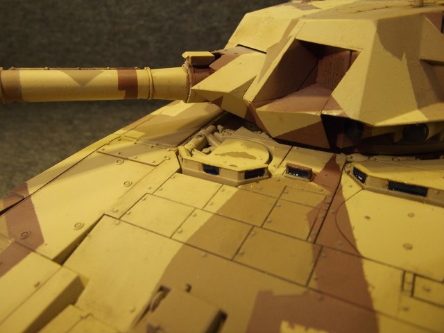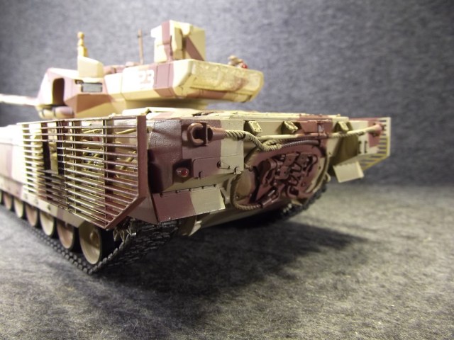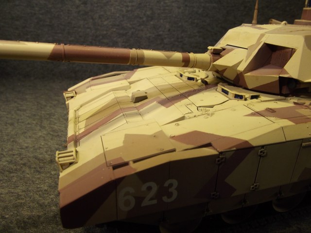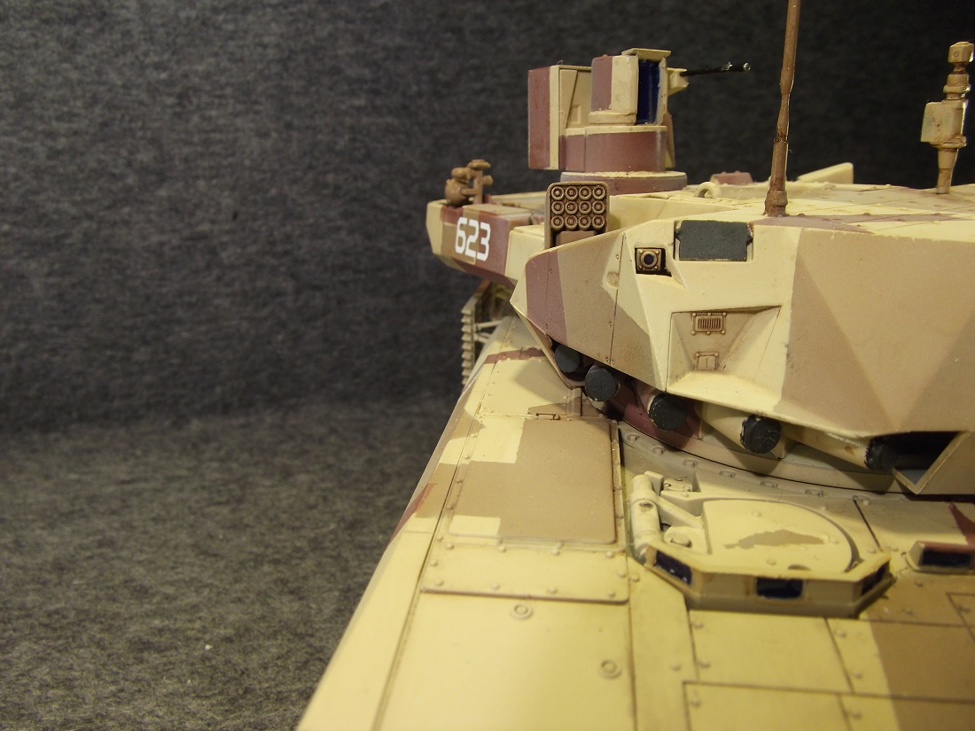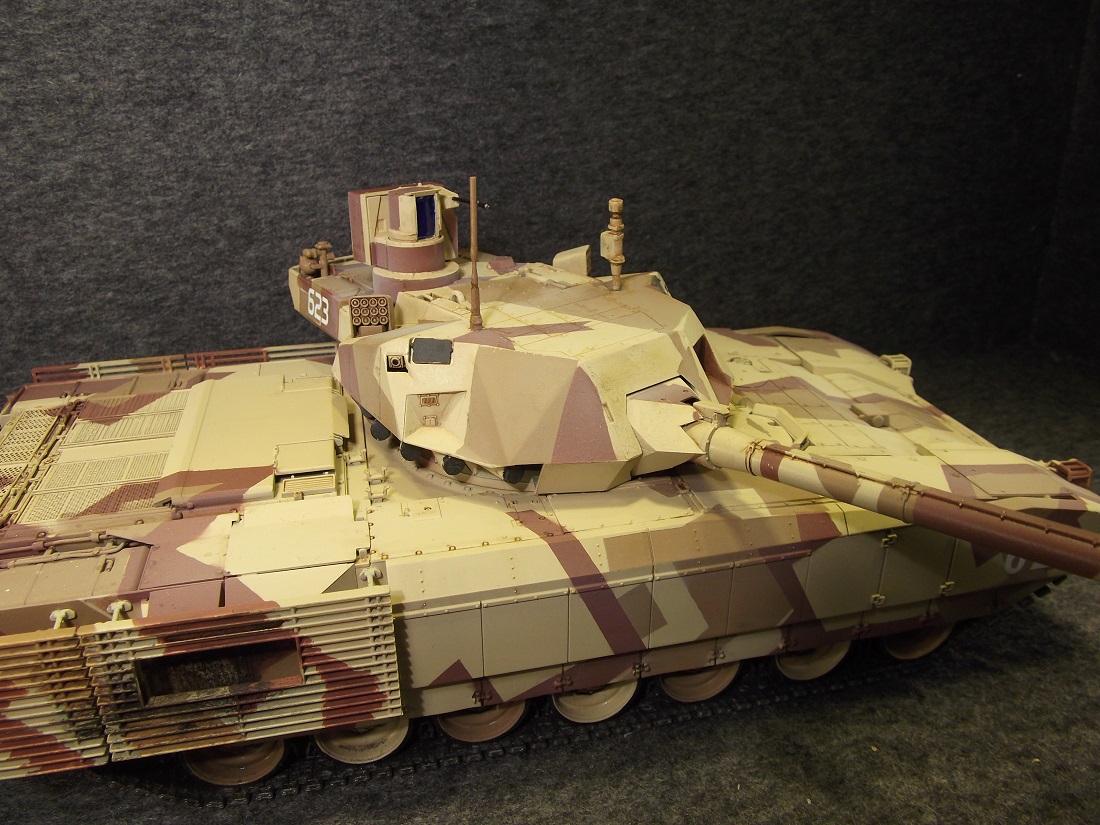 Влад, почему пулемёт "жёлтый"... Видеокамеры также закрашены. Что с оптикой (триплексами)? Видимо в работе был сделан акцент на покраске, но этого мало - оптика и мелочёвка страдают; явно не хватает смывки. Границы цветов камуфляжа в некоторых местах отработаны не аккуратно. Фотографии все "сверху-вниз", многие повторяются (по ракурсу) - ходовую не разглядеть, корму башни также. В целом работа удовлетворительная и не более.