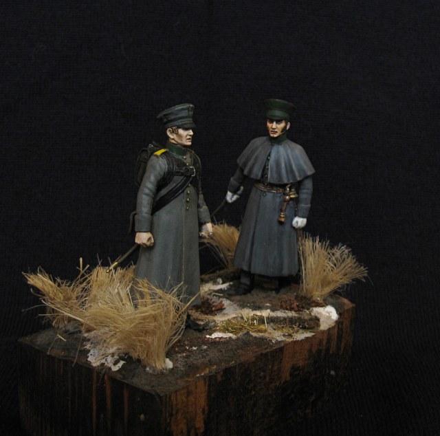 Здравствуйте. Крайняя работа, представлены - строевой обер-офицер и нестроевой унтер-офицер егерьских полков (старший в бригаде). Акрил,эмаль, чуть масло.