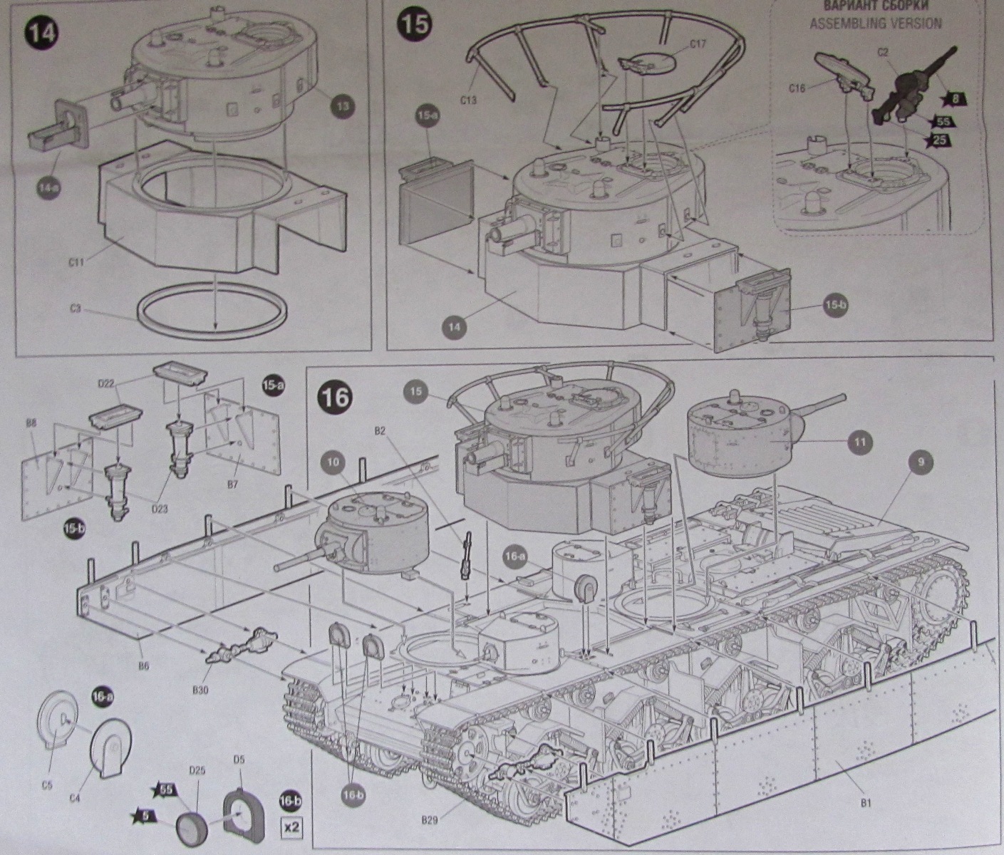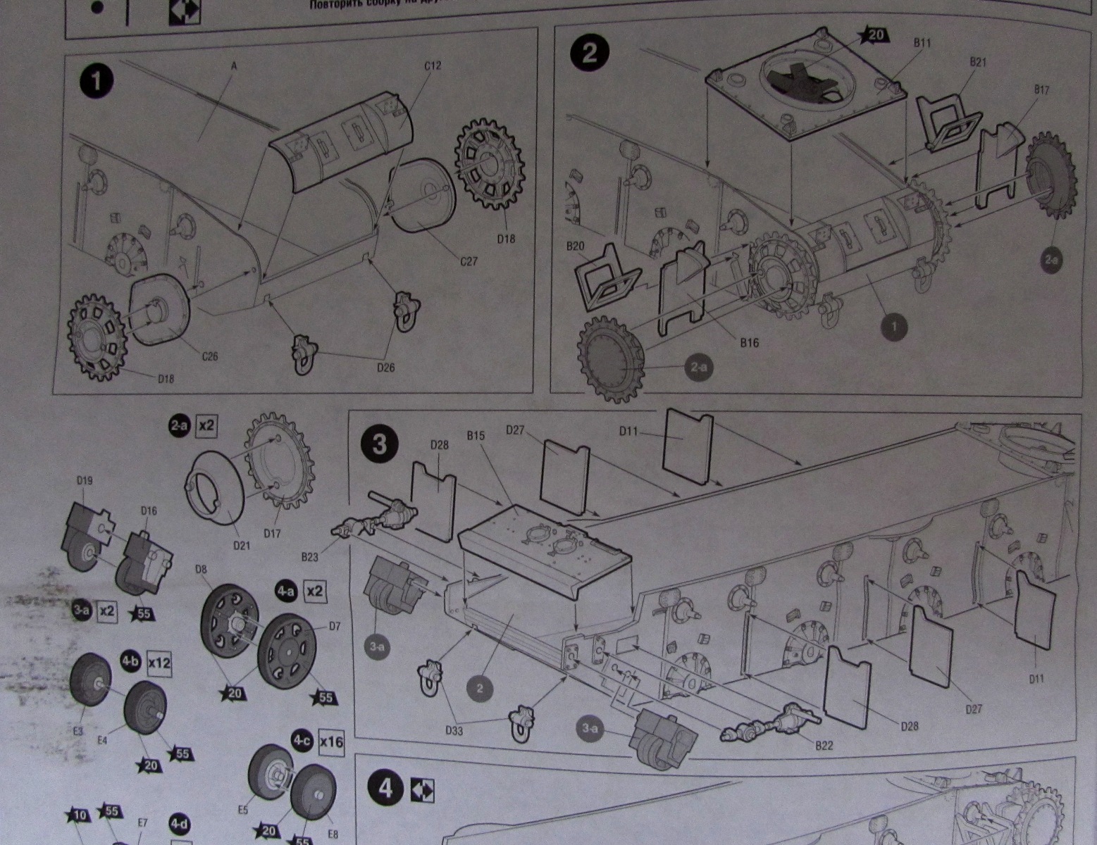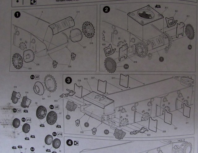 Инструкция стандартная для Звезды, причем довольно небольшого размера. Кстати, вопрос к ней есть. Может, я был немного невнимателен - но у меня создалось впечатление, что в инструкции перепутаны детали В28/В31 и В20/В21. Если я ошибся - пожалуйста, поправьте.
