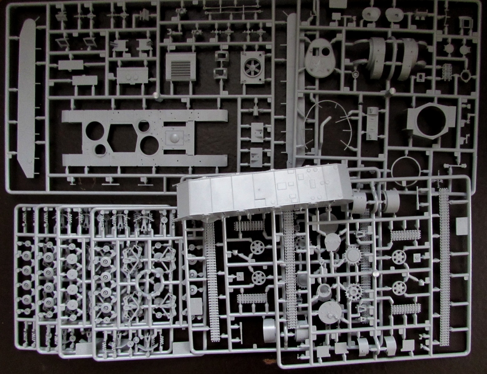 Надо сказать, фирма по инструкции советует крепить экраны лишь в самом конце. Однако, учитывая количество точек их крепления к корпусу, делать это в конце будет проблематично. Также вряд ли вы будете собирать гусеницы в середине процесса. Поэтому возникает логичный вопрос - как будет легче? Отдельно. низ, отдельно верх + экраны? - проблематично. Я попробовал второй вариант: собрал отдельно низ, к низу же сразу прикрепил экраны - а отдельно собрал верх с малыми башенками. Таким образом, не возникнет проблем с креплением экранов, а единственной проблемой будет лишь скрепить низ и верх - а также подлезть и прокрасить бандажи.
